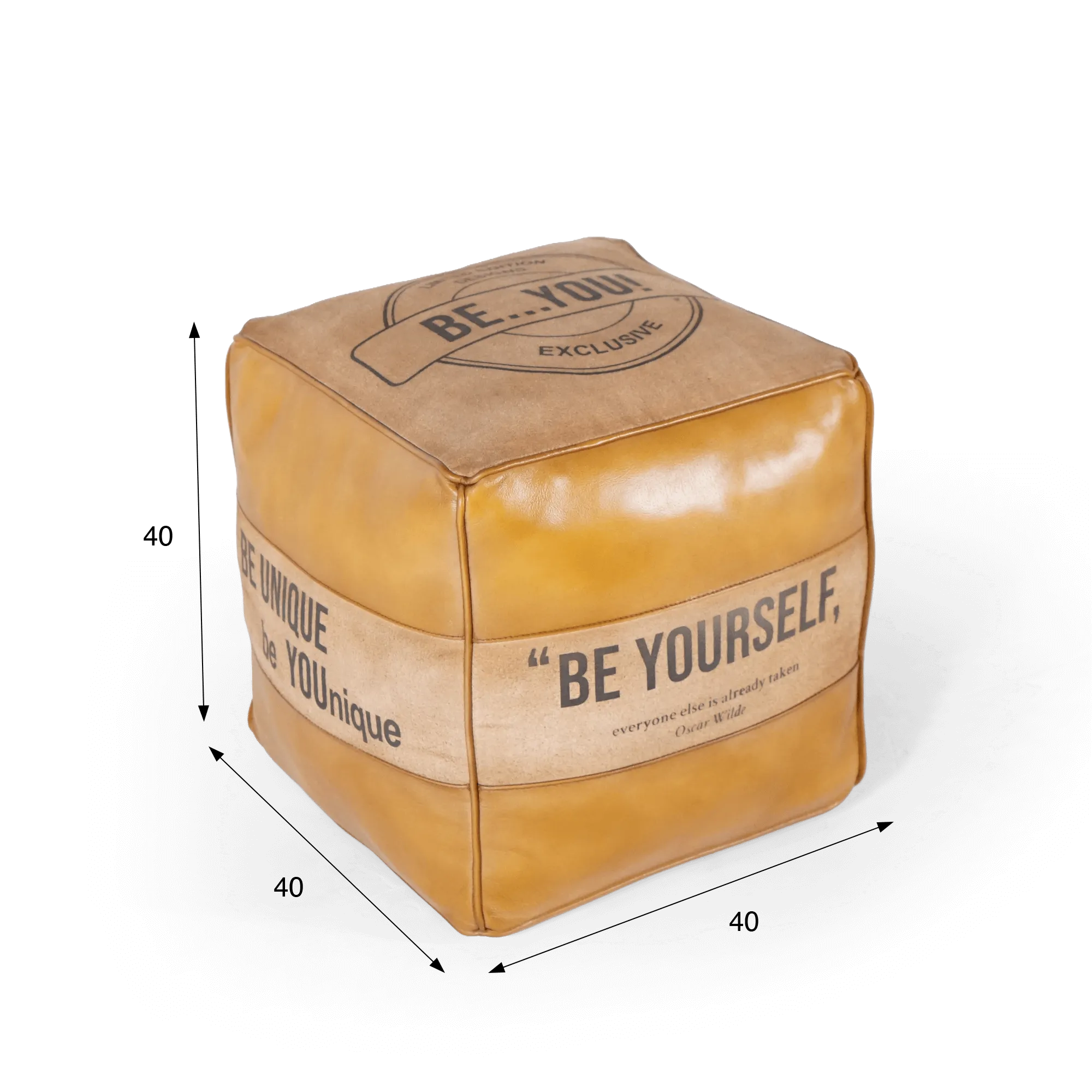 Laat je charmeren door onze poef van natuurlijk leer en stof "Be Yourself". Dit veelzijdige decoratieve object is ontworpen om je interieur te verfraaien met zijn industriële allure en inspirerende citaten, zoals die van Oscar Wilde: "Wees jezelf, de anderen zijn al bezet". Deze poef is een echte bron van dagelijkse inspiratie en belichaamt zelfvertrouwen en alledaags comfort.
