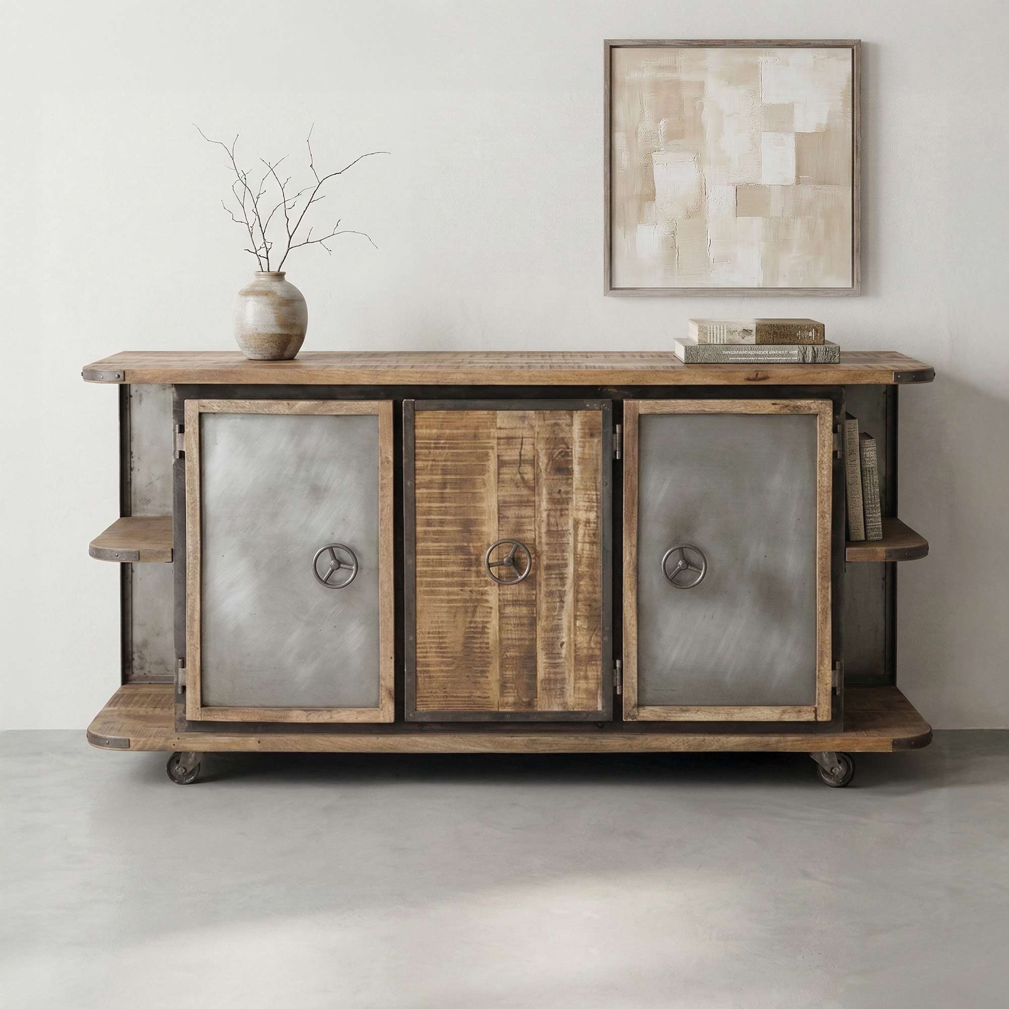Daarnaast behoudt deze dressoir duidelijk een industriële artisanale look met zijn zichtbare lasnaden en afwerkingen in metaal