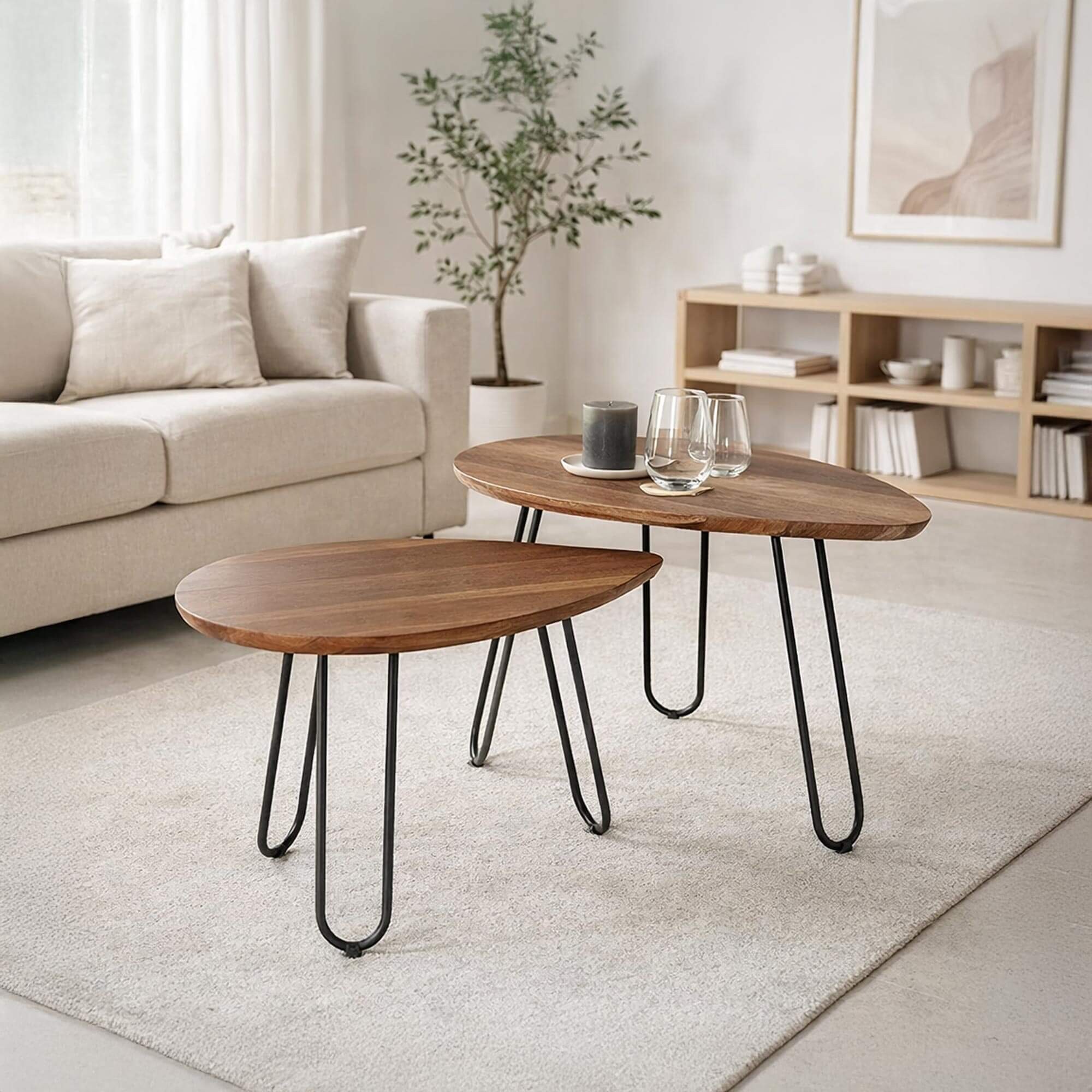 Het blad van deze Scandinavische salontafels in set, met een massief houten oppervlak van acacia en metalen onderstel, is een van de elementen waar we het meest trots op zijn. Elke tafel onthult de warme nuances en fijne nerven van deze duurzame houtsoort, gekozen om zijn stevigheid en zachte textuur. De bladen hebben zacht afgeronde lijnen met een licht driehoekige vorm: 60 cm lang en 42 cm breed voor de lagere tafel, 70 cm op 50 cm voor de hogere. Deze verhoudingen bieden een grote vrijheid in compositie en passen tegelijk moeiteloos in zowel een modern als een natuurlijk interieur.