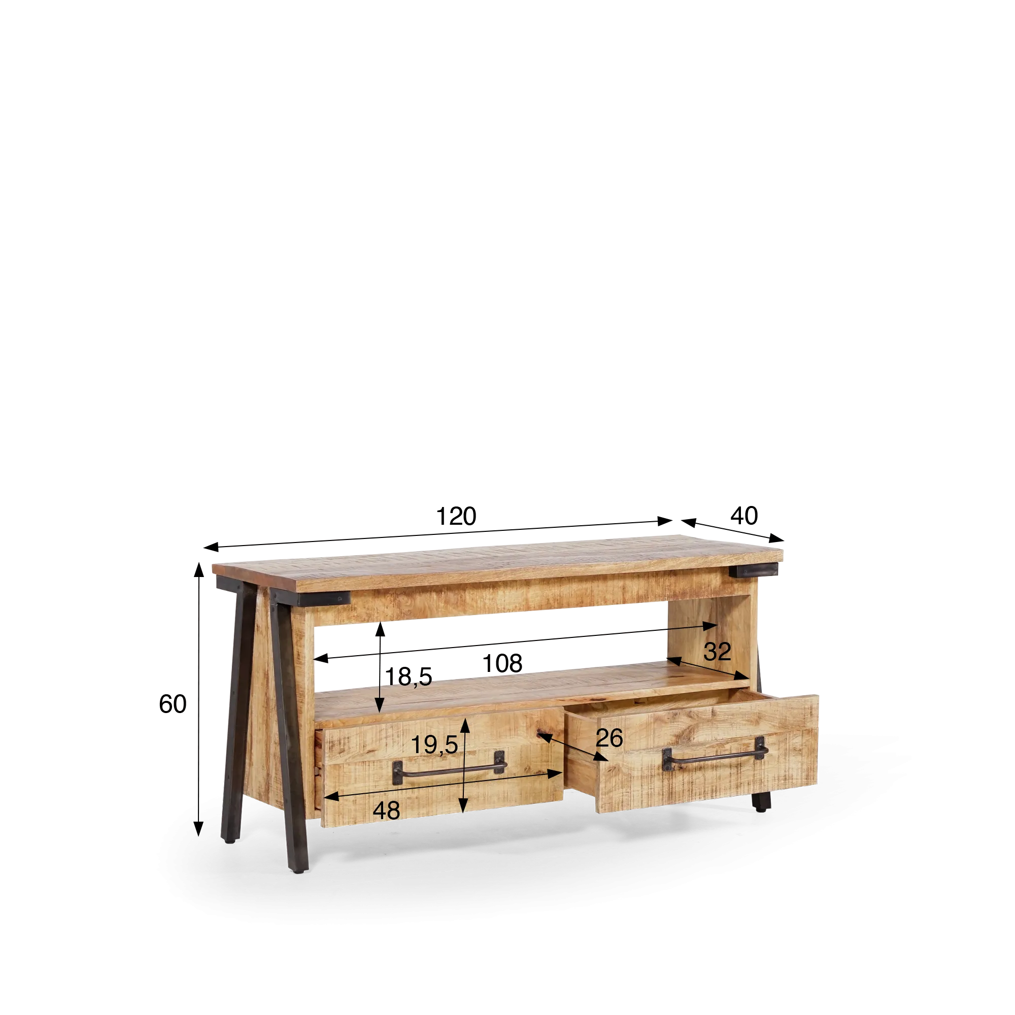 De retro-look wordt onderstreept door de toevoeging van handgrepen die doen denken aan de kantoormeubelen van architecten. Voor het hout, geen verrassing, een echte massieve mango hout, verluchtigd door het ontwerp om deze 120 cm lange metalen TV-meubel zijn letters van adel te geven.