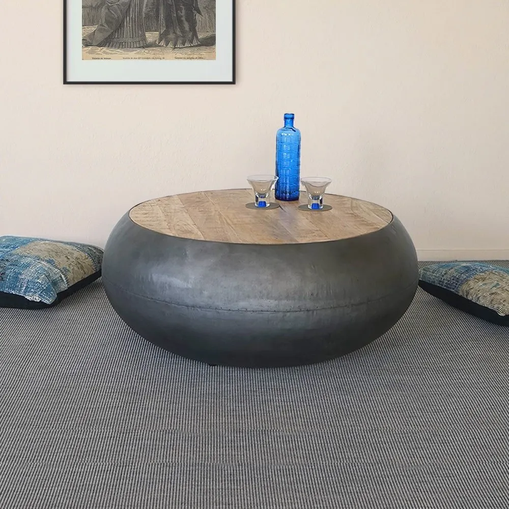 Ronde salontafel in massief hout en metaal in industriële stijl – Essential