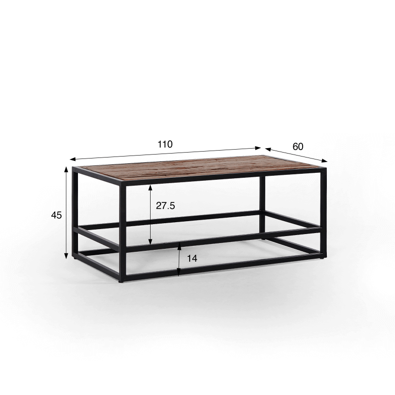 Deze rechthoekige salontafel van gerecycled hout is 110 cm lang, 45 cm hoog en 60 cm breed.