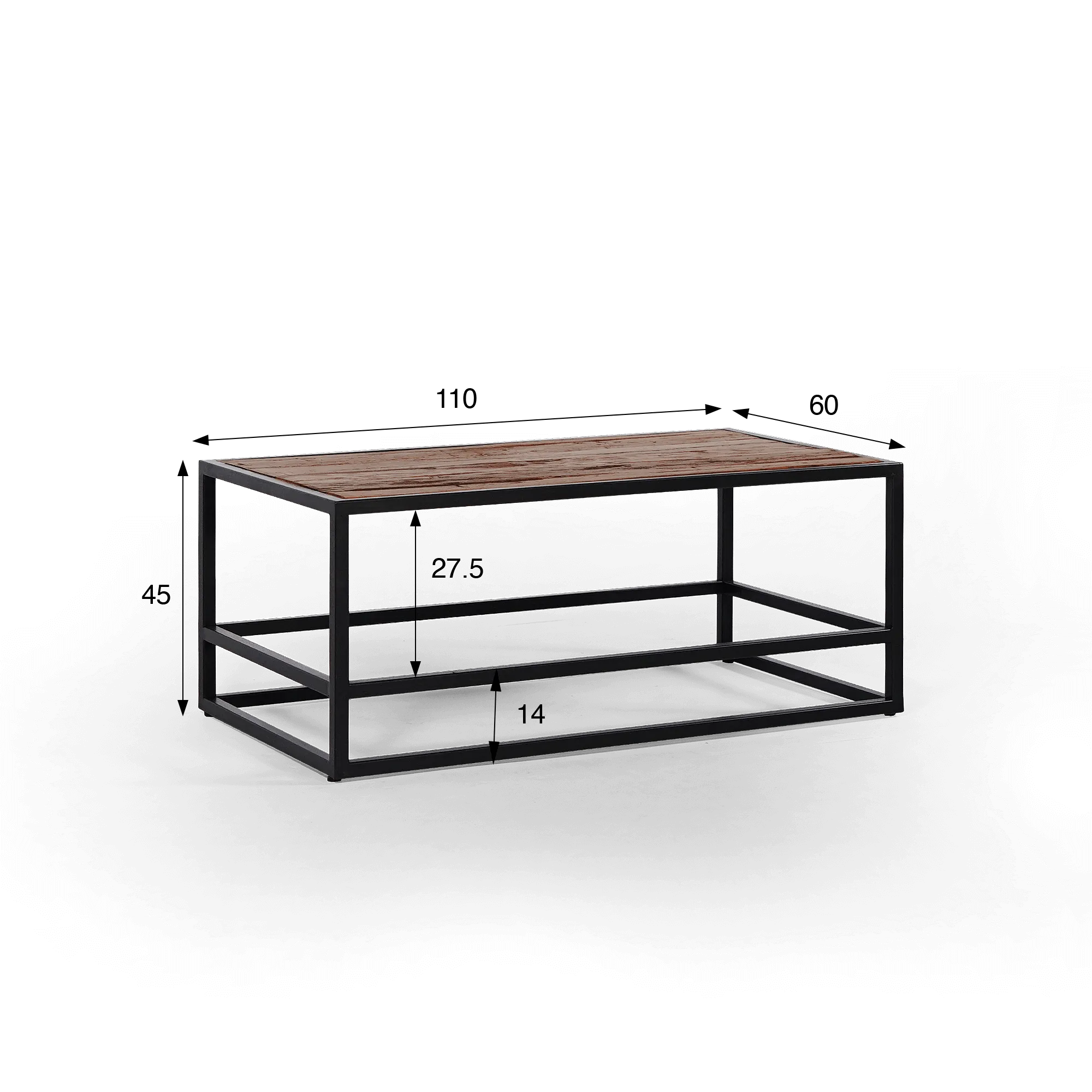 Deze salontafel met industrieel design heeft een volledig metalen frame met een zeer lineaire look, afgewerkt in zwart met een matte textuur. Daarbovenop komt een prachtig houten blad van gerecycleerde planken, allemaal met unieke tinten, reliëfs en rendering.