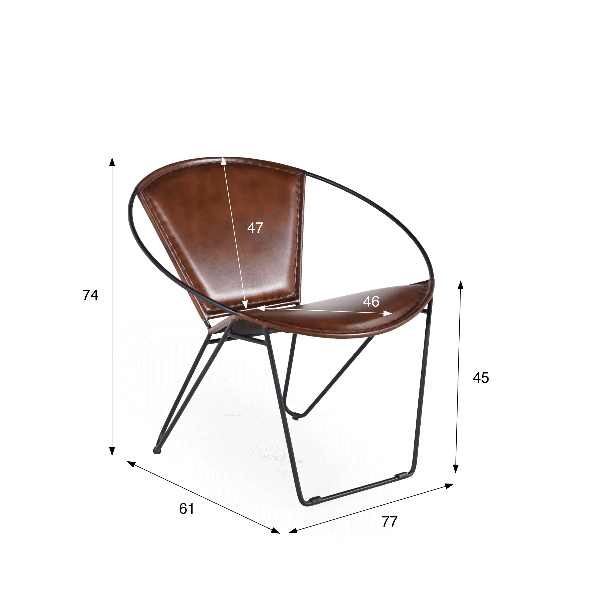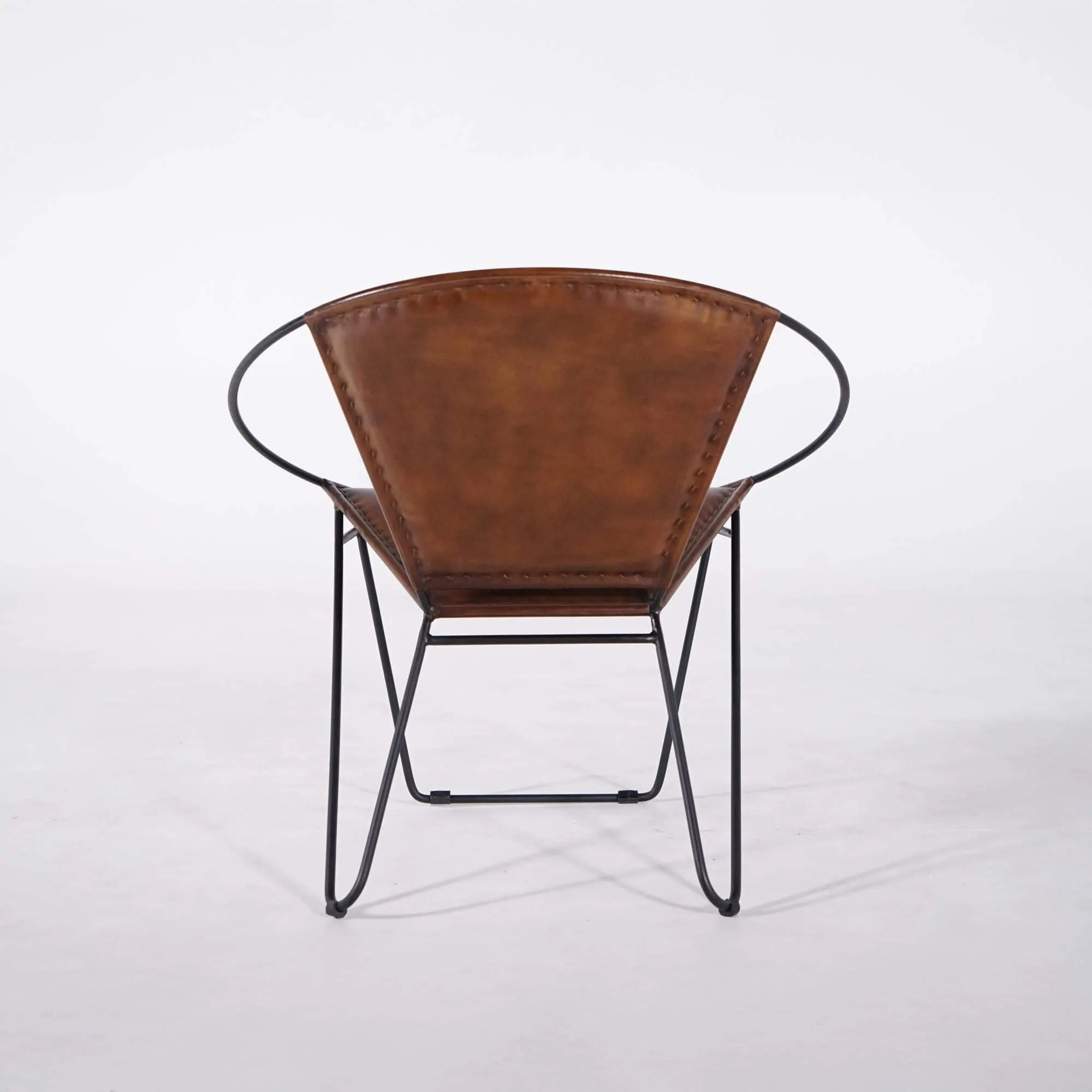 De zitting en rugleuning, ondersteund door een zwarte metalen ring, zijn gemaakt van het warme en edele materiaal buffelleer. De afwerking is zorgvuldig gedaan met verfijnde zichtbare naden.