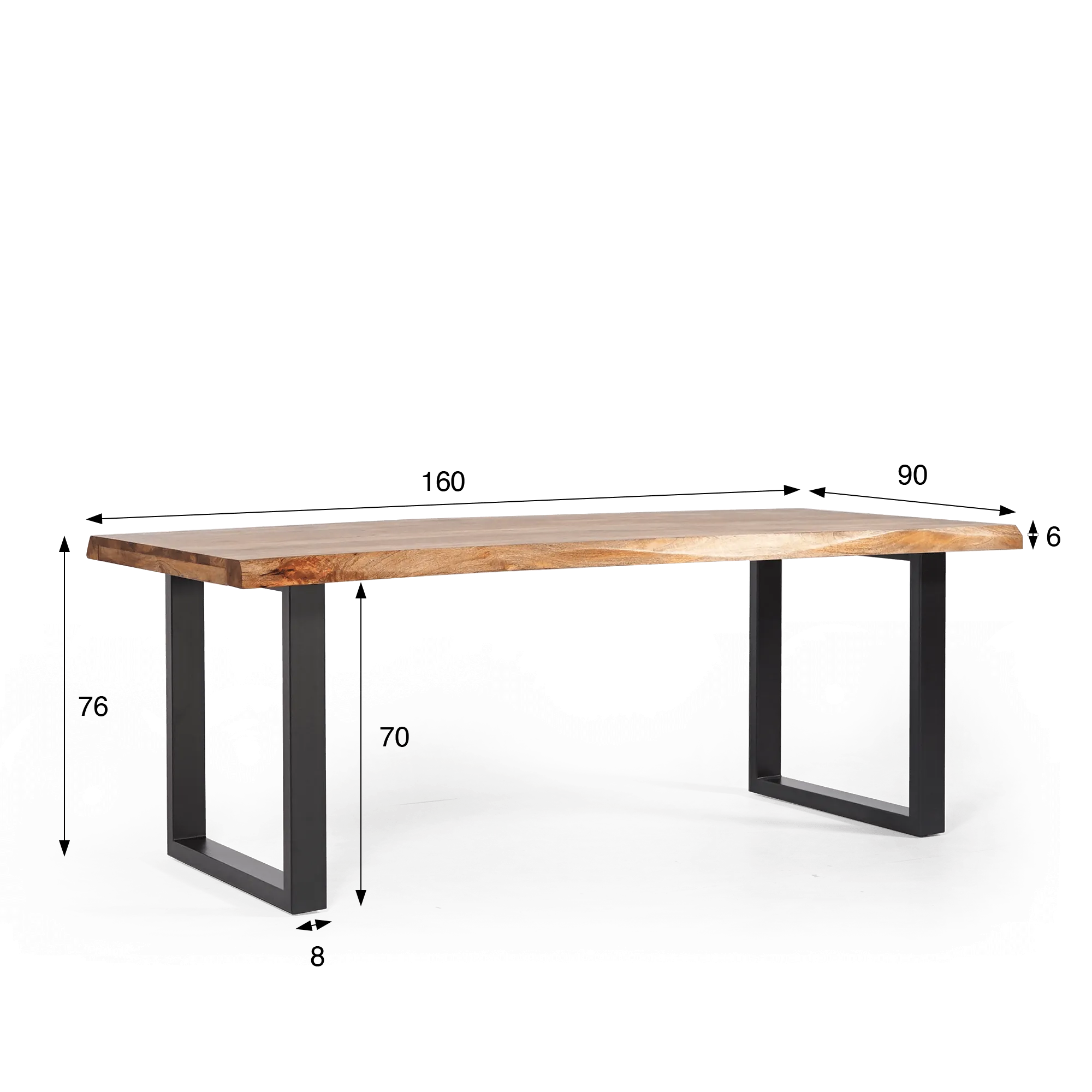 Wat deze tafel zo bijzonder maakt, zijn de zwart metalen poten die een sobere, functionele U-vorm vormen. Ze geven de tafel niet alleen een moderne toets, maar ook een opmerkelijke stabiliteit. Massief mangohout is hier de hoofdrolspeler en biedt een stevig, slijtvast oppervlak dat klaar is om de uitdagingen van het dagelijks leven aan te kunnen.