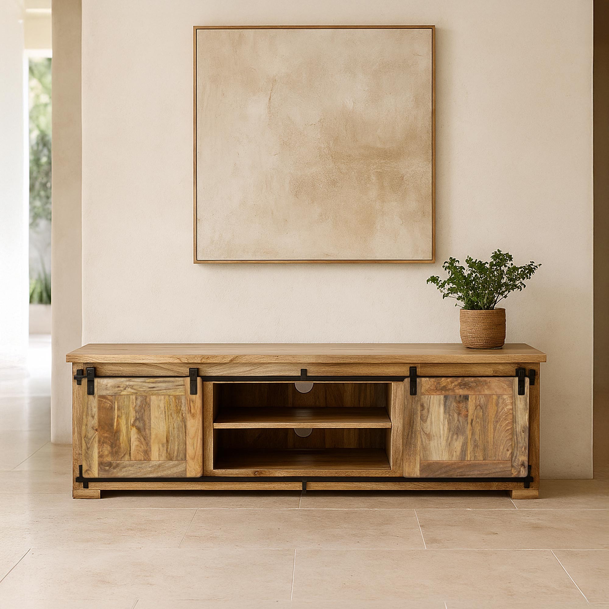 De uiteinden van het TV-meubel zijn voorzien van twee schuifdeuren die een ruime, open opbergruimte verbergen. Met deze deuren kun je elegant verbergen wat je wilt, terwijl je een netjes georganiseerde en esthetisch aangename ruimte creëert. Je kunt er je dvd's, videospelletjes of iets anders dat je uit het zicht wilt houden in opbergen.