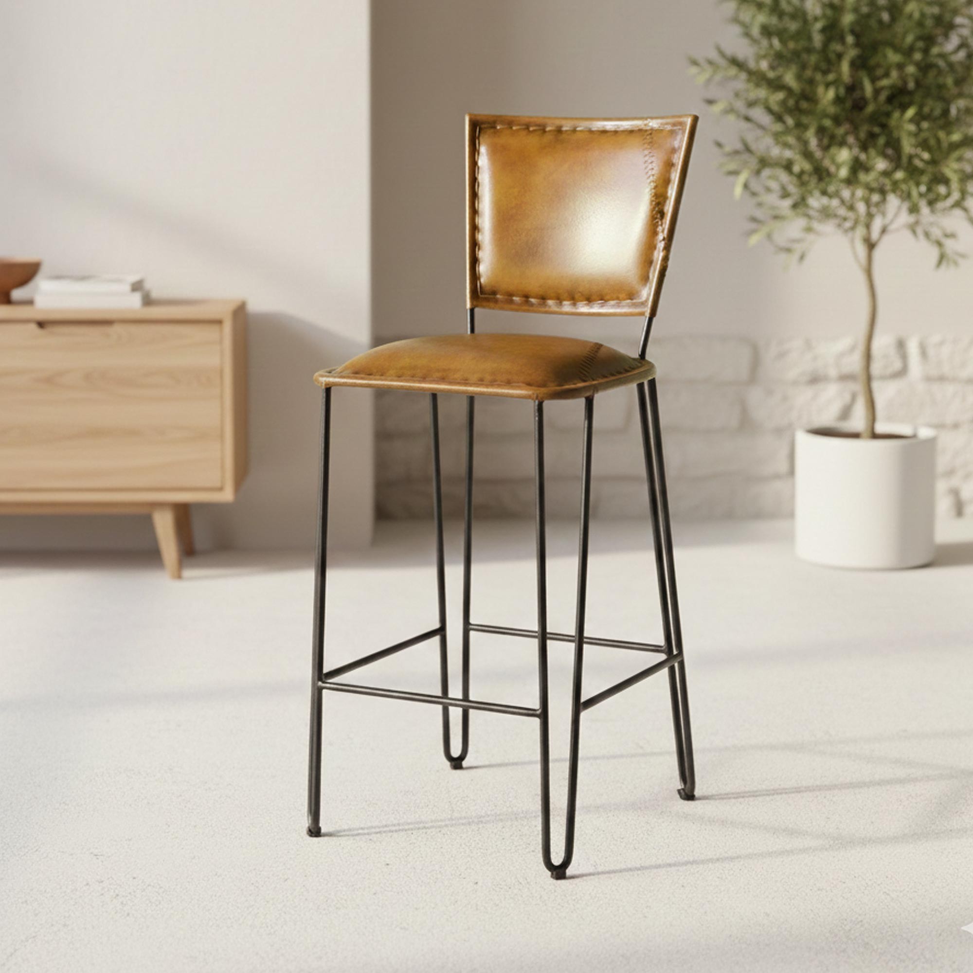 Deze vintage barstoel in echt leer is ontworpen om uw huis een chique en strakke toets te geven. De zwarte metalen poten geven deze stoel een retro en toch moderne uitstraling. De overstiksels in het leer versterken de retro-look, terwijl de slanke metalen poten de stoel een moderne toets geven.