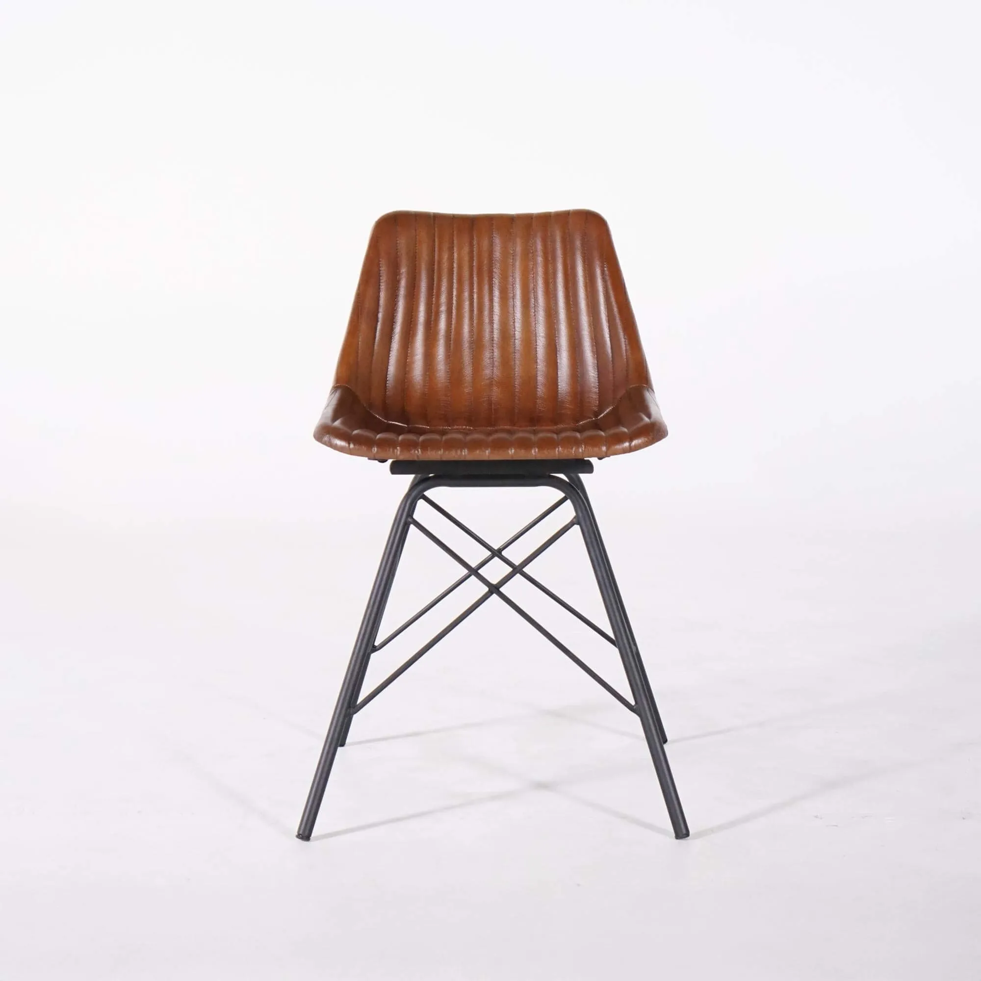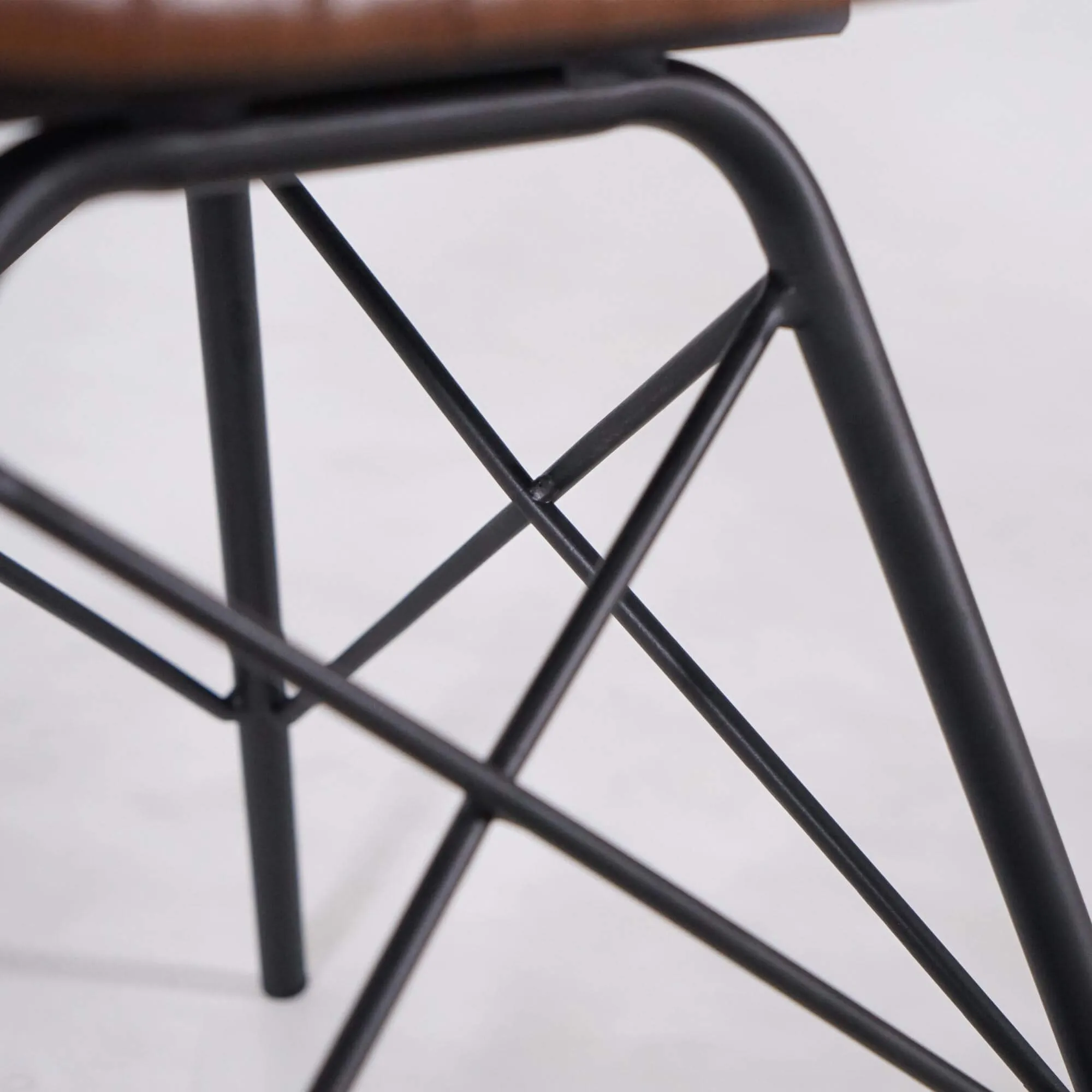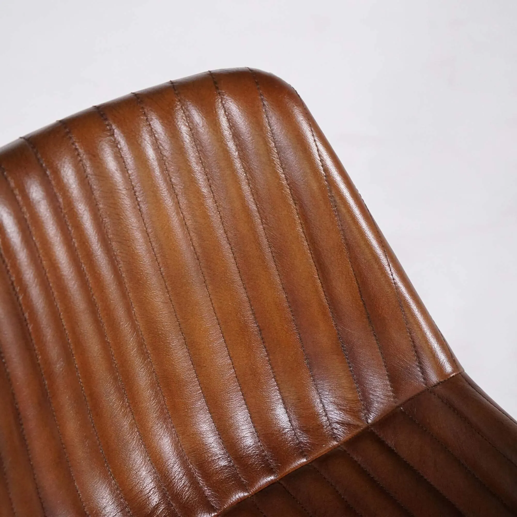De zitting, op 50 cm van de vloer, bestaat uit een stevige kuip, afgewerkt met een dunne laag comfortabele schuimvulling en bekleed met echt bruin leder. Bruin leder is erg geliefd in interieurdecoratie, omdat het makkelijk te combineren is in elke stijl. Eigentijds, industrieel, vintage of klassiek: ze vindt moeiteloos haar plaats, zonder smaakfout.