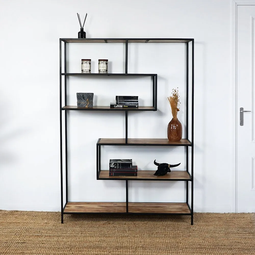 Met zijn asymmetrische lijnen is deze boekenkast zowel functioneel als esthetisch. Het voegt een moderne touch toe aan elke kamer en biedt een rustieke en ruwe stijl. Met een hoogte van 165 cm, een breedte van 110 cm en een diepte van 35 cm is het perfect gedimensioneerd om in elke ruimte te passen.