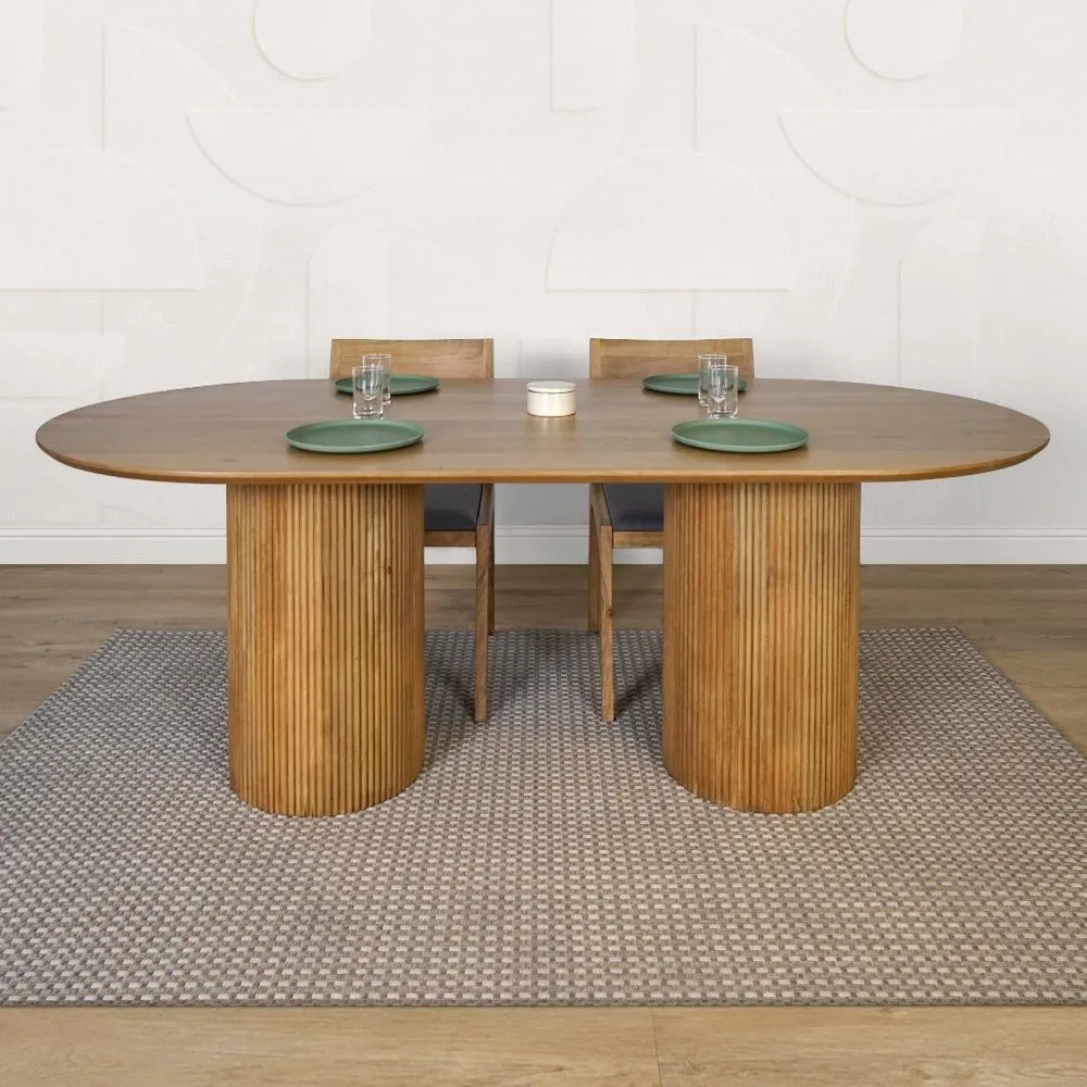 De "Thanais" tafel valt op door zijn elegante eenvoud, waarbij het massieve mangohout zorgvuldig is bewerkt. Het solide, geruststellende onderstel van de tafel valt op door de massief houten poten. Deze zijn fijn bewerkt met regelmatige golvingen, waardoor de tafel er zowel zacht als gestructureerd uitziet. Het ontwerp van de poten is niet alleen een esthetisch hoogstandje, het weerspiegelt ook vakmanschap, met veel aandacht voor elk detail om kwaliteit en precisie te garanderen.
