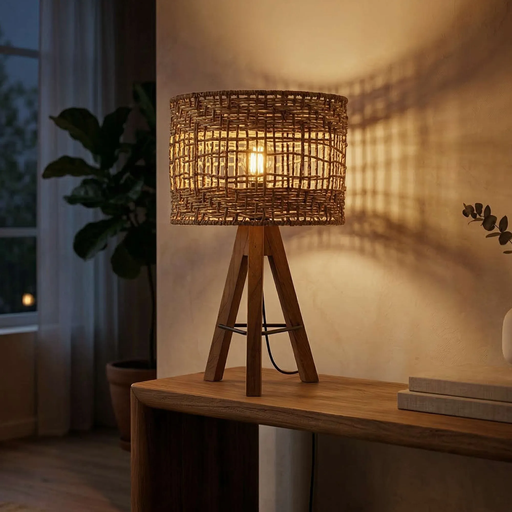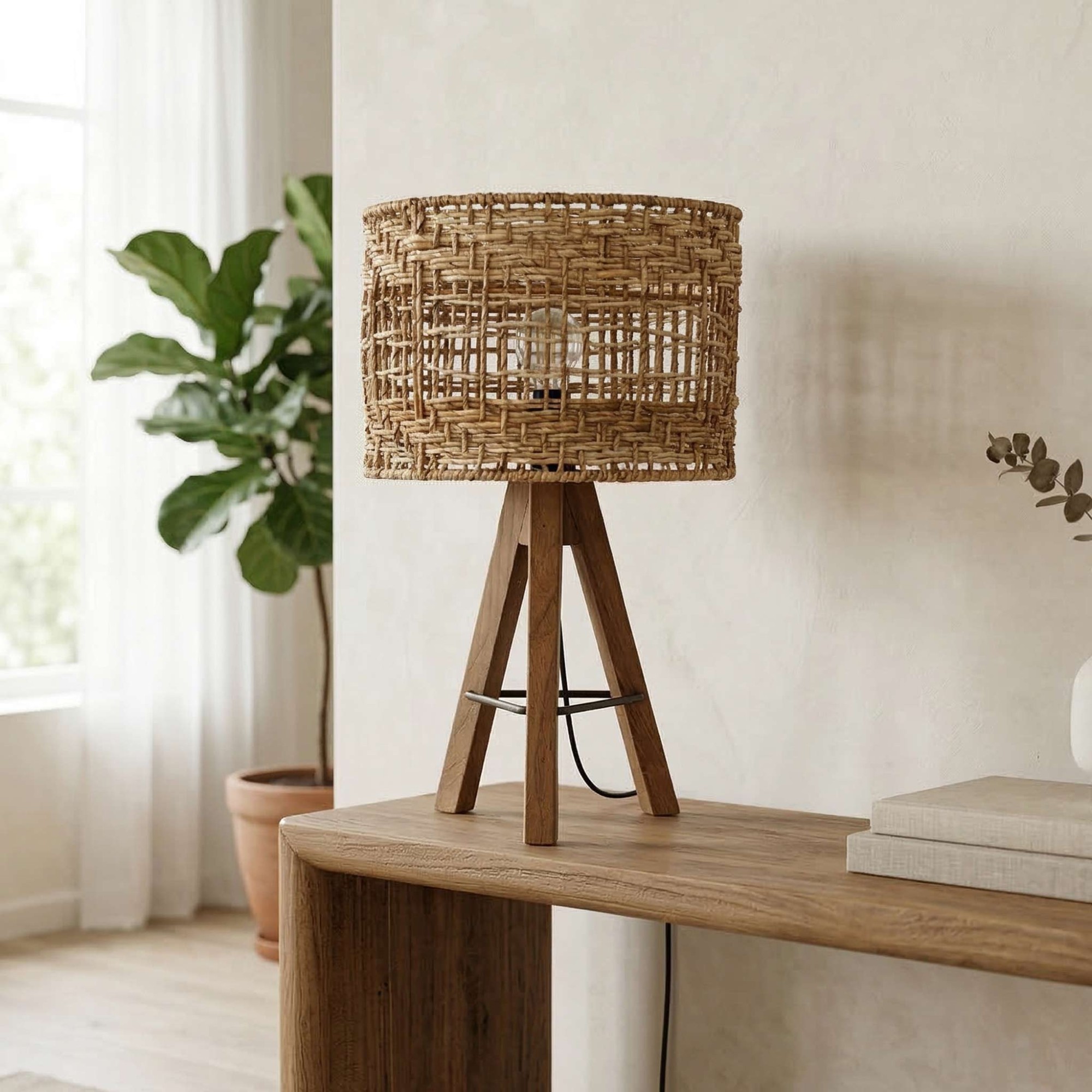 De geweven rotan kap onthult op subtiele wijze de lamp door het vlechtwerk en creëert een warme, rustgevende sfeer. De combinatie van de ruwe textuur van het hout en de lichtheid van het rotan geeft deze lamp een tijdloze charme die even goed past in moderne als in meer traditionele interieurs. De lamp is perfect in balans tussen handgemaakt ontwerp en functionaliteit en past gemakkelijk in een woonkamer, slaapkamer of werkruimte en voegt een natuurlijke, chique touch toe aan je inrichting.