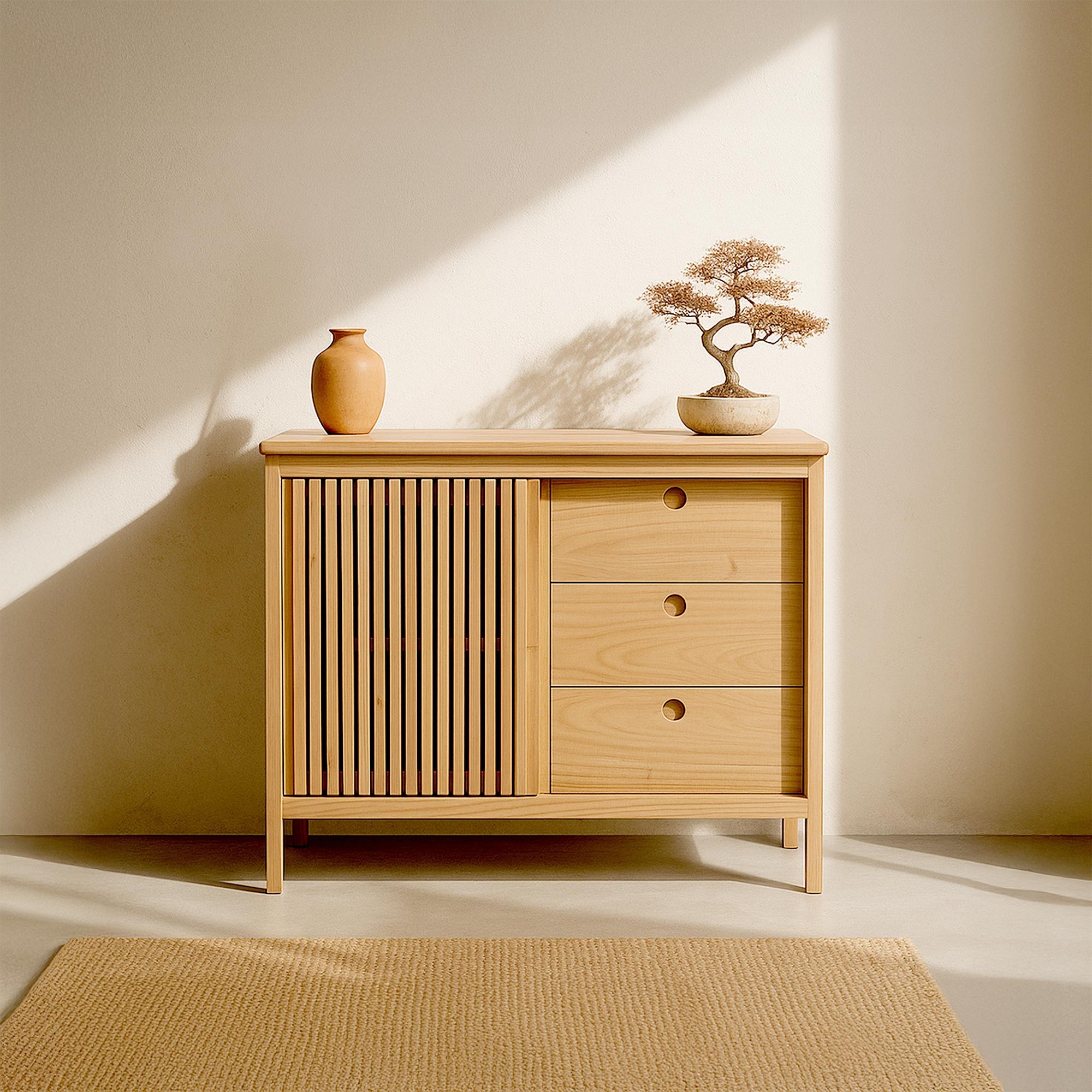 Elk detail is zorgvuldig overwogen om praktisch nut te combineren met sober, verfijnd design. Mindihout, geselecteerd om zijn degelijkheid en warme kleur, past harmonieus bij de slanke lijnen van dit meubel. De houten poten voegen een vleugje lichtheid toe en versterken de Scandinavische charme van dit dressoir, waardoor het gemakkelijk te integreren is in verschillende inrichtingsstijlen.