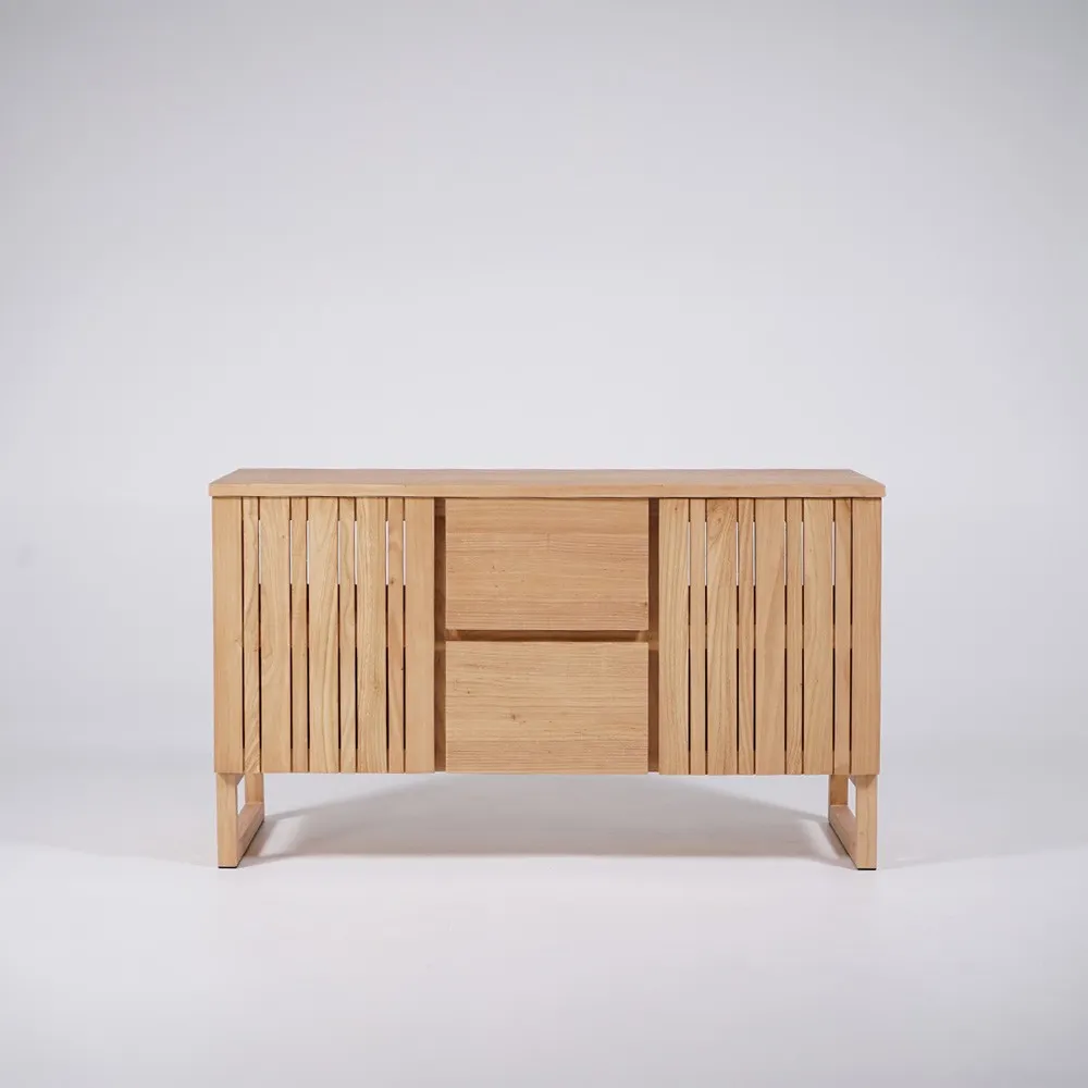 Dit meubelstuk is ontworpen om aan de eisen van het moderne leven te voldoen, terwijl het tegelijkertijd traditioneel vakmanschap uitstraalt. De twee scharnierende deuren, subtiel geperforeerd, verbergen royale, functionele opbergruimtes, perfect voor het organiseren van je toiletartikelen. In het midden bieden de twee lades gemakkelijk toegang tot je dagelijkse benodigdheden, terwijl ze een harmonieuze esthetiek behouden. Elk detail, van de onberispelijke afwerking tot de natuurlijke textuur van het hout, is zorgvuldig vervaardigd om duurzame kwaliteit te garanderen.