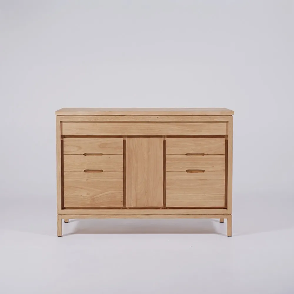Elk detail van het meubel is zorgvuldig doordacht. Het mindi hout, gekozen vanwege zijn robuustheid en mooie natuurlijke textuur, wordt versterkt door een onberispelijke afwerking die getuigt van vakmanschap. De discreet geïntegreerde handgrepen en elegant verhoogde poten versterken de strakke esthetiek en maken de vloer gemakkelijk schoon te maken.