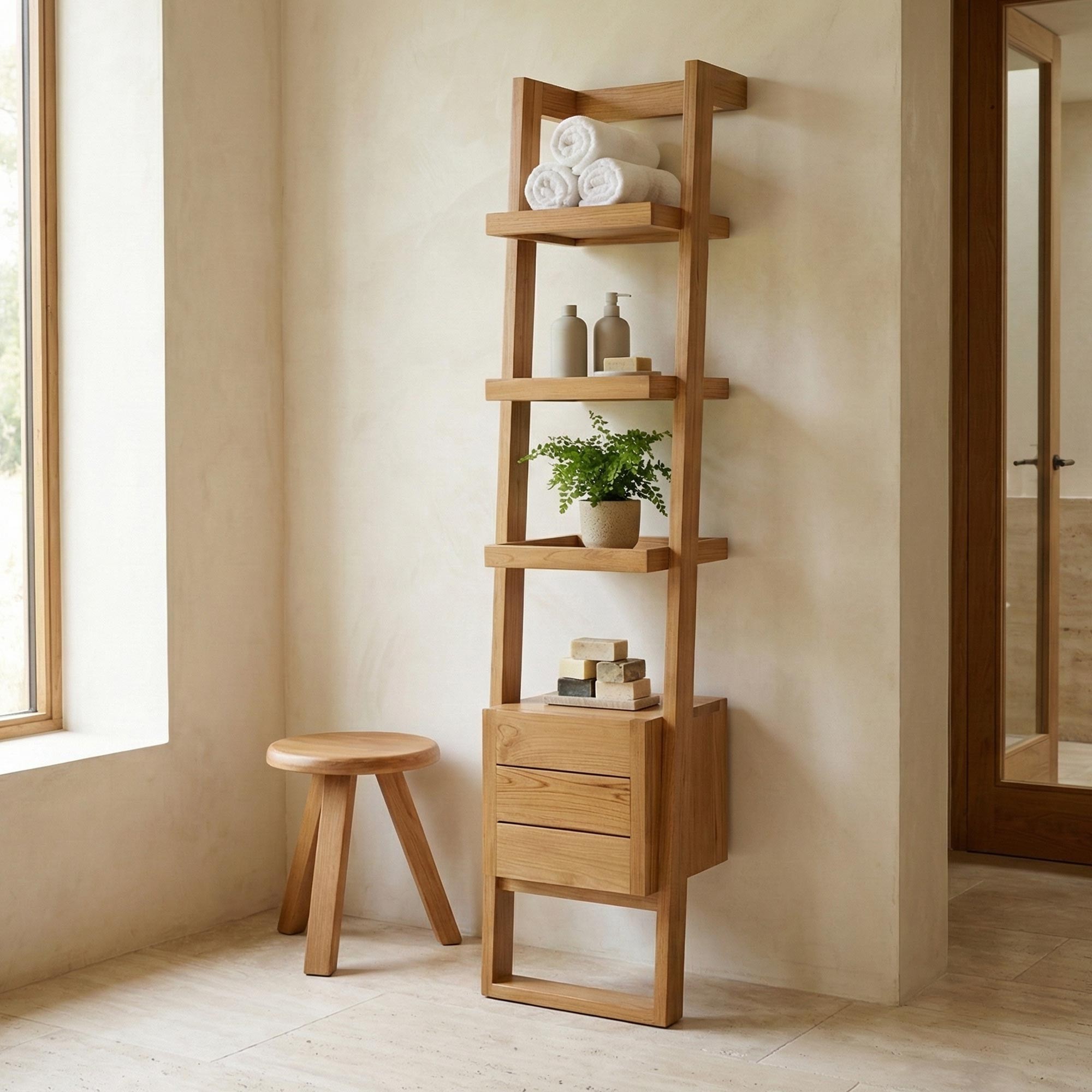 Ontdek de badkamerkolom Nandini in teak, een uniek stuk dat Scandinavische elegantie combineert met alledaags praktisch nut. Dit meubelstuk, met zijn strakke, warme ontwerp, heeft minimalistische lijnen en massief teakhout. Elke kolom is met de hand gemaakt en benadrukt de natuurlijke schoonheid van teakhout.