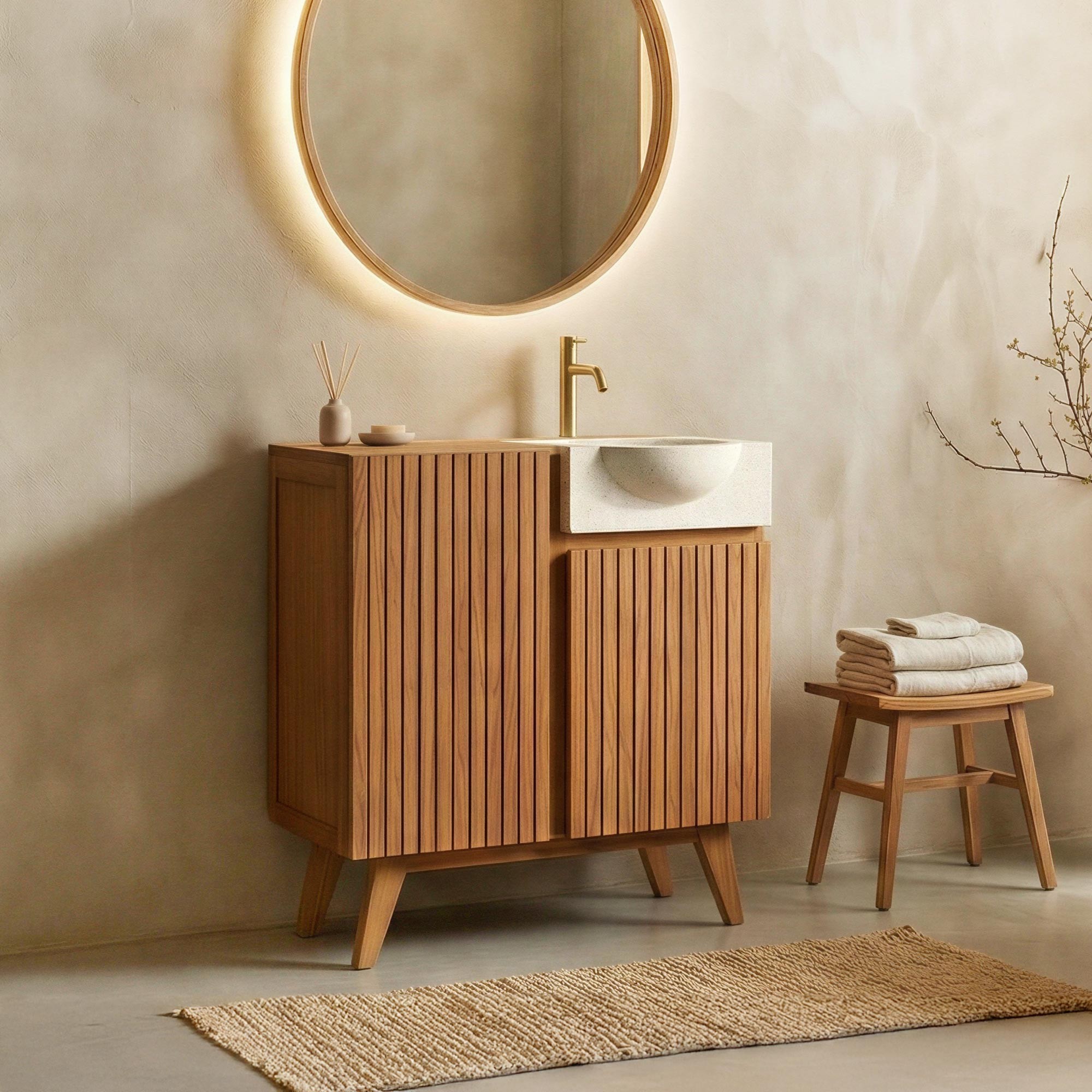 Deze badkamermeubels uit de Neela collectie, geïnspireerd door de Scandinavische stijl, belichaamt natuurlijke elegantie en functionaliteit. Het is gemaakt van massief teakhout en combineert de robuustheid van een nobele houtsoort met zorgvuldig vakmanschap dat elk detail benadrukt. De scharnierende deuren versierd met verticale lijnen voegen een vleugje originaliteit toe, terwijl de witte terrazzo wastafel, geïntegreerd in de structuur van het meubel, een elegant contrast vormt met het warme hout en de charme van het geheel versterkt.