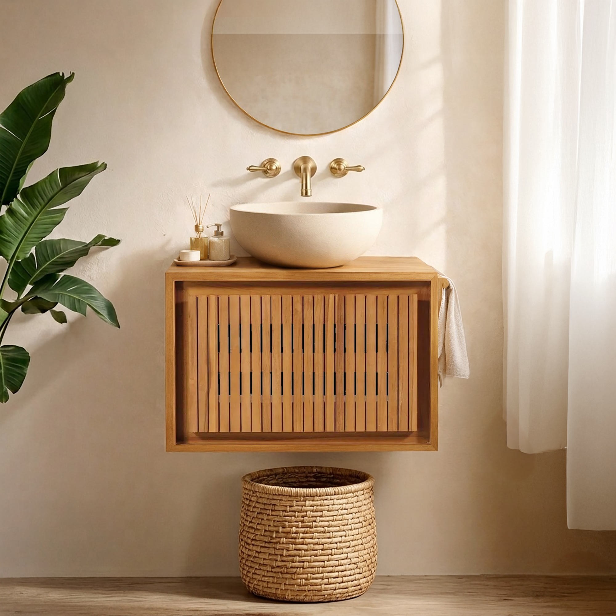 Deze Padang wandwastafel van massief teakhout is de perfecte combinatie van traditioneel vakmanschap en Scandinavisch design. Met zijn strakke lijnen en onberispelijke afwerking weerspiegelt hij een tijdloze stijl, ideaal om te integreren in verschillende hedendaagse of minimalistische omgevingen.