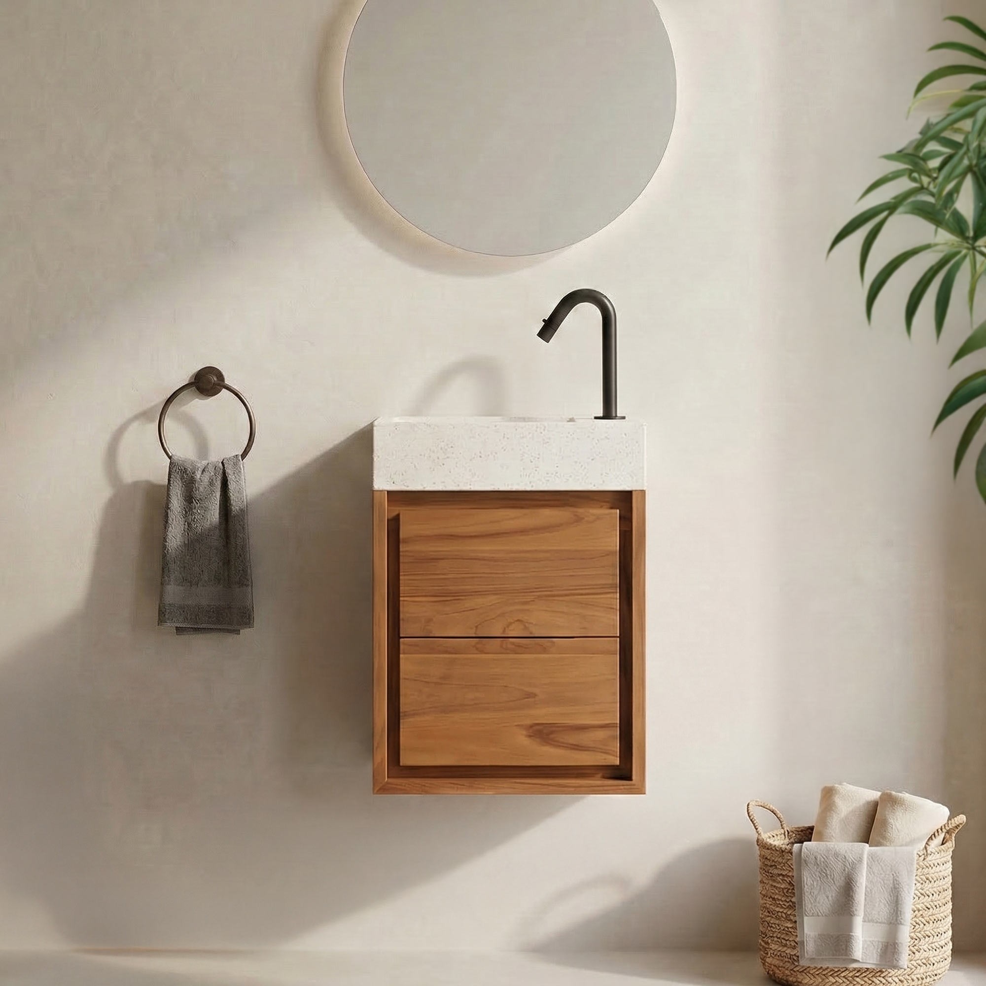 Hangwastafel van massief teakhout met witte terrazzowastafel - Tanvi