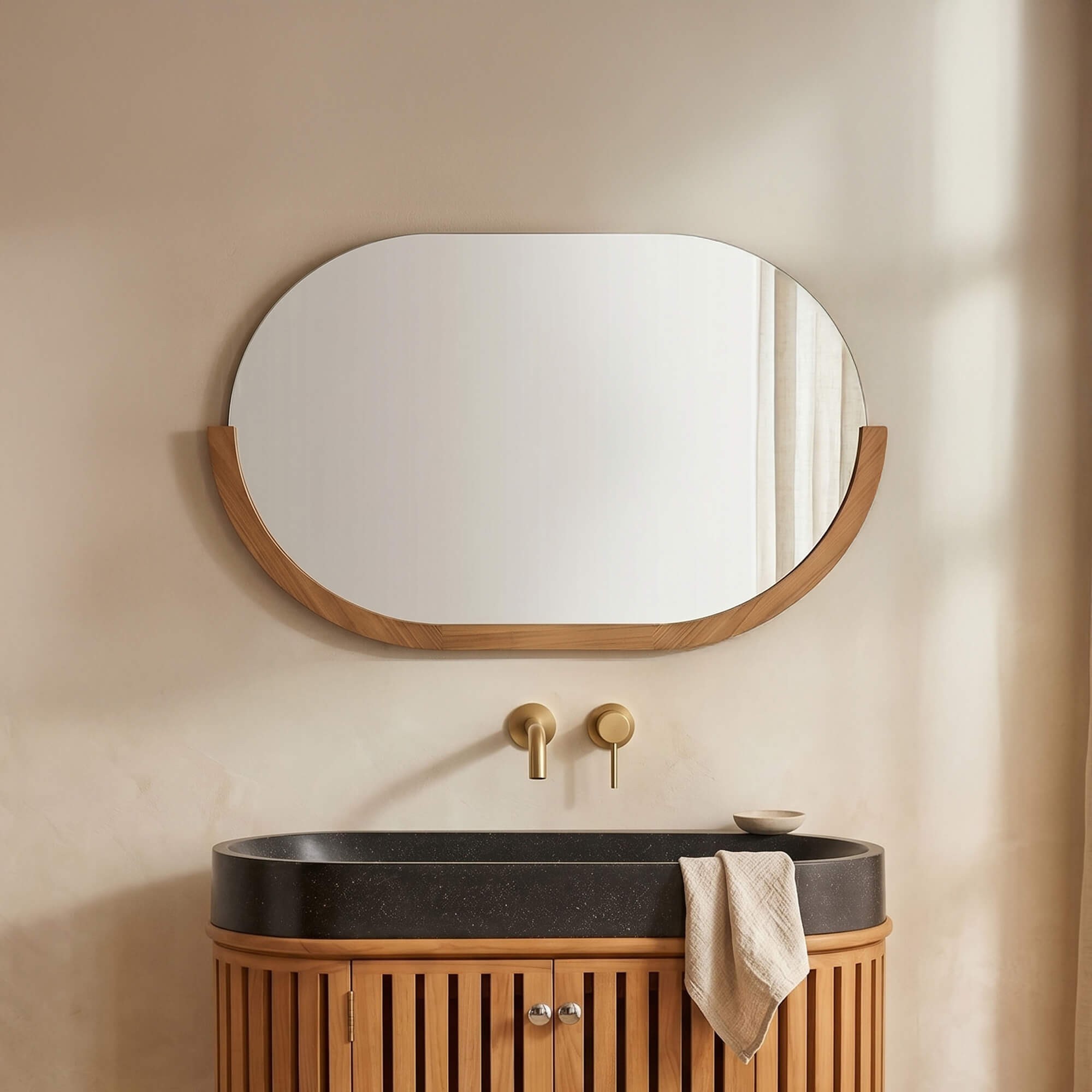 Ontworpen om te harmoniëren met natuurlijke materialen zoals hout, steen of beton, past deze spiegel elegant in een rustgevende, functionele badkamer. De eenvoud wordt versterkt door de delicate kromming van het frame, dat op subtiele wijze Scandinavische inspiratie oproept en tegelijkertijd een designer touch aan je kamer toevoegt.