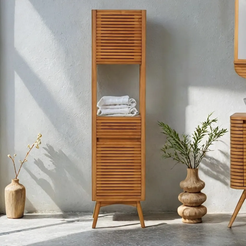 De massief teakhouten badkamerzuil uit de Kama-collectie belichaamt Scandinavische elegantie in al haar pracht. Ontworpen om je ruimte te verfraaien en tegelijkertijd functionele opbergruimte te bieden, combineert het op subtiele wijze design en functionaliteit.