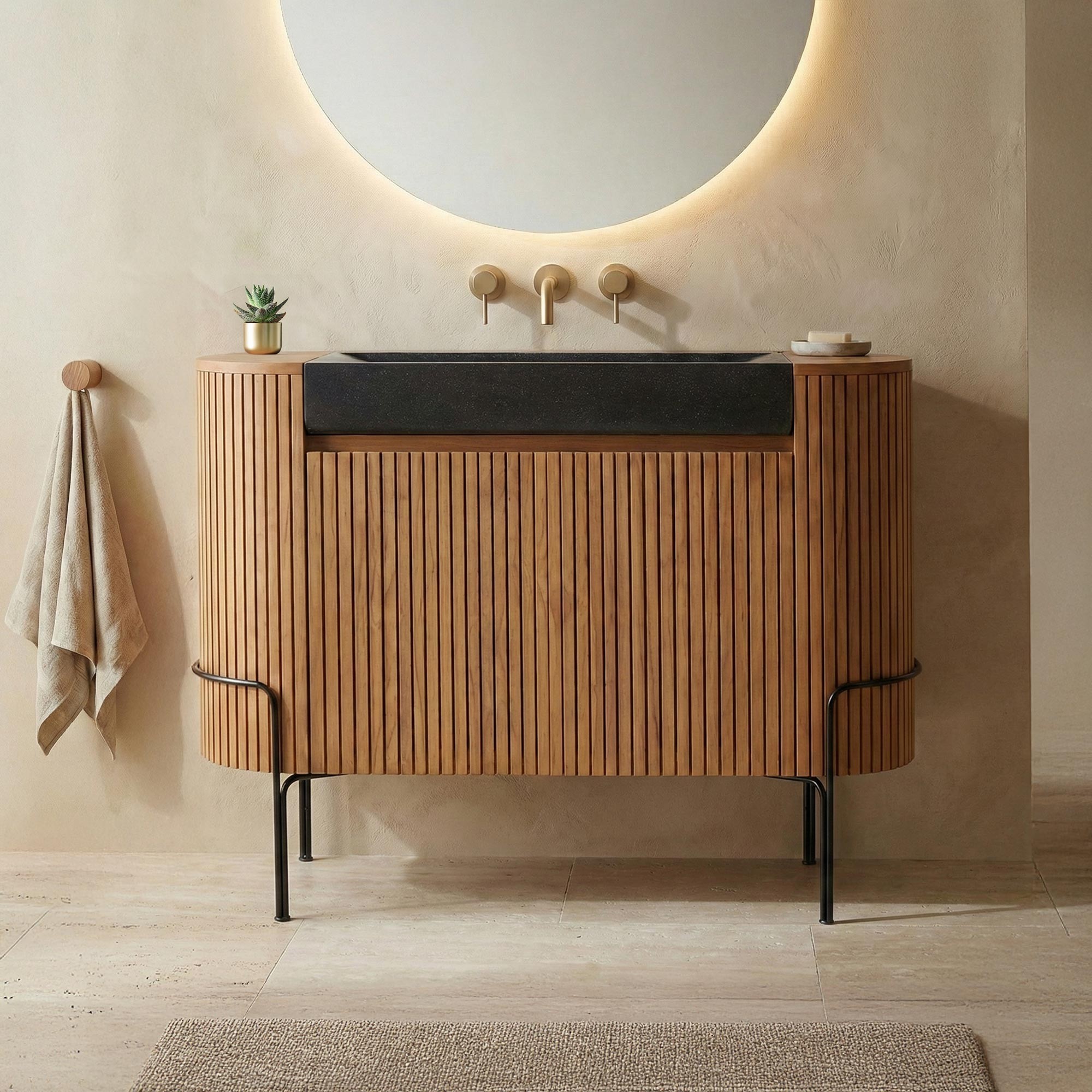 Verfraai je badkamer met het Rani badkamermeubel, een uitzonderlijk meubelstuk dat vakmanschap, Scandinavisch design en edele materialen combineert. Gemaakt van massief teakhout is dit meubel de perfecte mix van robuustheid en natuurlijke elegantie. De onberispelijke afwerking benadrukt de rijke nuances van het teakhout, terwijl de strakke lijnen en gedetailleerde groeven de eigentijdse look benadrukken.