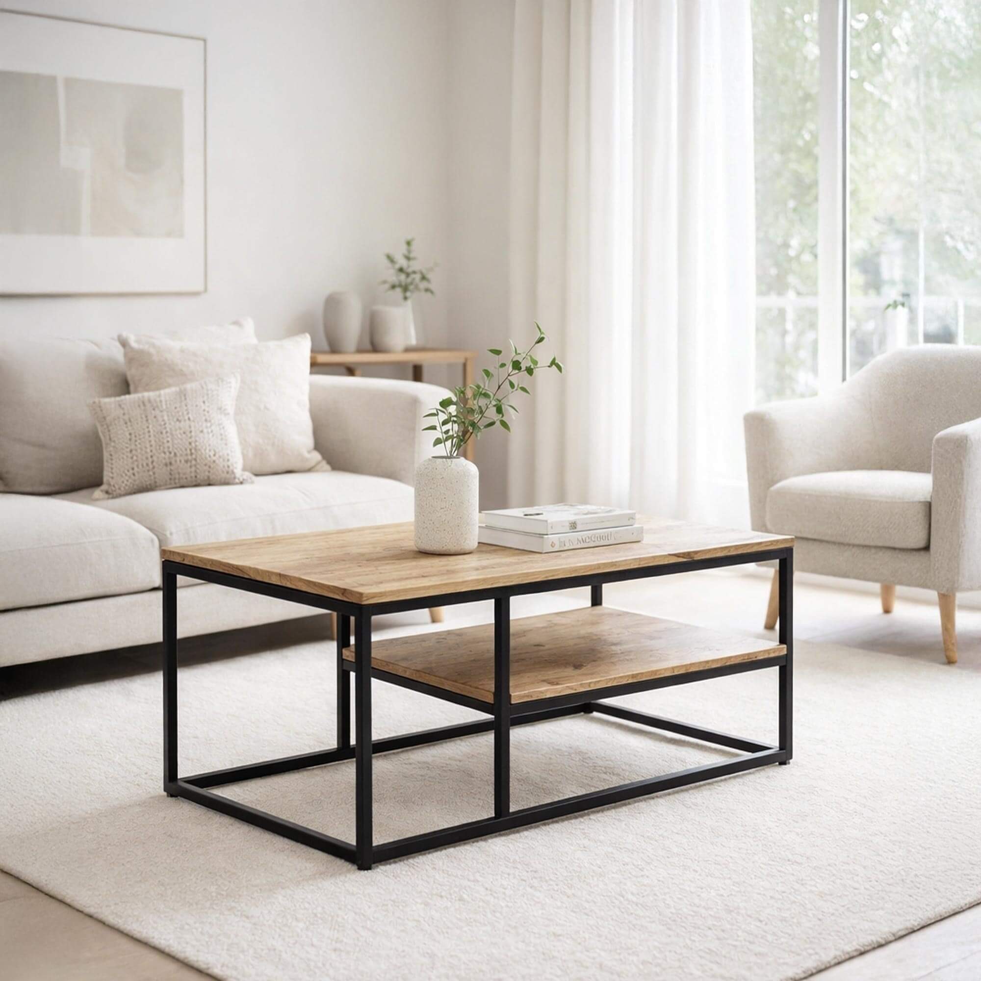 ../279-salontafelsBreng een vleugje elegantie en stevigheid in je woonkamer met deze massief mangohouten salontafel. Het is een waar staaltje vakmanschap en combineert op harmonieuze wijze de natuurlijke charme van hout met de moderniteit van metaal, waardoor een meubel met een tijdloos industrieel ontwerp ontstaat. Het ontwerp met twee niveaus biedt een praktische, goed doordachte ruimte voor het uitstallen van je decoratieve voorwerpen of het opbergen van je dagelijkse benodigdheden.
