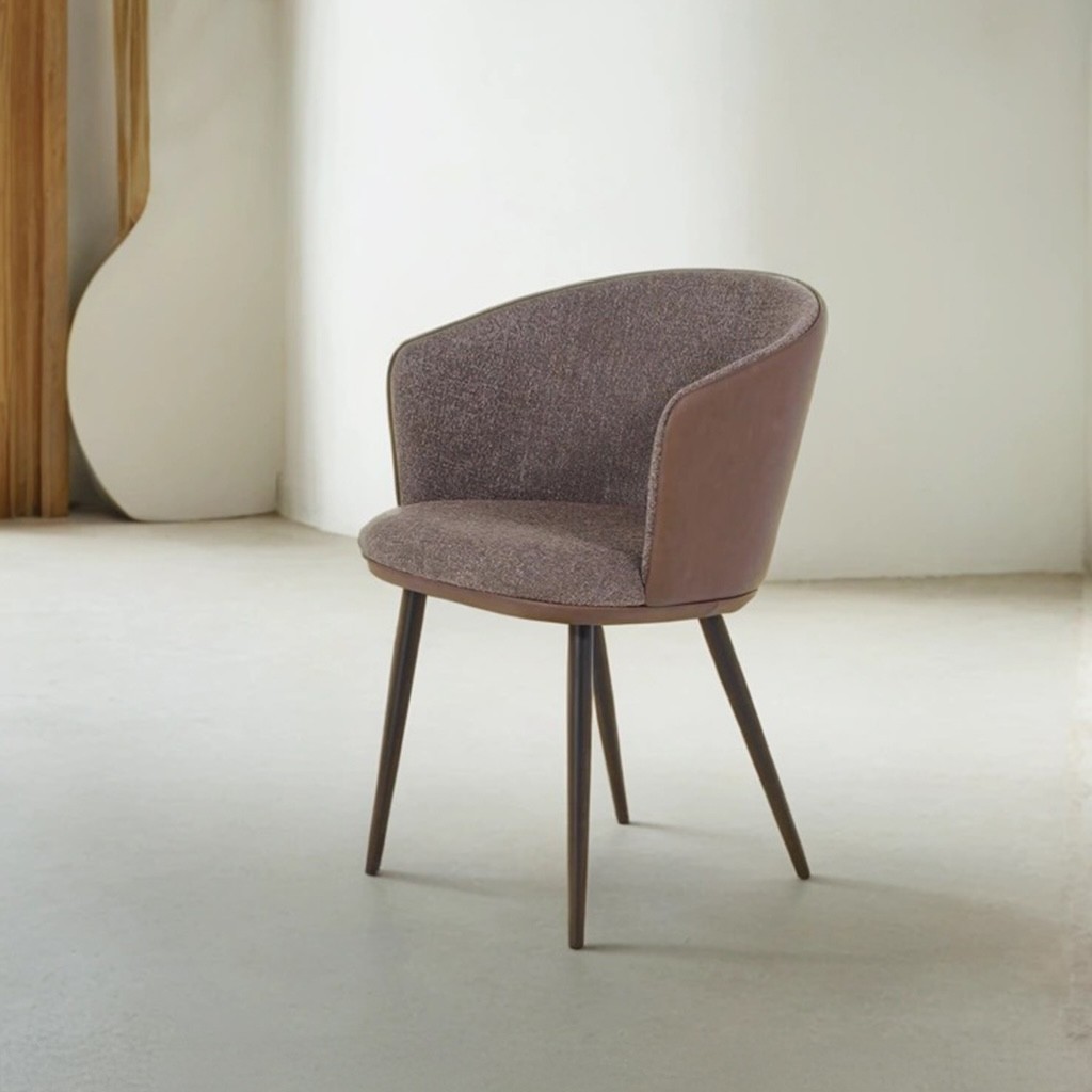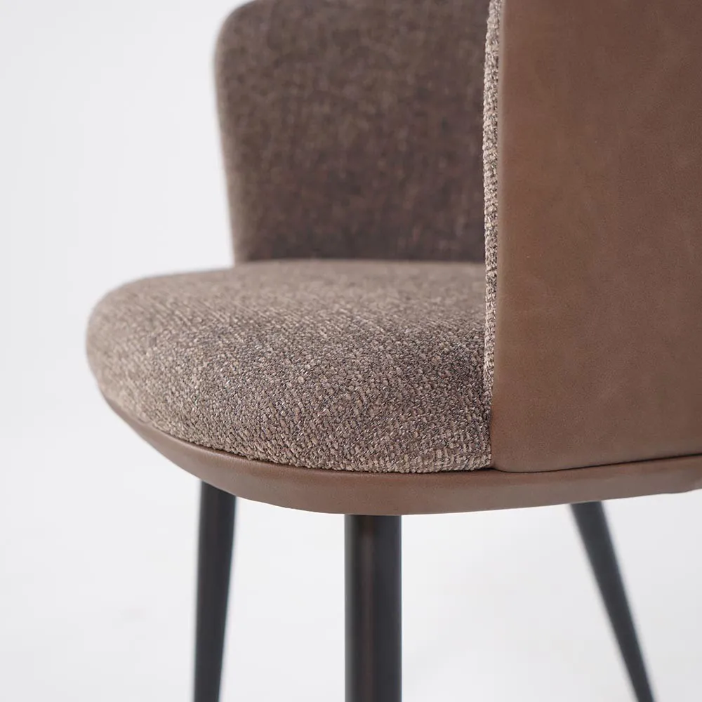 De bruine bouclé stof die de zitting en rugleuning bekleedt, voelt zacht en warm aan en creëert een uitnodigende sensatie. Deze gestructureerde bekleding contrasteert subtiel met het bruine kunstleer dat de achterkant van de rugleuning bedekt, wat een extra vleugje verfijning toevoegt. De keuze voor zorgvuldig geselecteerd synthetisch leer combineert esthetiek met onderhoudsgemak en garandeert een lange levensduur.