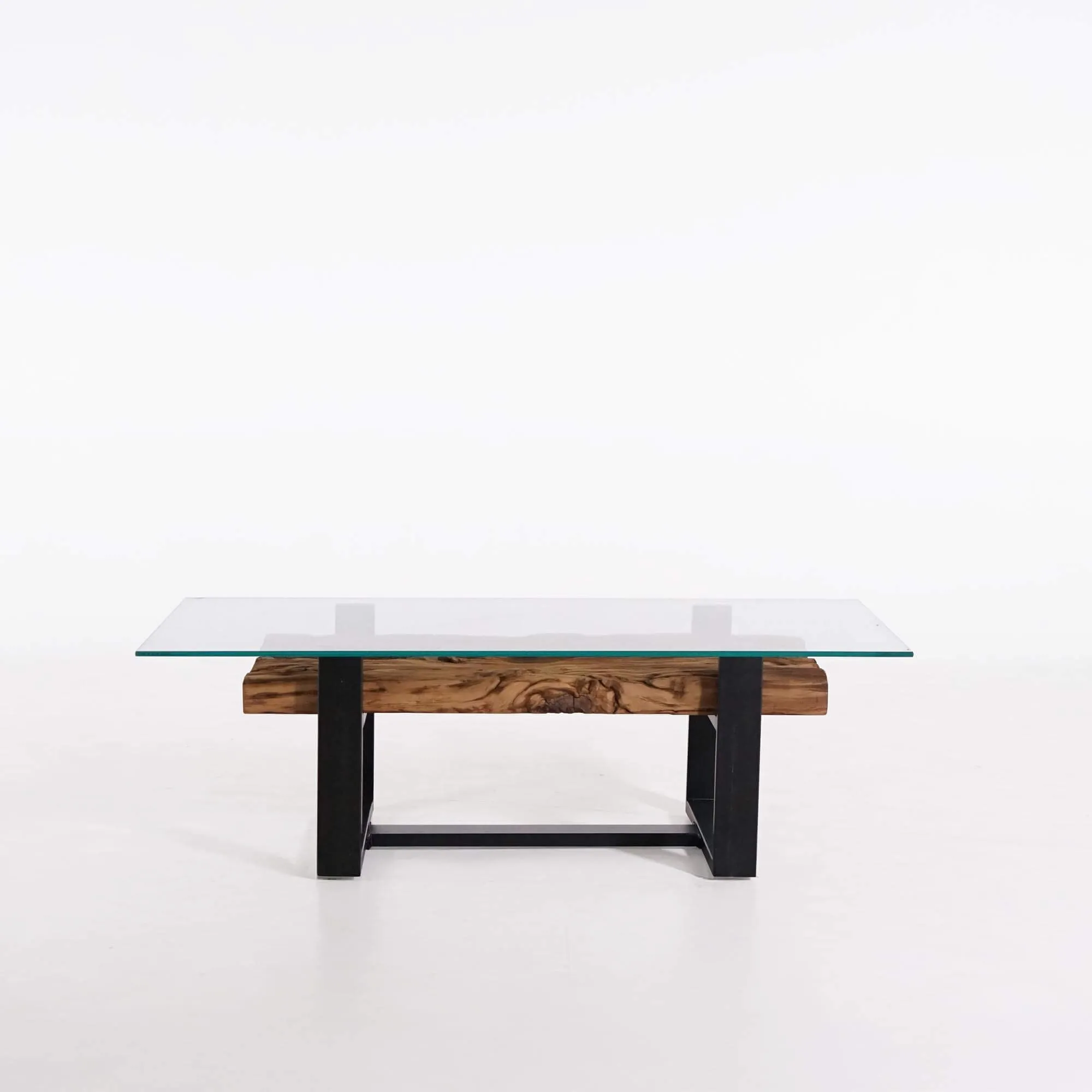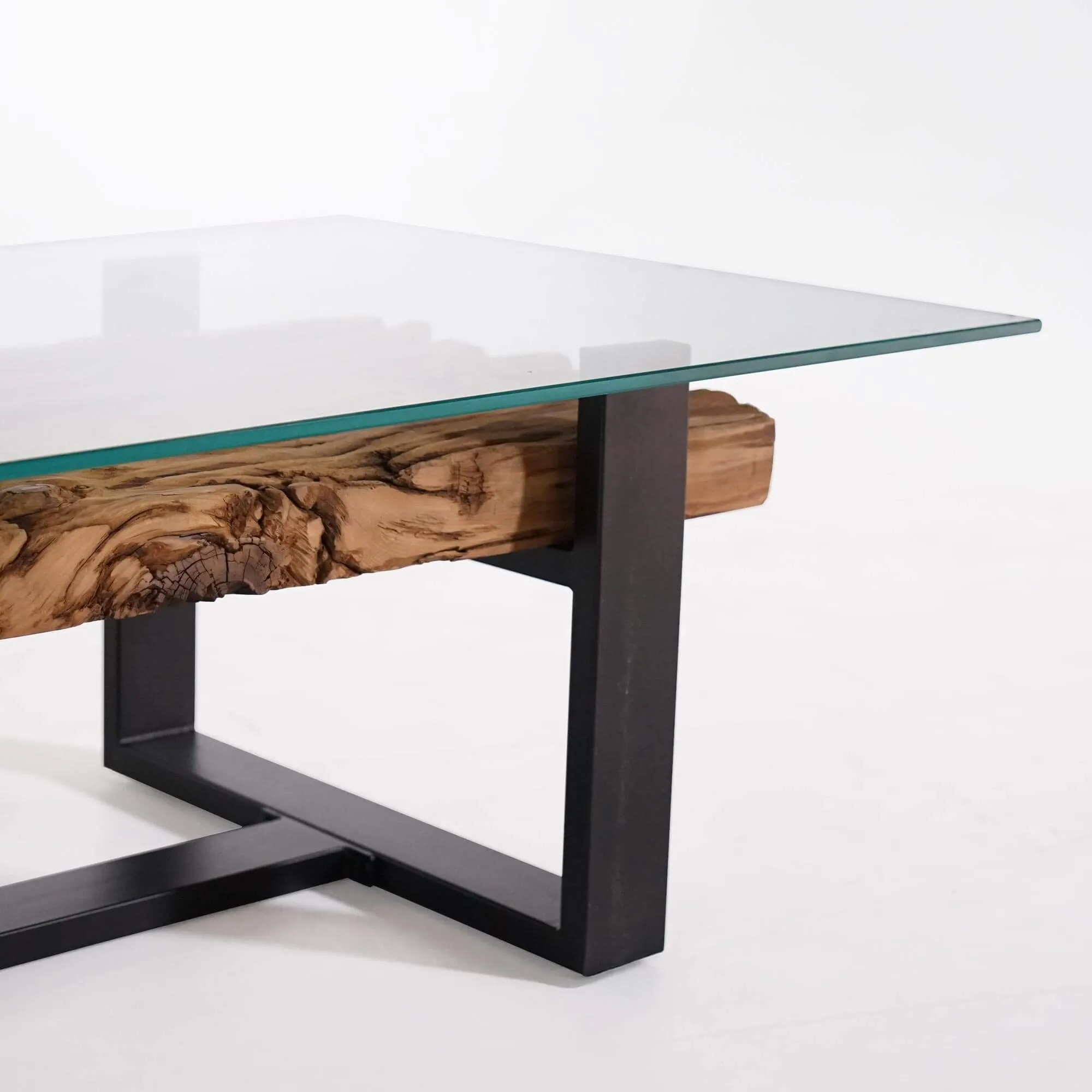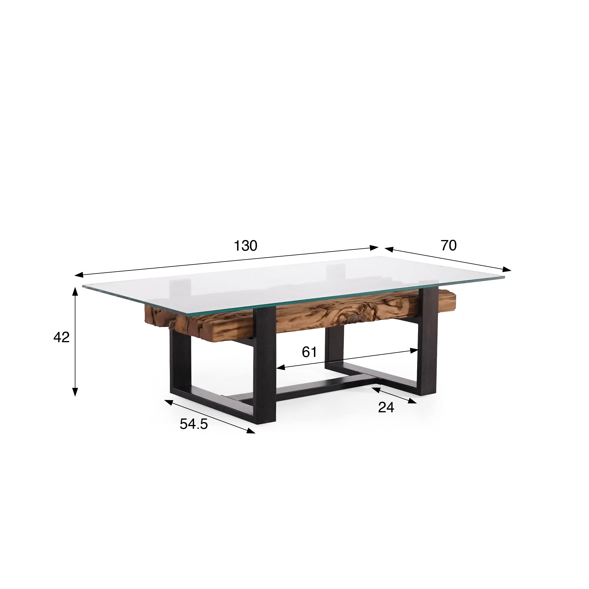 De zwarte metalen structuur van onze salontafel met glazen blad en spoorbielzen Railwood – robuust en geometrisch – vormt een krachtig contrast met de organische textuur van het hout. Dit evenwicht tussen stevigheid en lichtheid creëert een tijdloos designstuk dat zowel in een industriële loft als in een minimalistisch interieur tot zijn recht komt. De tafel rust op een open en luchtig onderstel dat het oog onder het blad laat dwalen en zo het gevoel van ruimte versterkt.