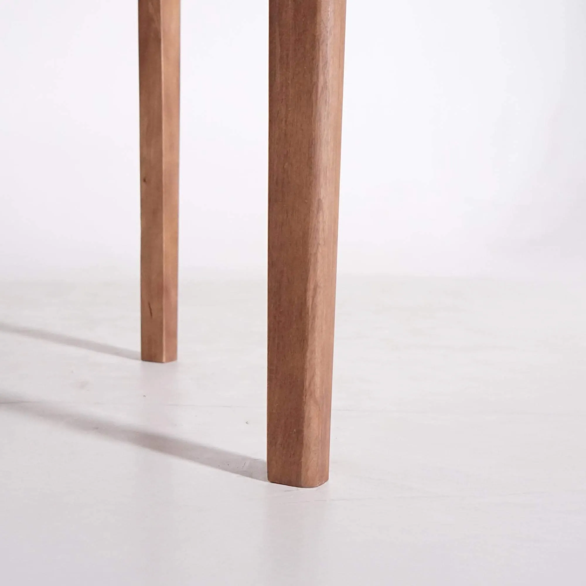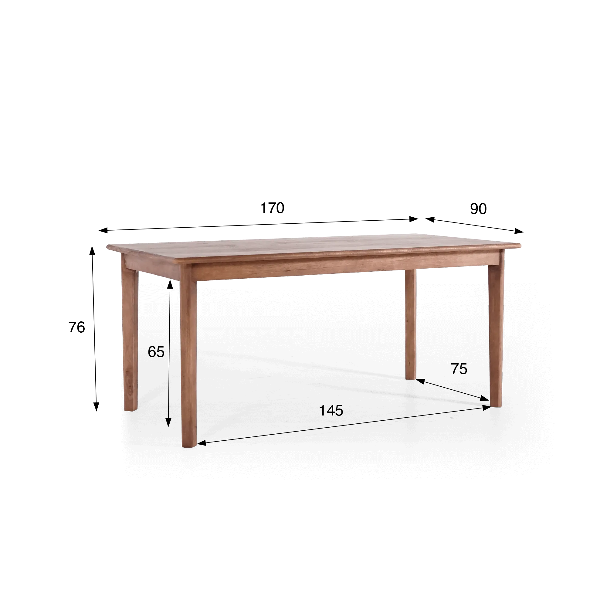 We wilden een rechthoekige eettafel in massief mangohout die op zichzelf spreekt: een blad van 170 cm lang en 90 cm breed, met zacht afgeronde randen en een zijdezachte afwerking, gedragen door rechte, licht taps toelopende poten. De verhoudingen zijn zorgvuldig bestudeerd om een perfect visueel evenwicht en optimaal gebruikscomfort te bieden, geschikt voor zes personen zonder aan ruimte in te boeten.