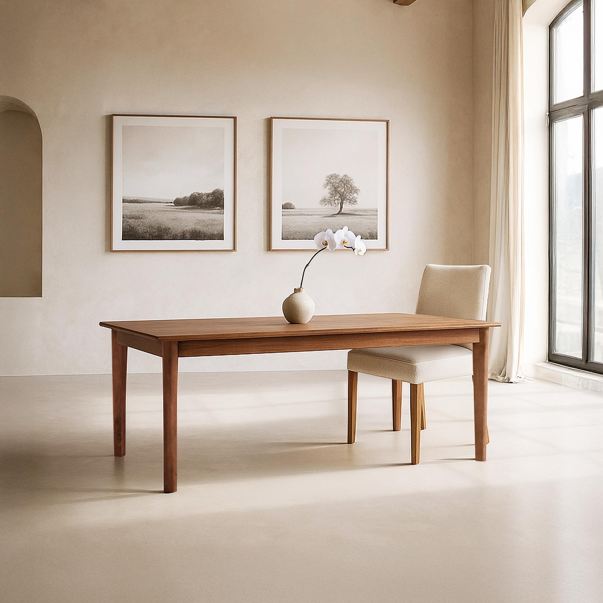Volledig met de hand vervaardigd, onthult elke rechthoekige eettafel in massief mangohout de unieke nervenstructuur en de subtiele honing- tot amberkleurige tinten van het hout. Het massieve mangohout werd gekozen omwille van zijn natuurlijke stevigheid en zijn vermogen om de tand des tijds te doorstaan zonder zijn schoonheid te verliezen. De gladde, satijnen afwerking beschermt het oppervlak terwijl de ruwe uitstraling van het materiaal behouden blijft – een toonbeeld van ingetogen elegantie.