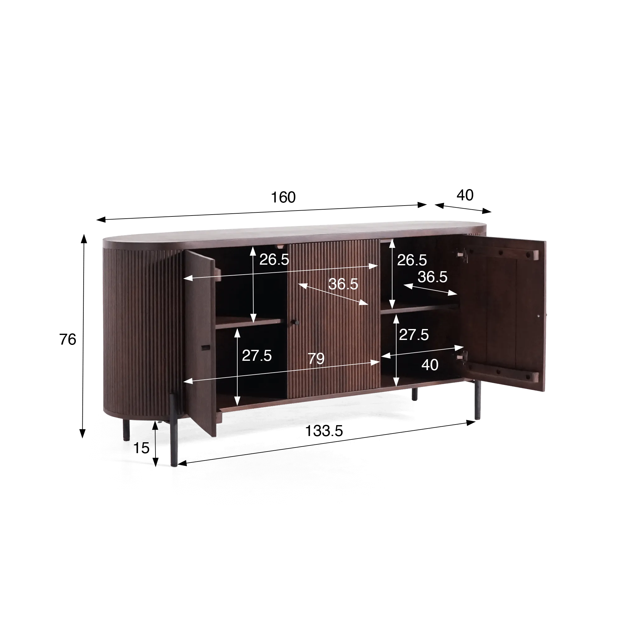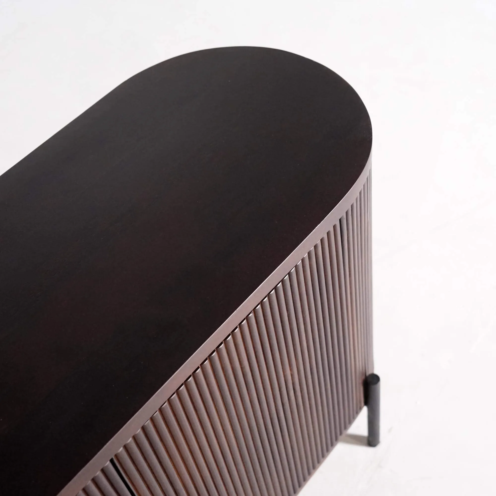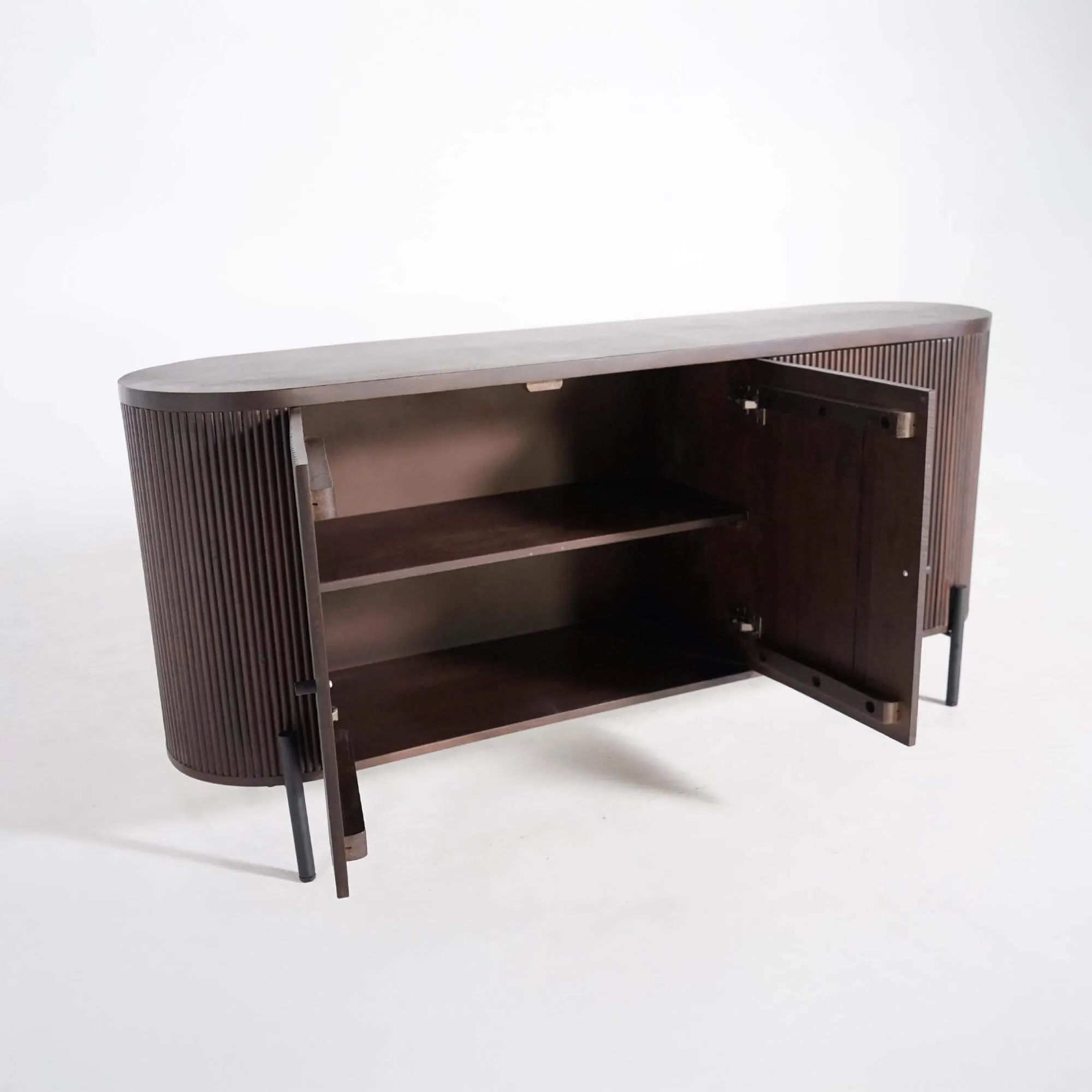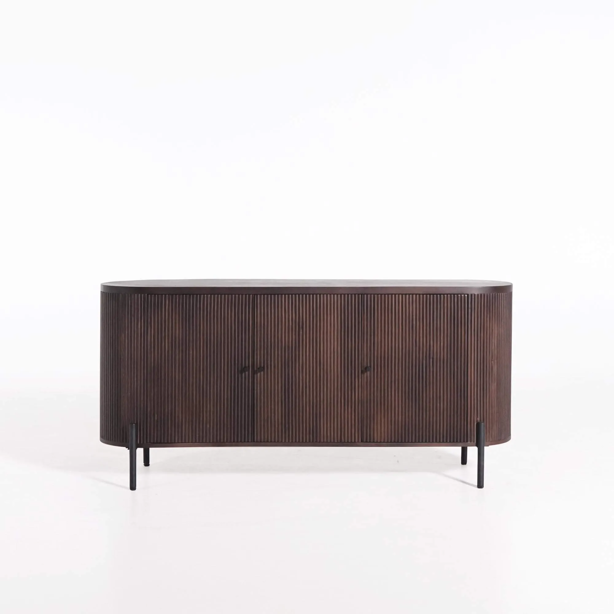 Gemaakt van massief hout, onthult dit dressoir met 3 deuren in mangohout de rijkdom van een edele houtsoort waarvan de levendige textuur en diepe bruine tinten het licht op natuurlijke wijze vangen. Het ambachtelijk uitgevoerde geribbelde oppervlak creëert een rustgevend visueel ritme en benadrukt de ovale vorm van het meubel. De zwarte metalen poten, slank en subtiel, versterken het contrast tussen de materialen en brengen een moderne toets aan het geheel.