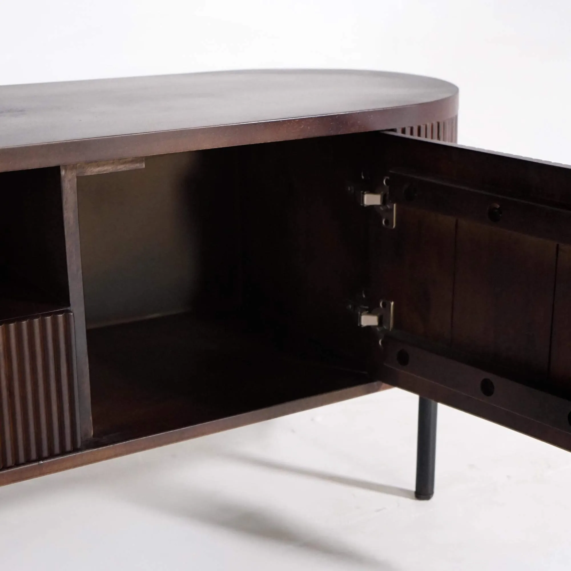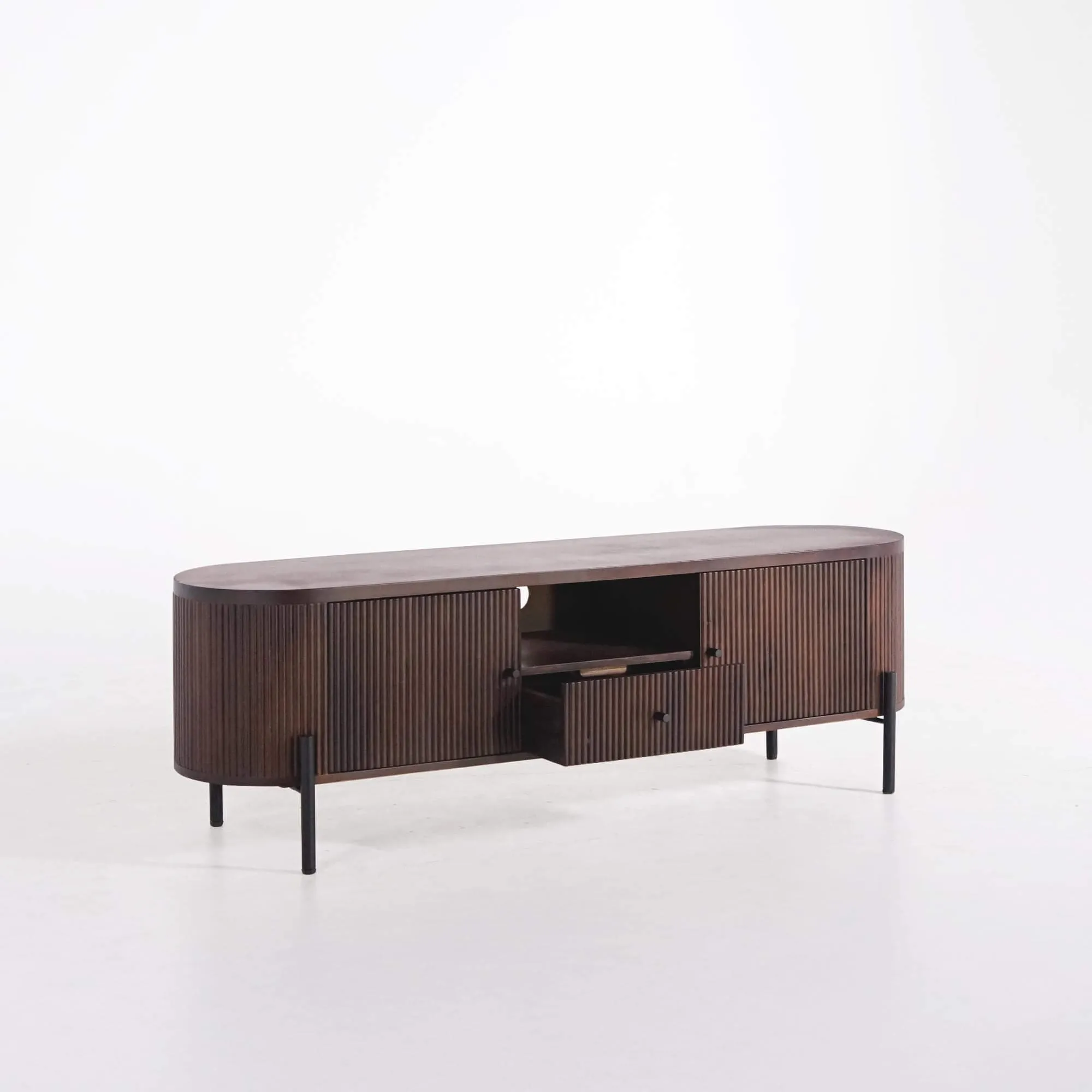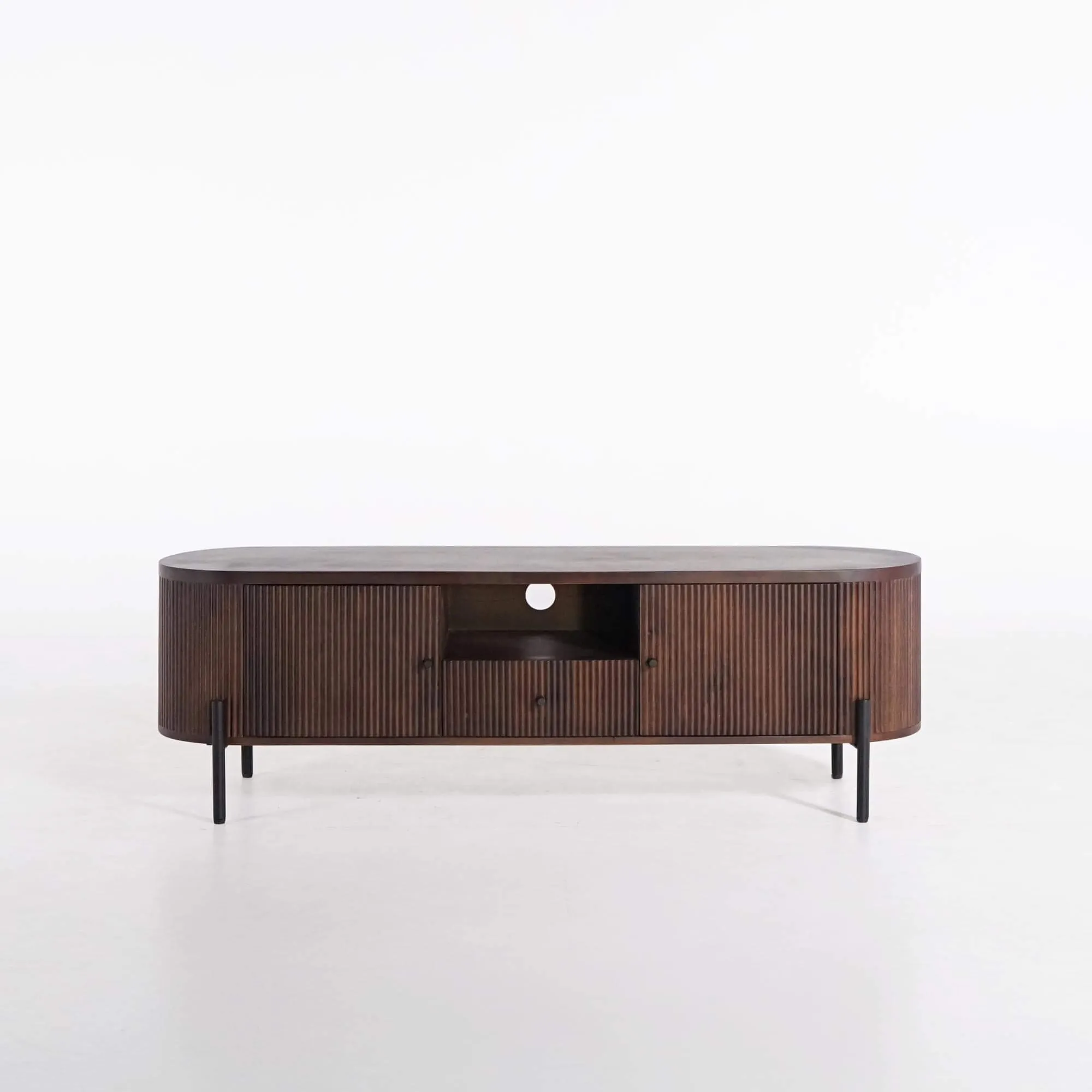 Gemaakt van massief mangohout toont dit tv-meubel een zorgvuldig met de hand afgewerkte oppervlakte die de diepe bruine tinten van het hout prachtig accentueert. De geribbelde voorzijde, kenmerkend voor de Sohana-collectie, vangt het licht op subtiele wijze en creëert een verfijnd spel van schaduw en textuur. De zwarte metalen poten, slank en lichtjes verschoven geplaatst, versterken de visuele lichtheid van het meubel en zorgen tegelijk voor een perfecte stabiliteit.