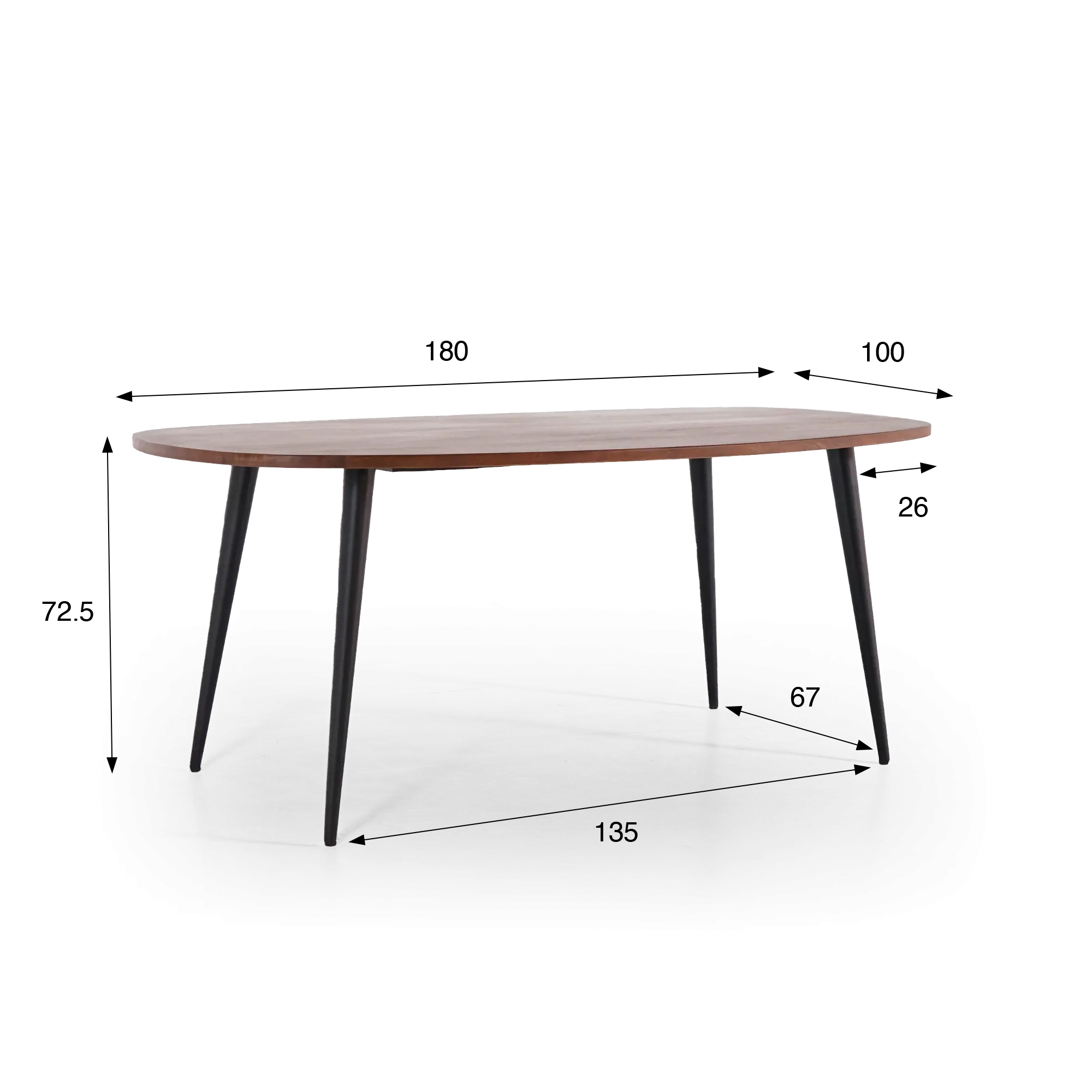Volledig met de hand vervaardigd in ons atelier, onderscheidt de massieve mangohouten eettafel Suna zich door haar ovale blad van 200 cm lang en 100 cm breed, dat royaal plaats biedt aan zes tot acht gasten. De diepe bruine tint van het mangohout benadrukt de natuurlijke nerf en geeft elk stuk een unieke uitstraling. Het gladde oppervlak en de zacht afgeronde randen weerspiegelen onze hoge afwerkingsgraad en de zorg voor elk detail.