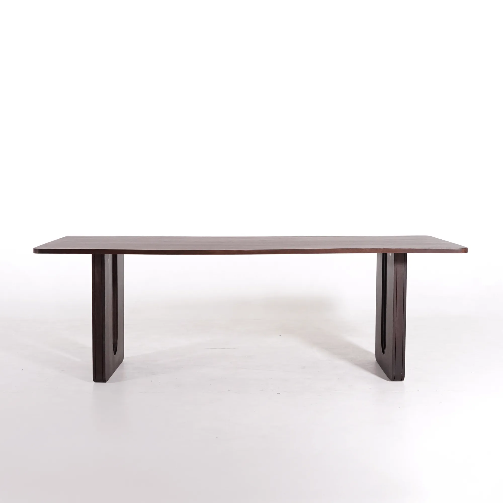 Gemaakt van massief mangohout, overtuigt onze Noba eettafel door de rijke bruine tint en de satijnzachte afwerking. Het tafelblad van 200 × 100 cm, met een dikte van 3 cm, rust op twee volle U-vormige poten met een architecturaal ontwerp. Hun precieze afwerking zorgt voor een grafische uitstraling en een opmerkelijke stabiliteit. Het contrast tussen de visuele lichtheid van het blad en de stevige basis creëert een subtiele harmonie, trouw aan de filosofie achter haar ontwerp.