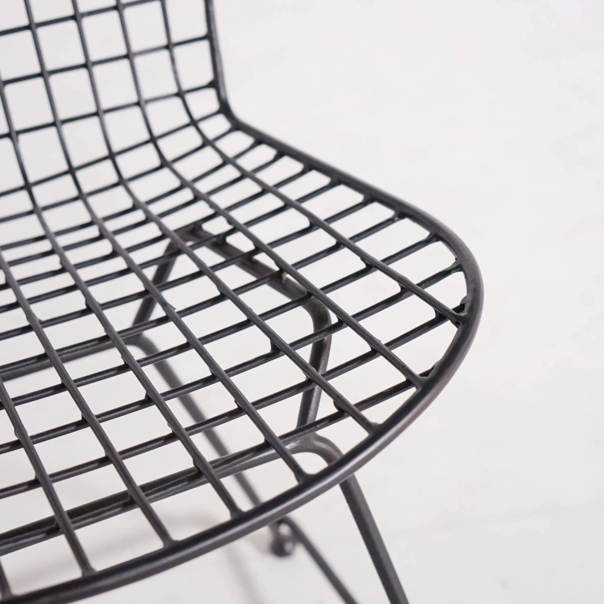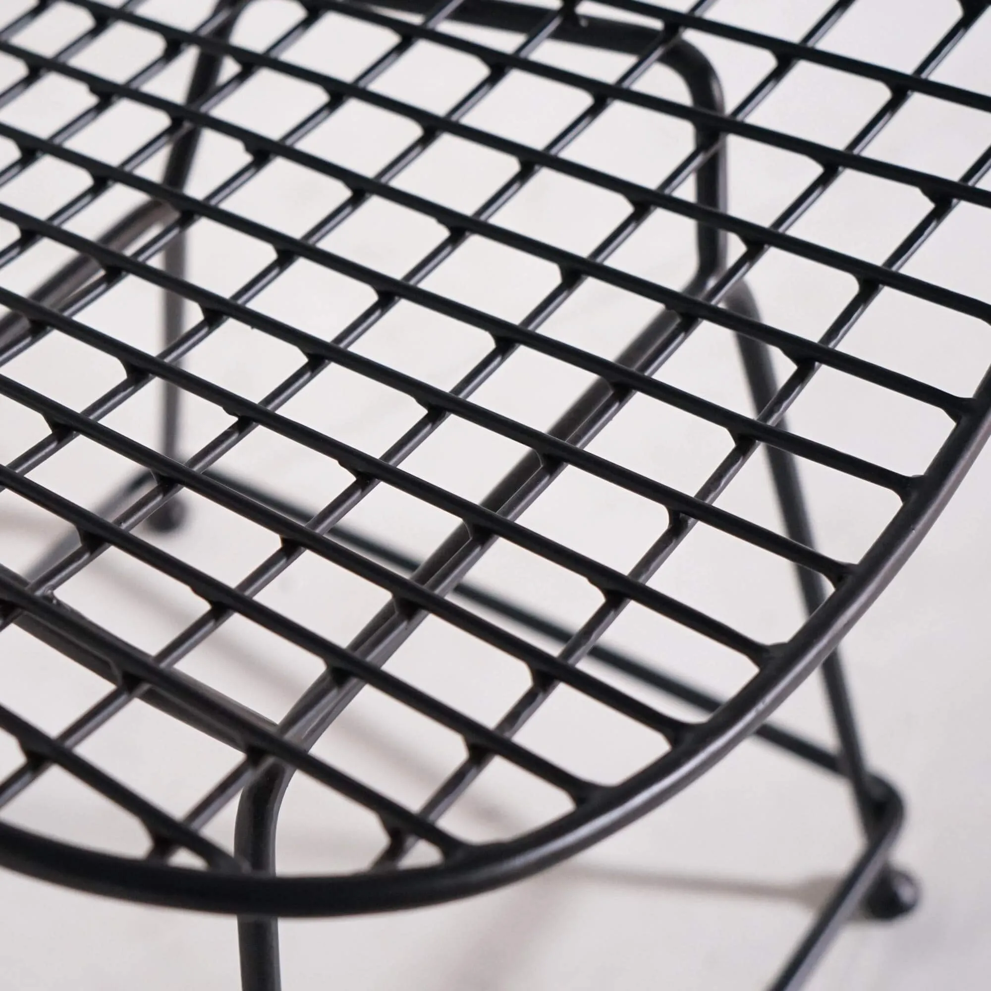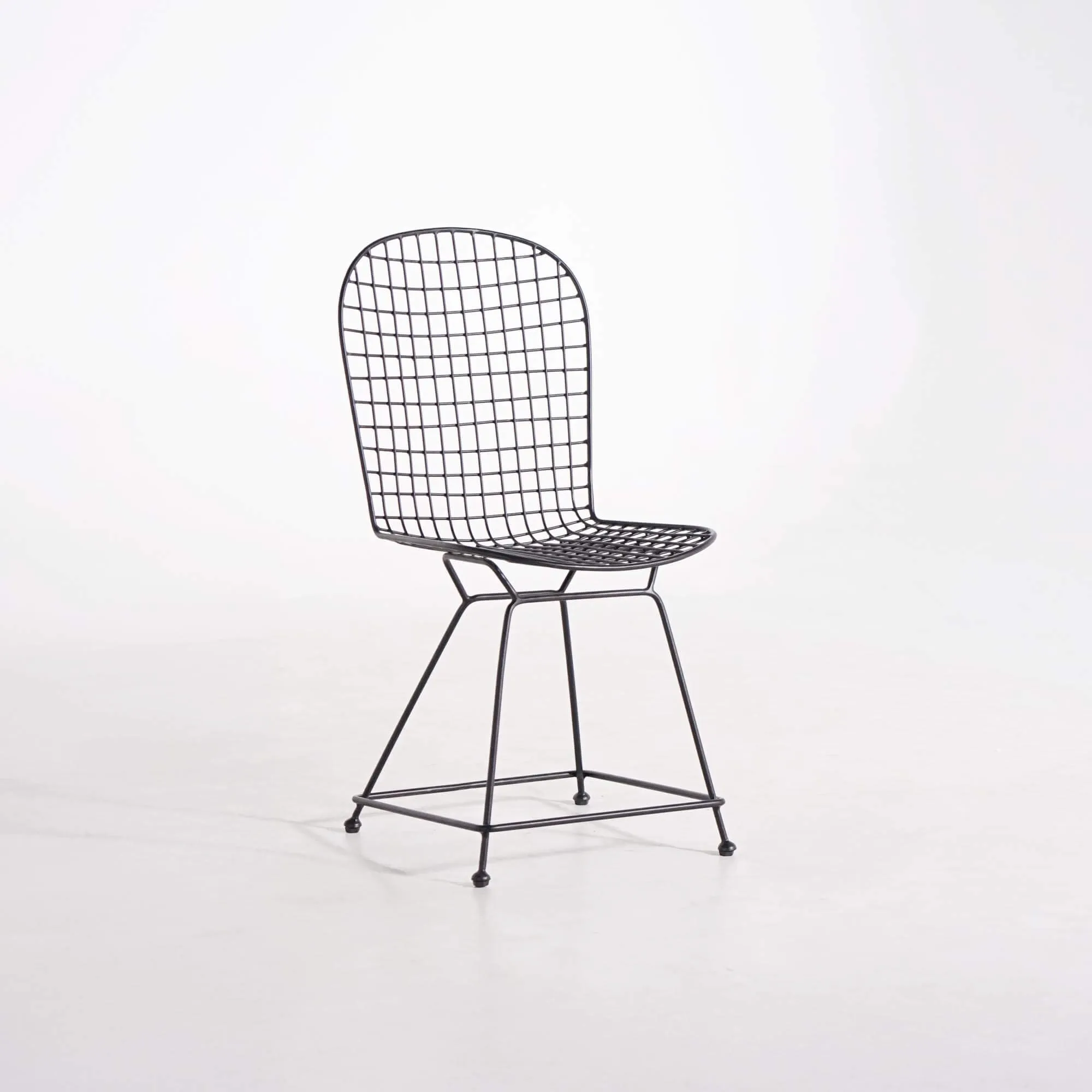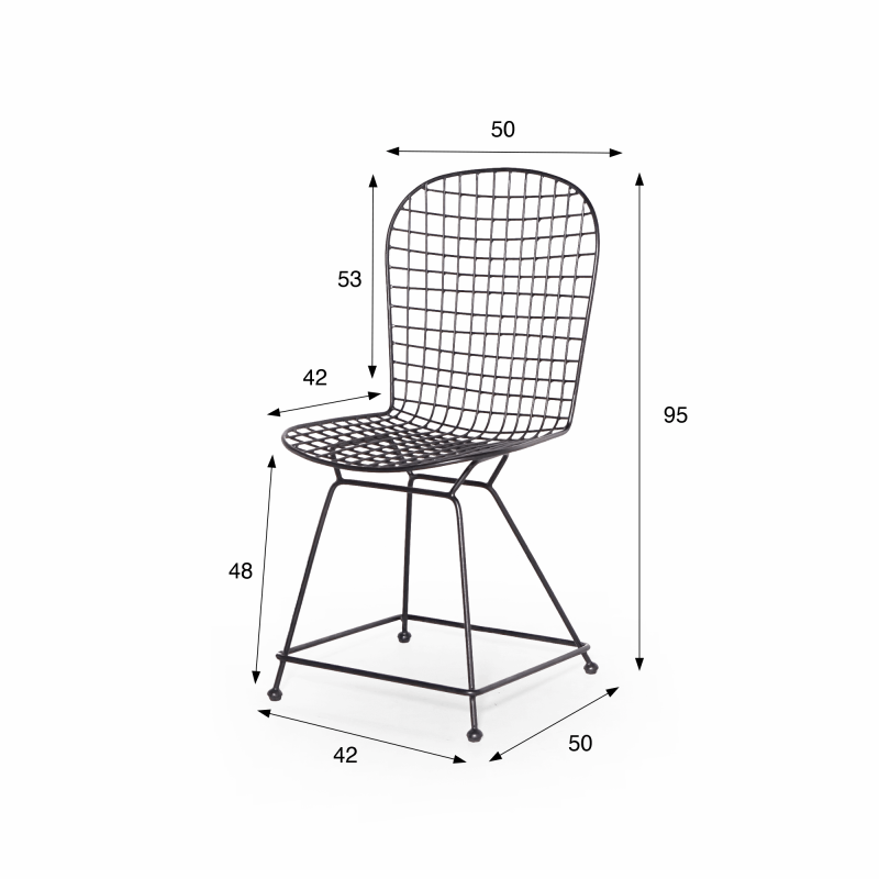 Ambachtelijk vervaardigd uit massief metaal met een zwarte lakafwerking, speelt de metalen stoel in industriële stijl Wire met transparantie en de geometrie van zijn roosterstructuur. De hoge rugleuning van 53 cm volgt subtiel de vorm van de rug, terwijl de zitting van 42 cm diep en 50 cm breed een stabiel en uitgebalanceerd comfort biedt. De fijne, regelmatige lijnen van het frame creëren een luchtige indruk, versterkt door de taps toelopende poten die verbonden zijn met een dwarsbalk voor perfecte stabiliteit.