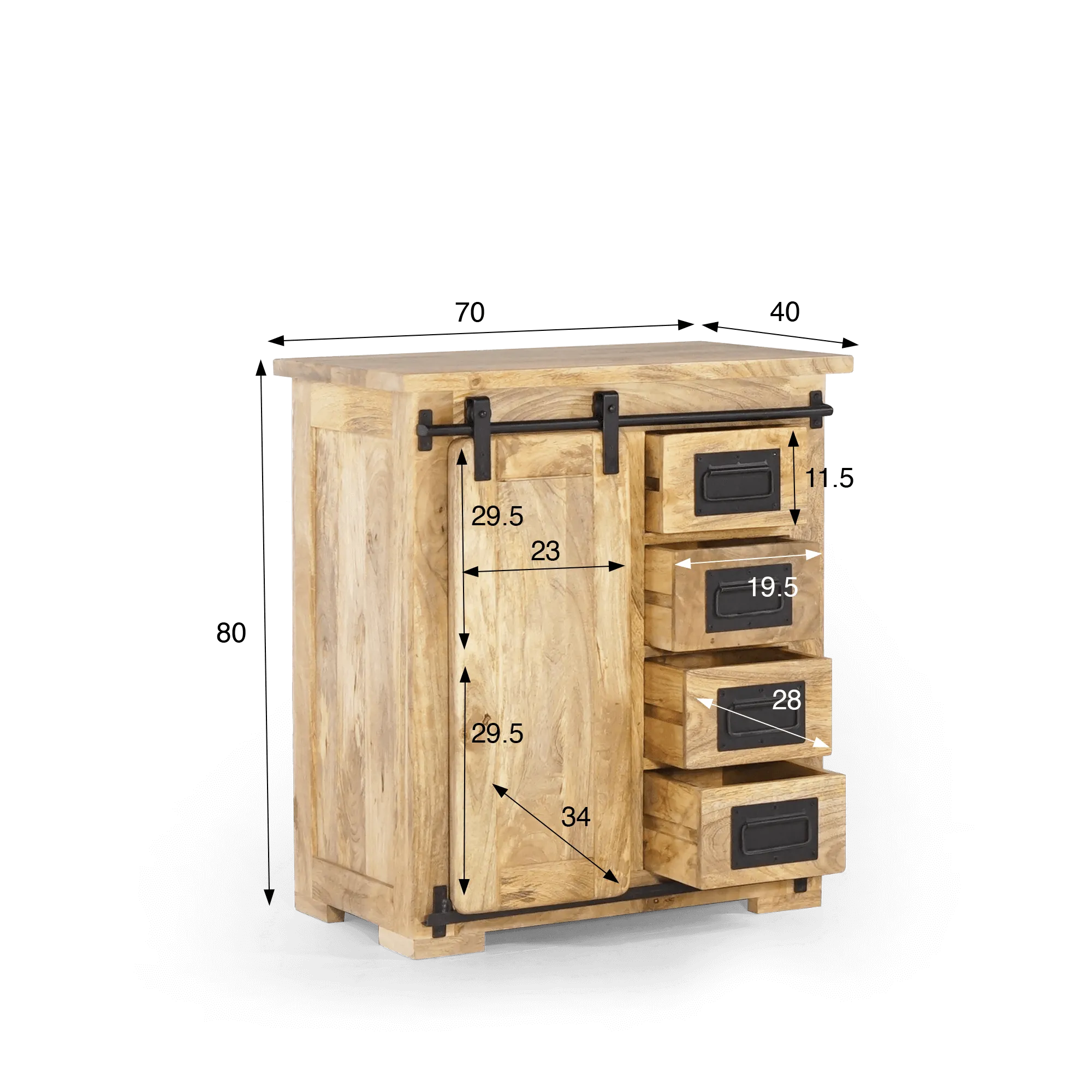 Aan de rechterkant bieden vier lades (binnenafmetingen: B28 x D19,5 x H11,5 cm) plaats voor flacons, verzorgingsproducten of klein textiel. De metalen handgrepen in industriële stijl, bevestigd op fronten van ruw hout, versterken het karakter van het meubel en maken het gemakkelijk te openen.