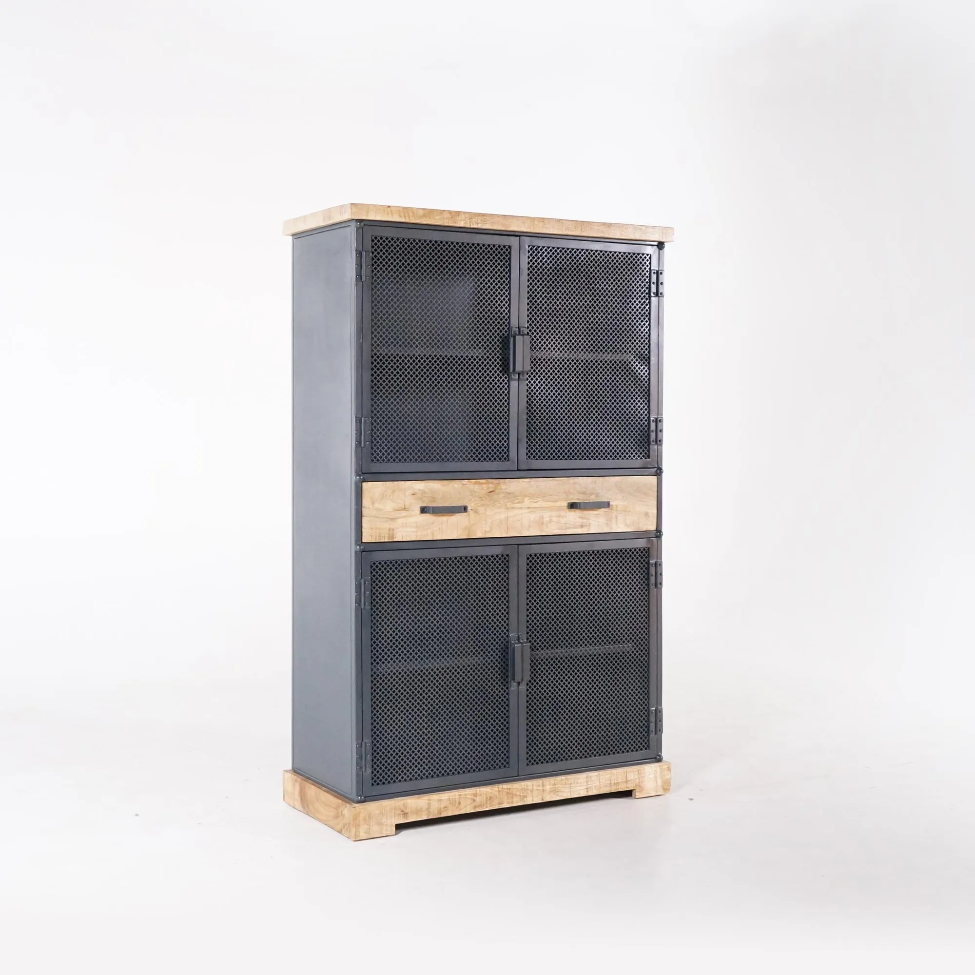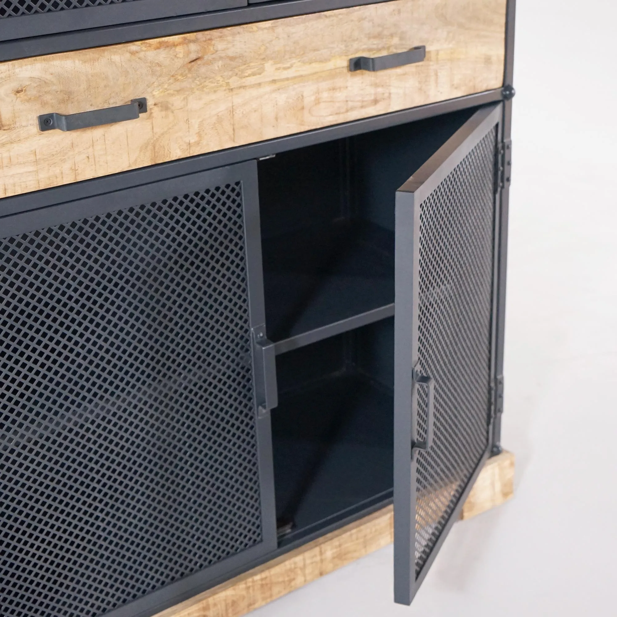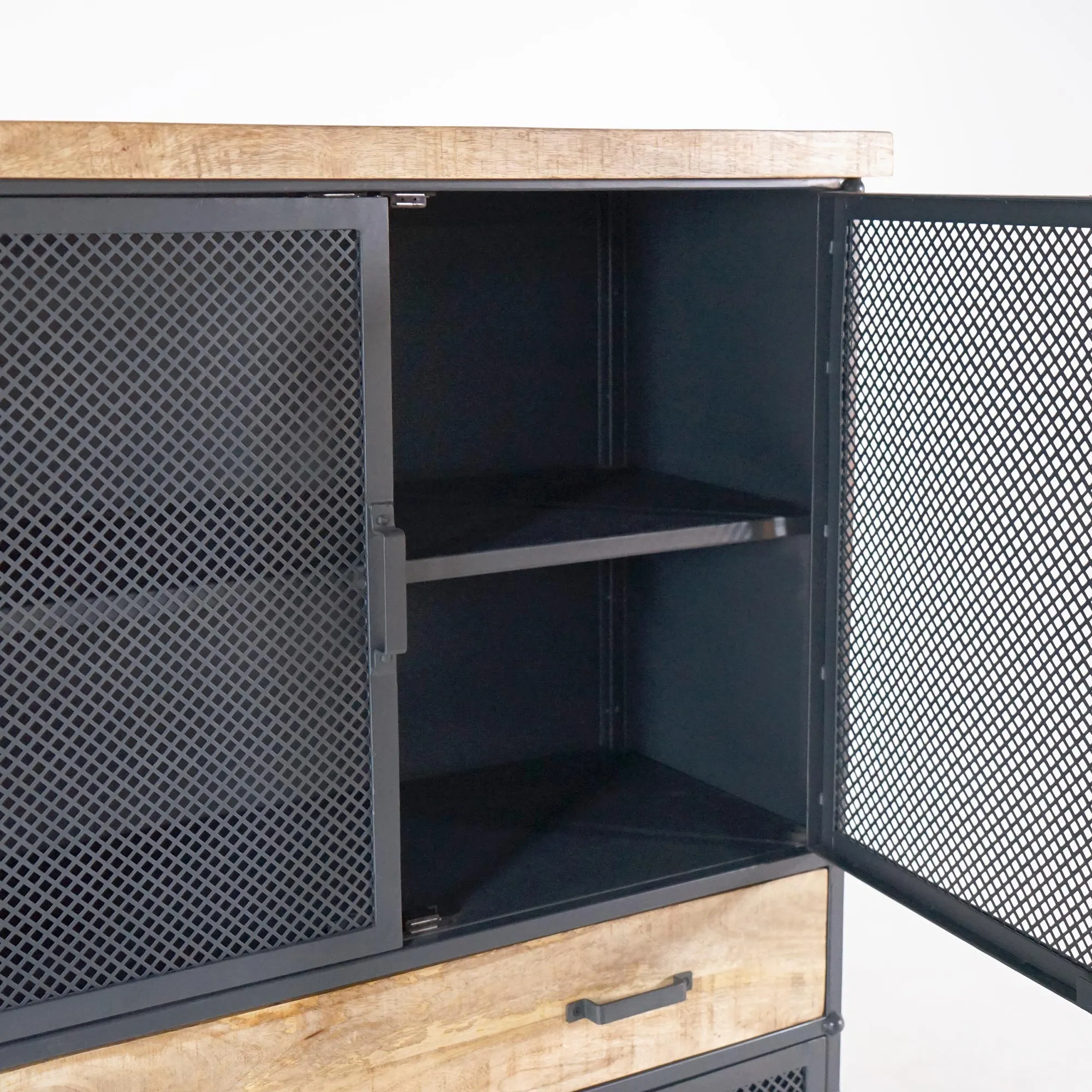 We wilden in deze metalen en houten opbergkast de ruwe geest van het atelier behouden, met metalen roosterdeuren die het interieur subtiel laten doorschijnen en tegelijk een lichte uitstraling geven. Het contrast tussen de warmte van het mangohout en de koele, robuuste uitstraling van het metaal creëert een subtiele harmonie, typerend voor de Cambridge-collectie. De matzwarte afwerking, de metalen klinkhandgrepen en de massief houten basis dragen bij aan het visuele evenwicht en de stevigheid van het meubel.