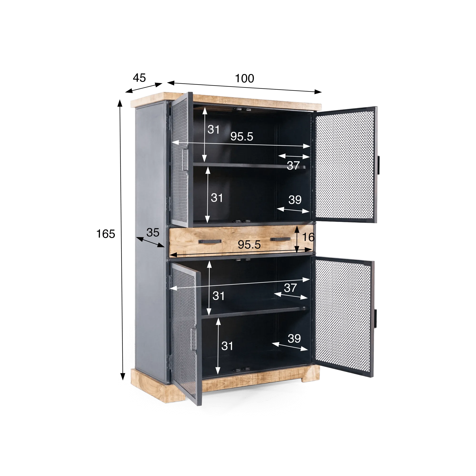 De metalen en houten opbergkast Cambridge valt meteen op door haar imposante maar perfect uitgebalanceerde structuur: 165 cm hoog, met vier compartimenten afgesloten door geperforeerde draaideuren en een ruime centrale lade van 95,5 cm breed en 16 cm hoog. Deze indeling is bedacht om veelzijdige opbergruimte te bieden — geschikt voor servies, huishoudlinnen, documenten of decoratieve objecten. Elke nis, 31 cm hoog en 37 tot 39 cm diep afhankelijk van het niveau, biedt een praktische en toegankelijke ruimte die elke centimeter van dit strak vormgegeven meubelstuk optimaliseert.