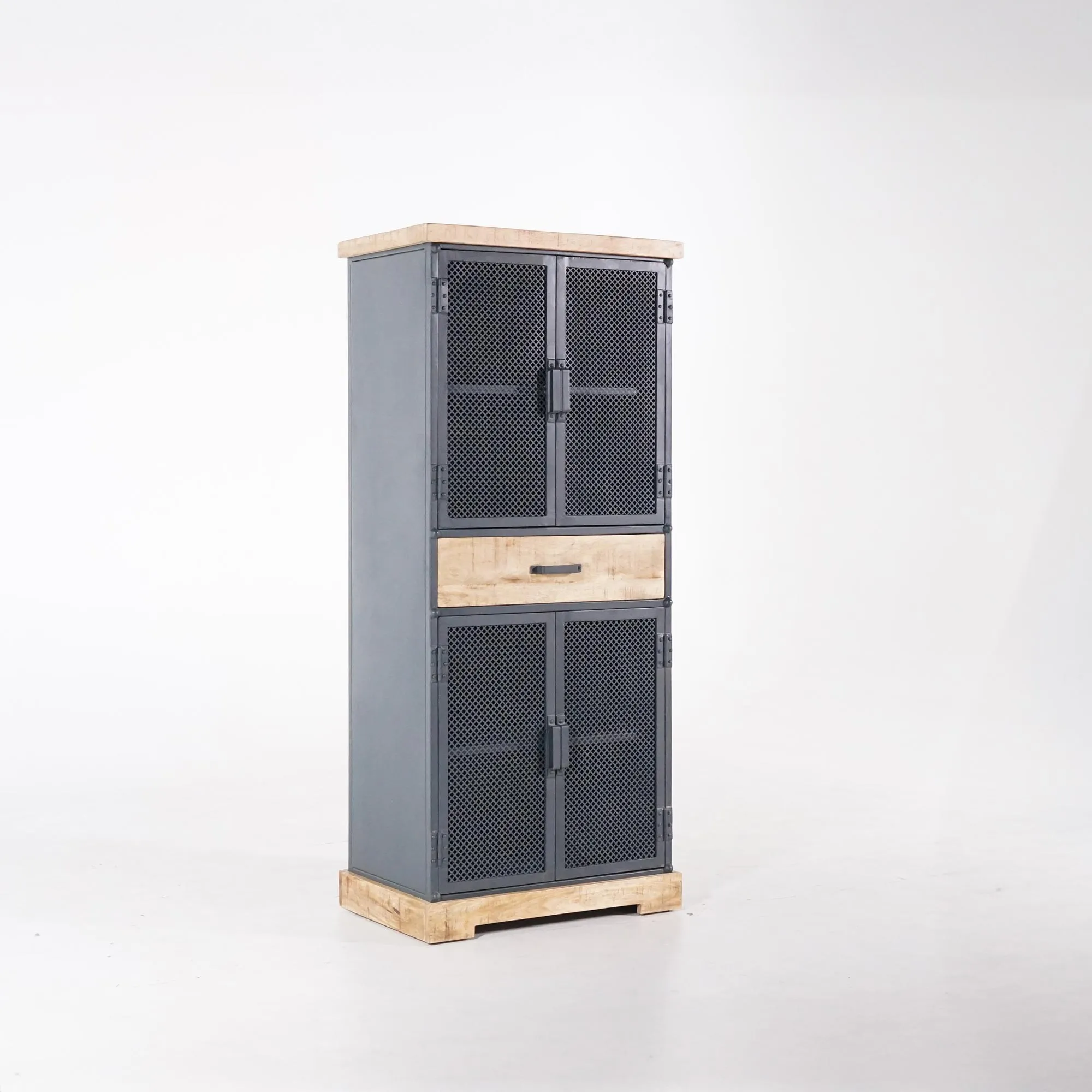 We kozen ervoor om het contrast tussen de metalen structuur en de oppervlakken in massief mangohout van deze metalen en houten opbergkast te verzachten met sobere en verfijnde afwerkingen. De metalen klinkhandgrepen, de ruwe houten basis en de subtiel afgeronde hoeken weerspiegelen onze aandacht voor kwaliteit en esthetische samenhang. Elk detail is ontworpen om dit meubel functioneel, robuust en tijdloos te maken.
