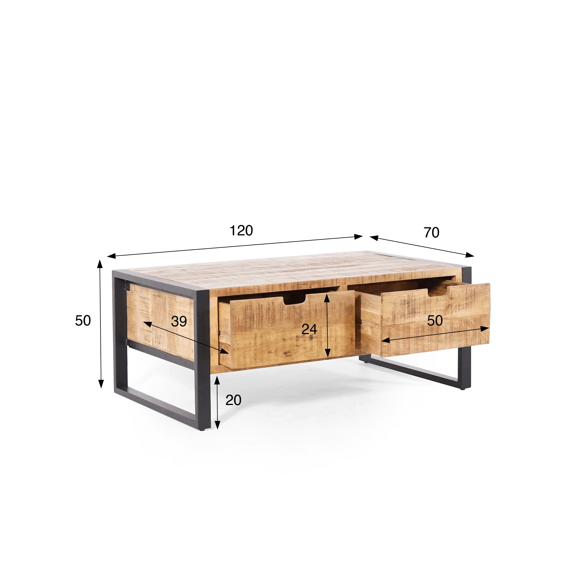 De salontafel in massief mangohout Kansas biedt een royale oppervlakte van 120 × 70 cm, comfortabel voor gedeelde momenten en ideaal voor dagelijkse voorwerpen. Onder het blad integreerden we twee ruime lades zodat alles binnen handbereik blijft: ze zijn elk 39 cm diep en 24 cm hoog, perfect om magazines, lichte plaids, accessoires of afstandsbedieningen in op te bergen. De opening met een discrete uitsparing, zonder handgreep, draagt bij aan het eenvoudige ontwerp en zorgt tegelijk voor een intuïtieve grip.