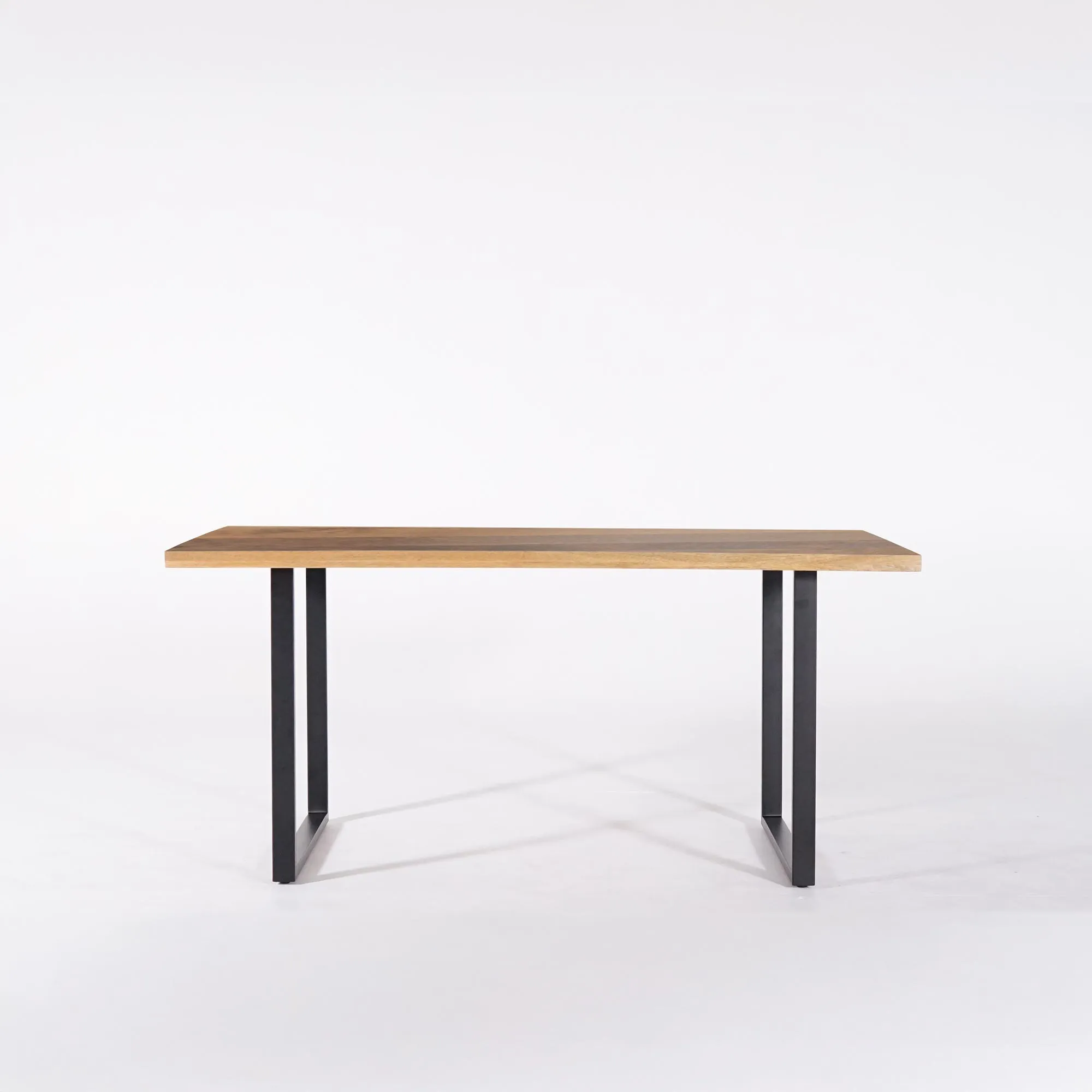 De zwarte metalen poten van deze eettafel in massief mangohout en metaal geven het geheel een grafische en stabiele uitstraling. Hun strakke vorm, licht teruggeplaatst ten opzichte van het blad, creëert extra beenruimte en vergemakkelijkt de circulatie rond de tafel. De combinatie van mangohout en metaal zorgt voor een subtiel contrast, typerend voor de industriële stijl, maar tegelijk sober genoeg om te passen in zowel een hedendaags interieur als een warm ingerichte eetkamer.