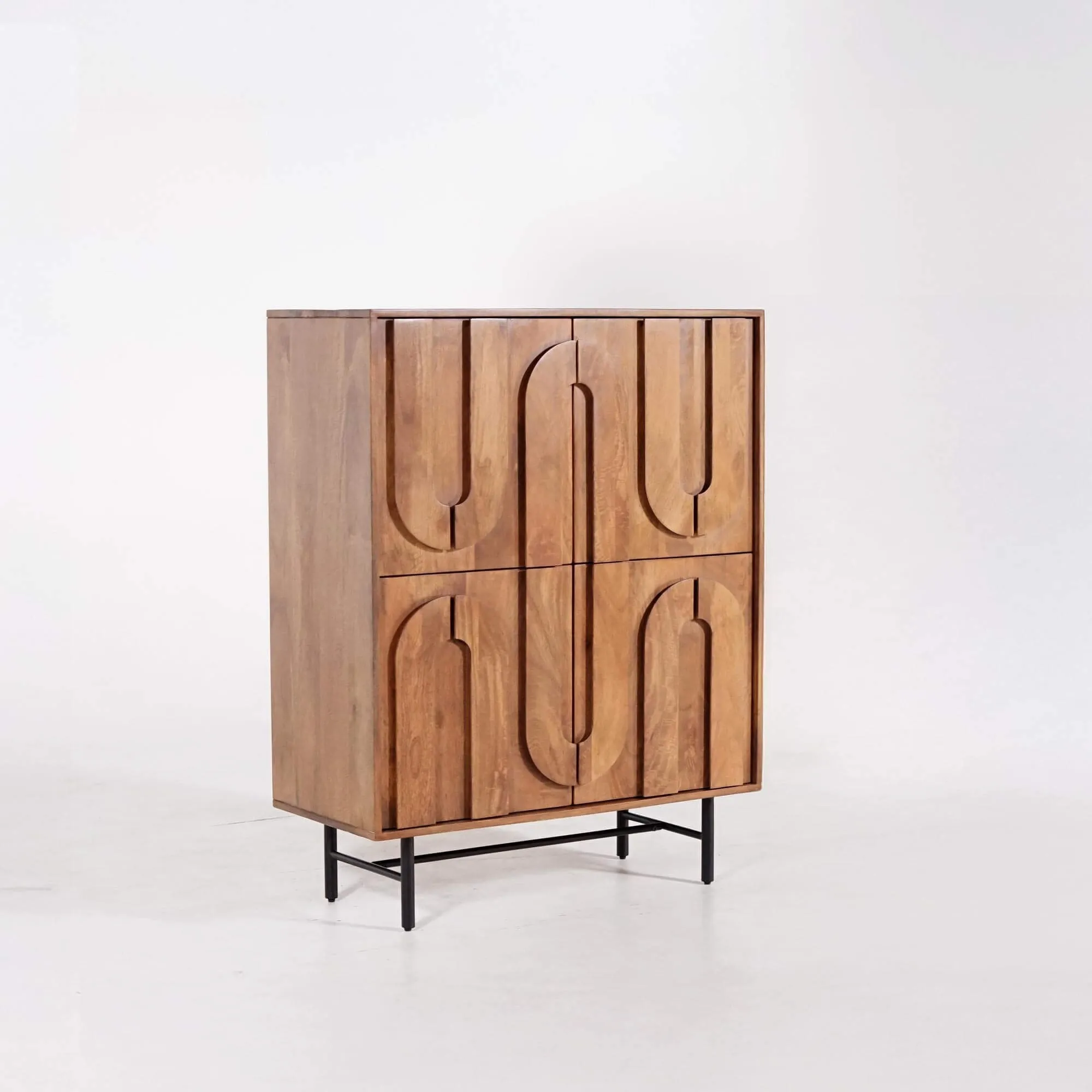 Gemaakt van massief mangohout, is elk paneel zorgvuldig gevormd, waarbij de rijke en diepe nerf van het hout zichtbaar wordt. Een satijnen afwerking accentueert de natuurlijke warmte van het materiaal. Mangohout, bekend om zijn dichtheid en duurzaamheid, geeft dit massief houten barkmeubel een opmerkelijke stevigheid, terwijl het aangenaam zacht aanvoelt. Het geheel rust op een zwarte metalen structuur die het meubel optilt en een eigentijdse toets toevoegt aan zijn warme uitstraling.
