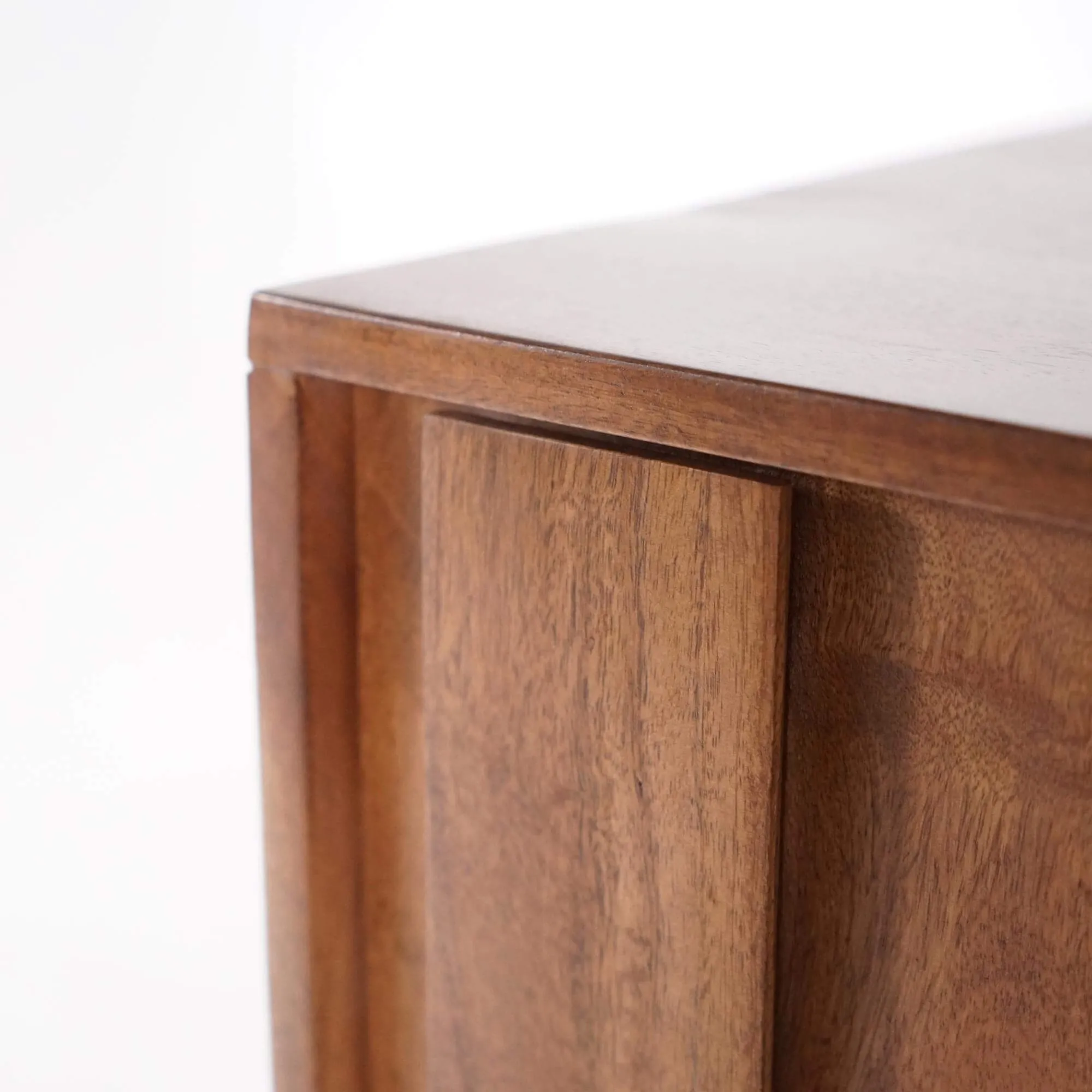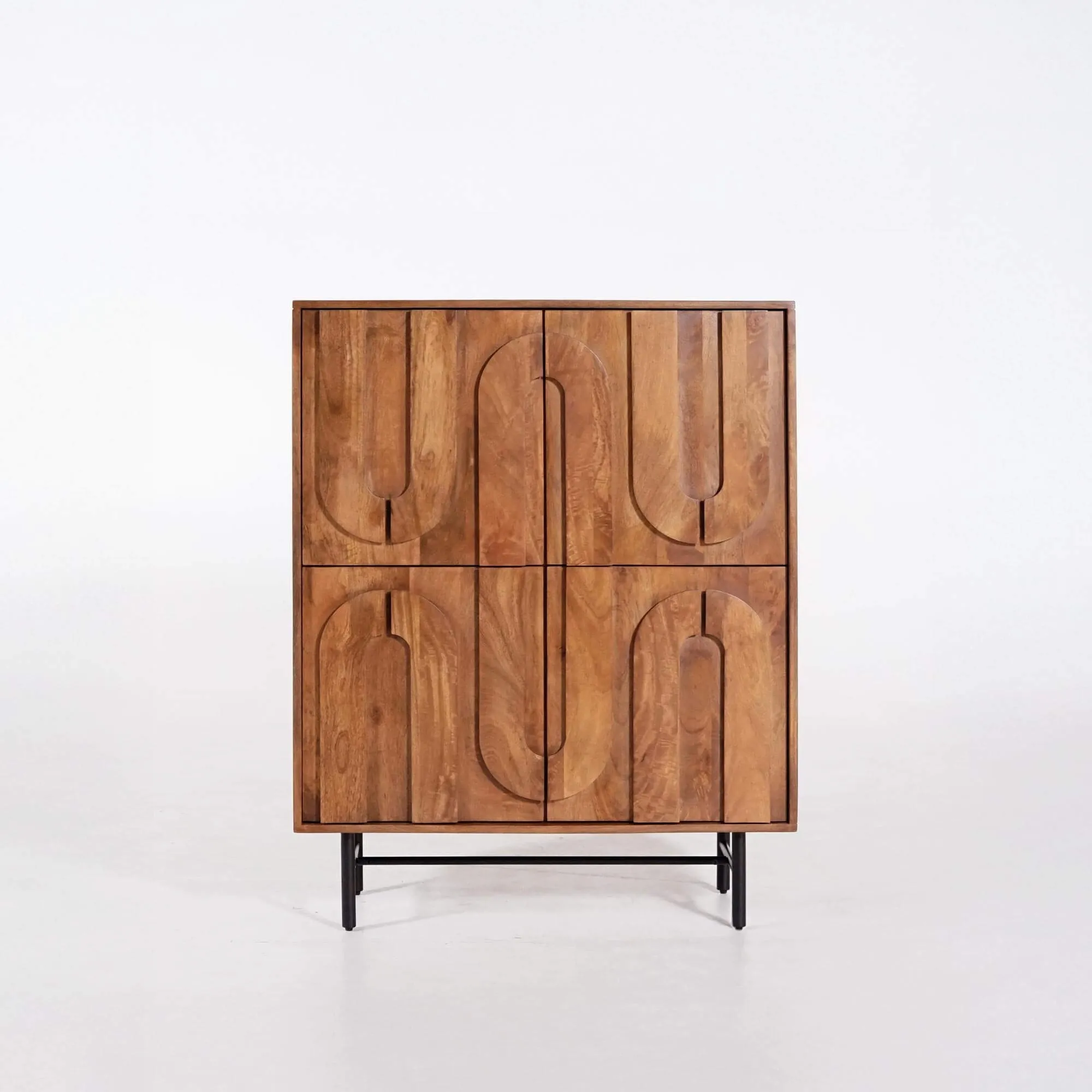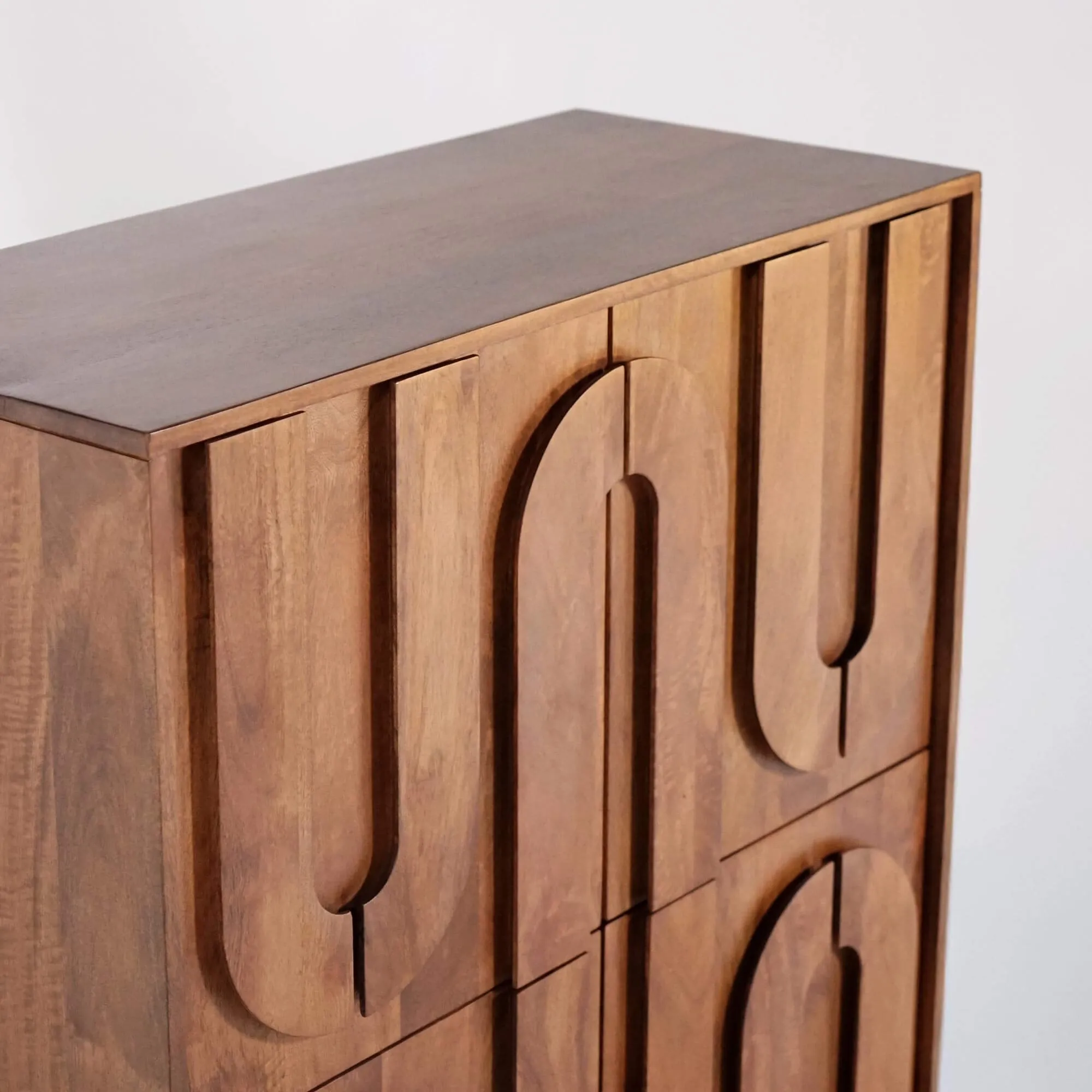 Onze designers ontwierpen het massief houten barkmeubel Flow als een sculpturaal stuk dat functionaliteit en esthetiek combineert. Het unieke ontwerp, met geometrische reliëfs die rechtstreeks in het hout zijn gesneden, doet denken aan een ambachtelijk kunstwerk op het kruispunt van modern design en etnische inspiratie.