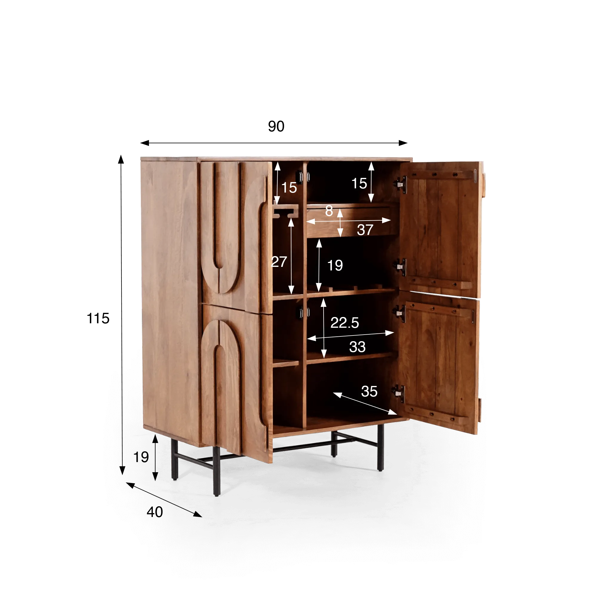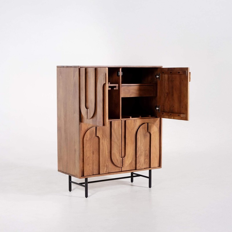 Achter de vier draaideuren onthult het massief houten barkmeubel Flow een interieur dat ontworpen is voor gebruiksgemak: een centrale lade van 37 cm breed voor baraccessoires, compartimenten van 33 cm breed en 42,5 cm diep voor flessen en glazen, evenals een bovenruimte met geïntegreerde glasrekken. Elke zone is ontworpen om de opbergruimte te optimaliseren, zowel voor uw sterke dranken als voor uw favoriete decoratiestukken.