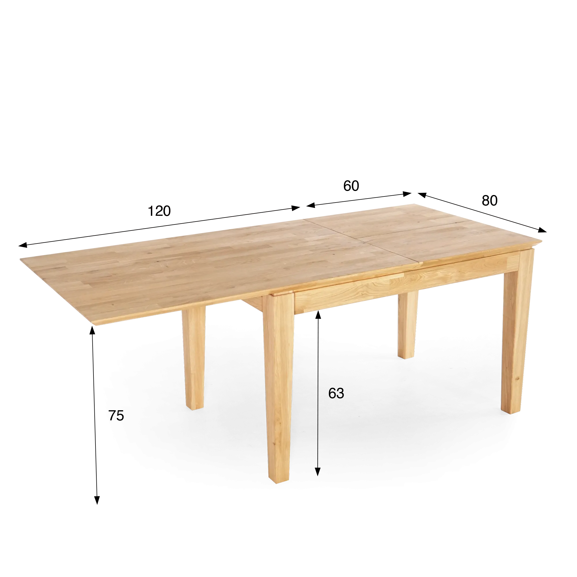 Rechthoekige eettafel in eikenhout 120 x 80 cm met verlengblad van 60 cm
