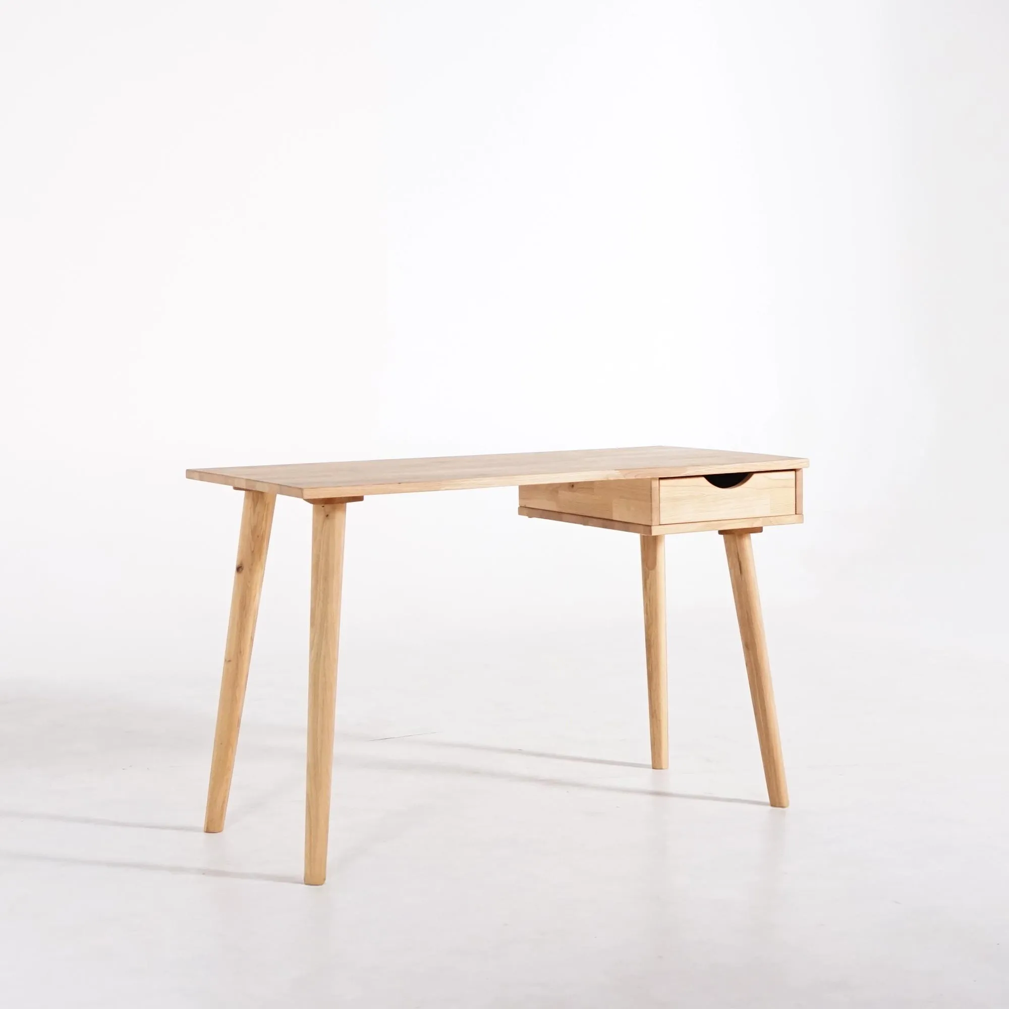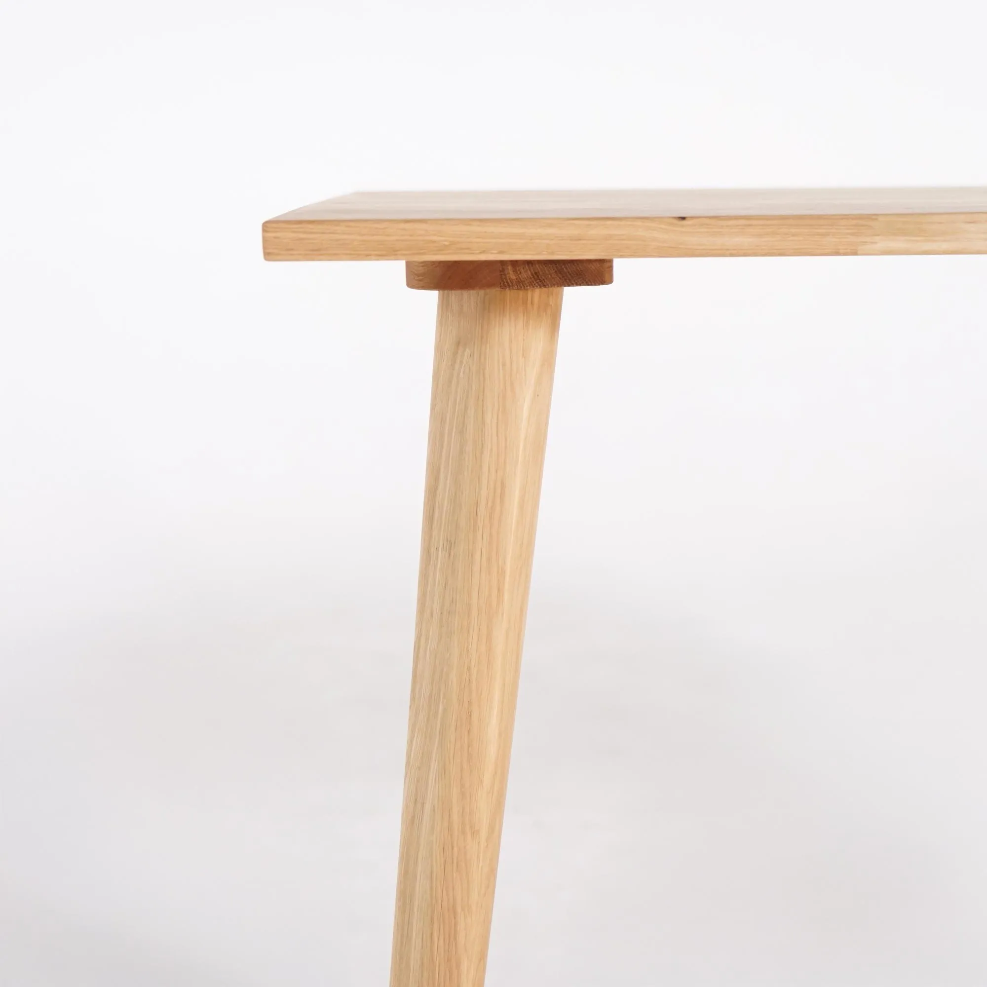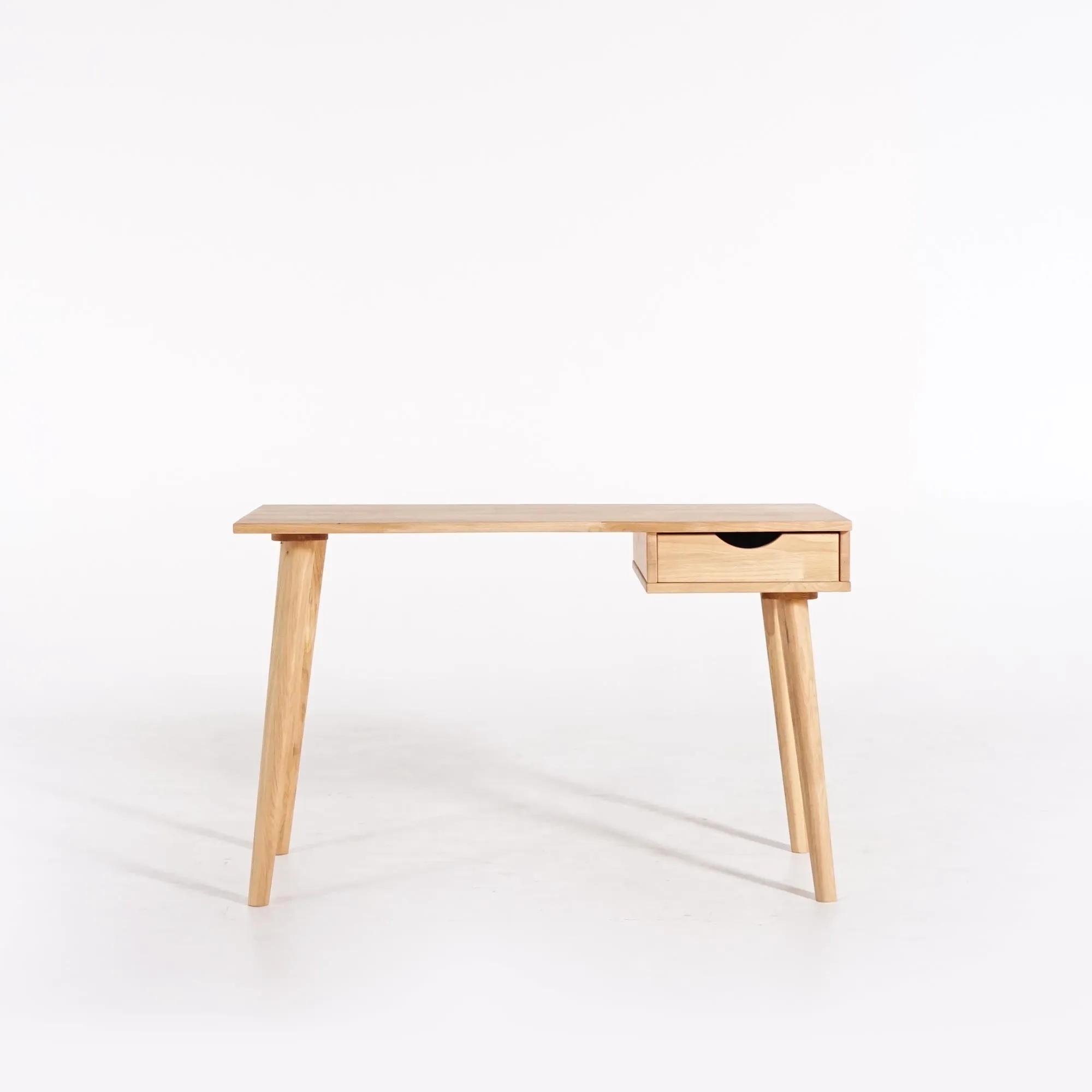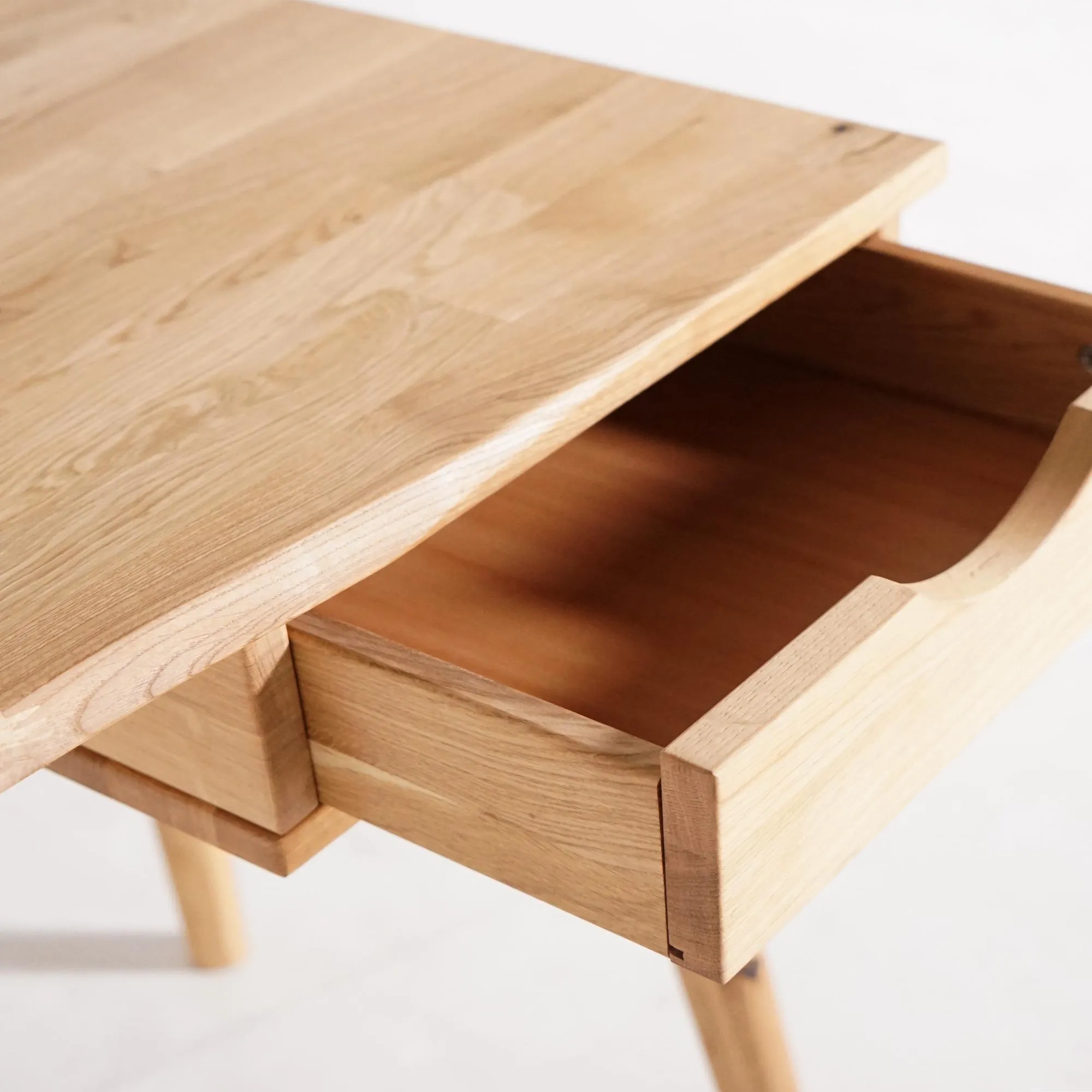 Volledig vervaardigd uit massief eikenhout — verlijmde eiken lamellen voor het blad — benadrukt dit eikenhouten bureau de natuurlijke elegantie van hout: een levend, warm en duurzaam materiaal. Elk blad wordt zorgvuldig geschuurd, elke rand afgerond om het zijdezachte gevoel van het hout te behouden en de fijne nerfstructuur te onthullen. De schuine poten, eenvoudig te monteren, zorgen voor een perfecte stabiliteit en versterken de visuele lichtheid van het geheel.