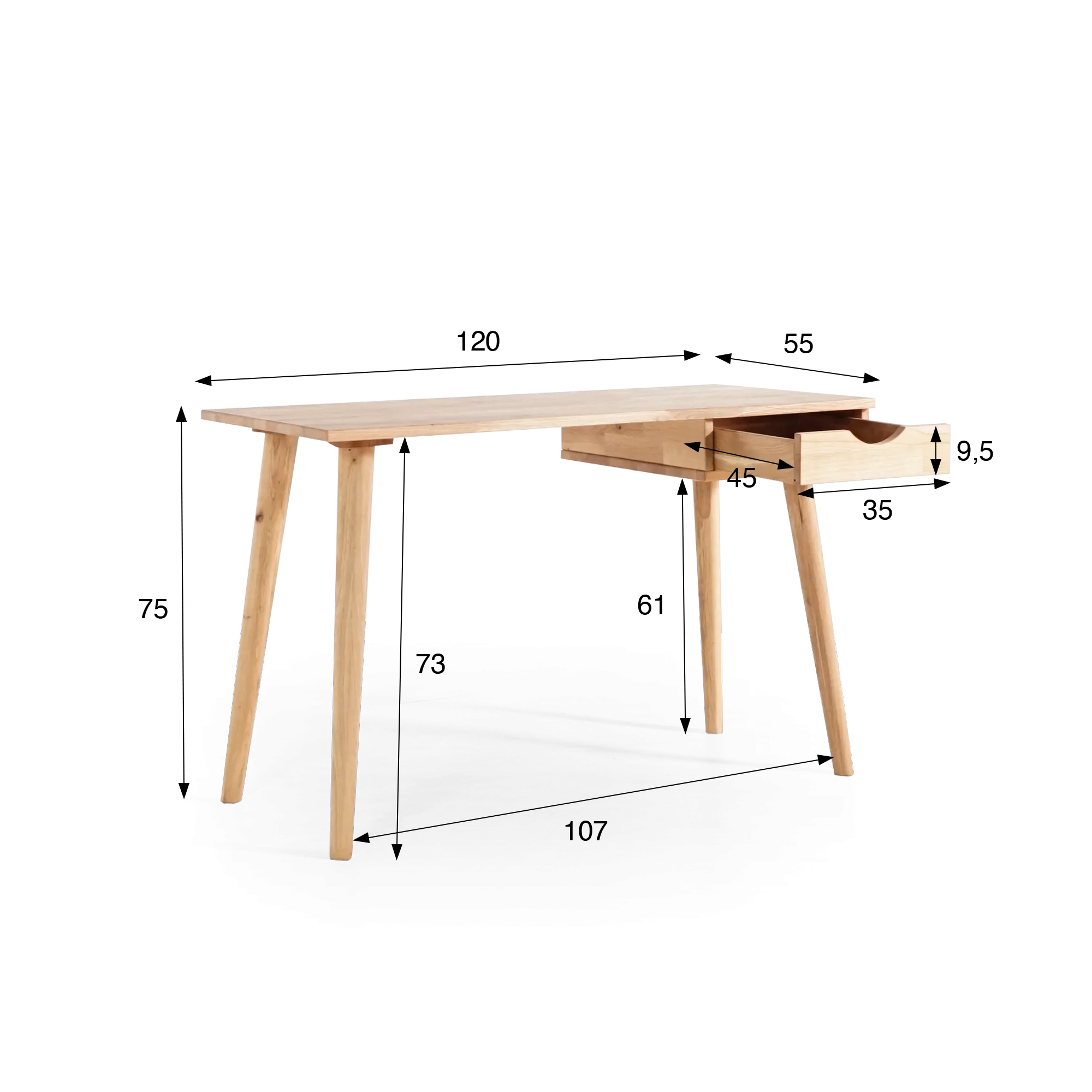 Met zijn 120 cm lengte, 55 cm diepte en 75 cm hoogte biedt dit bureau van eikenhout een comfortabele werkruimte terwijl het zijn luchtige uitstraling behoudt. Het werkblad, licht gebogen ter hoogte van de zithouding, verzacht de positie en bevordert een natuurlijke werkhouding. Dit detail, met de hand afgewerkt, getuigt van onze aandacht voor ergonomie en esthetiek.