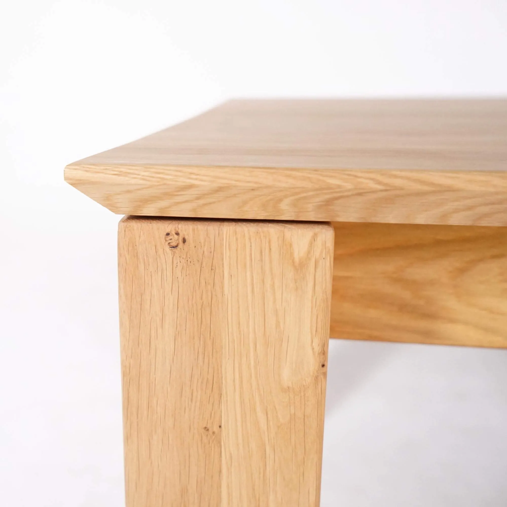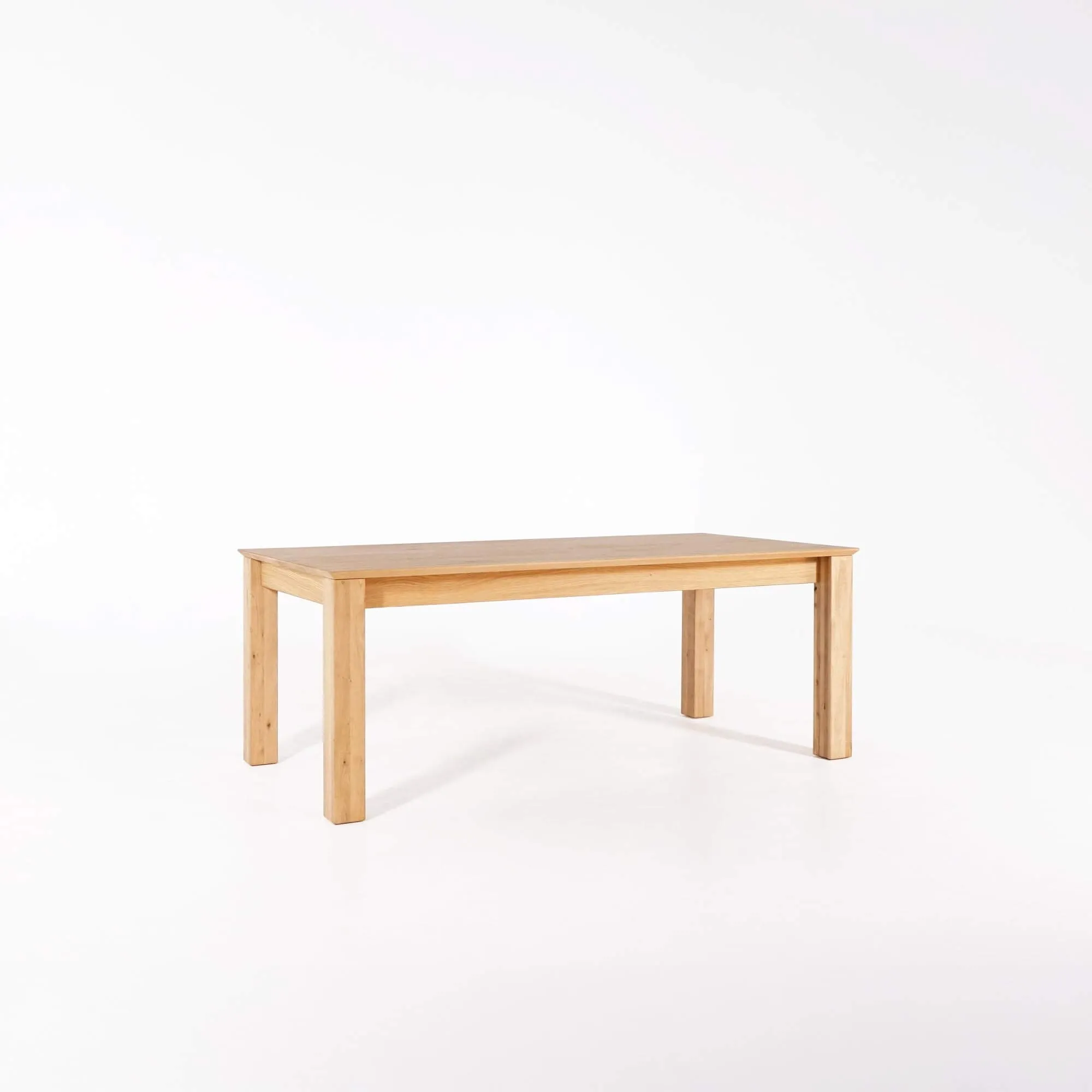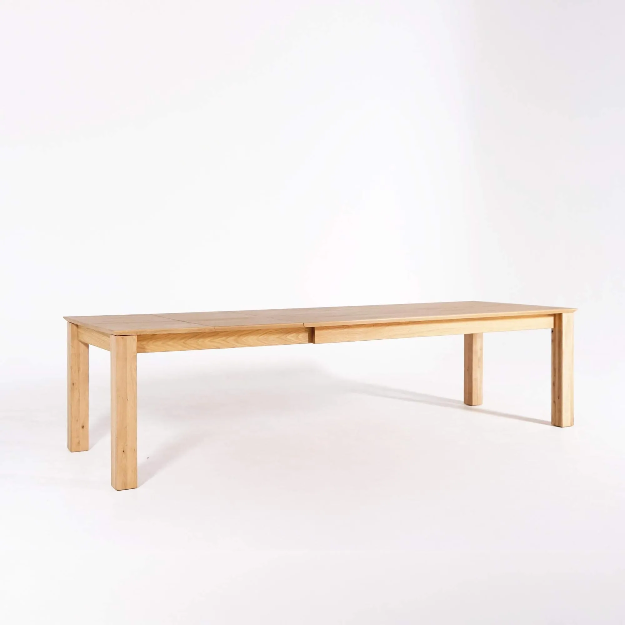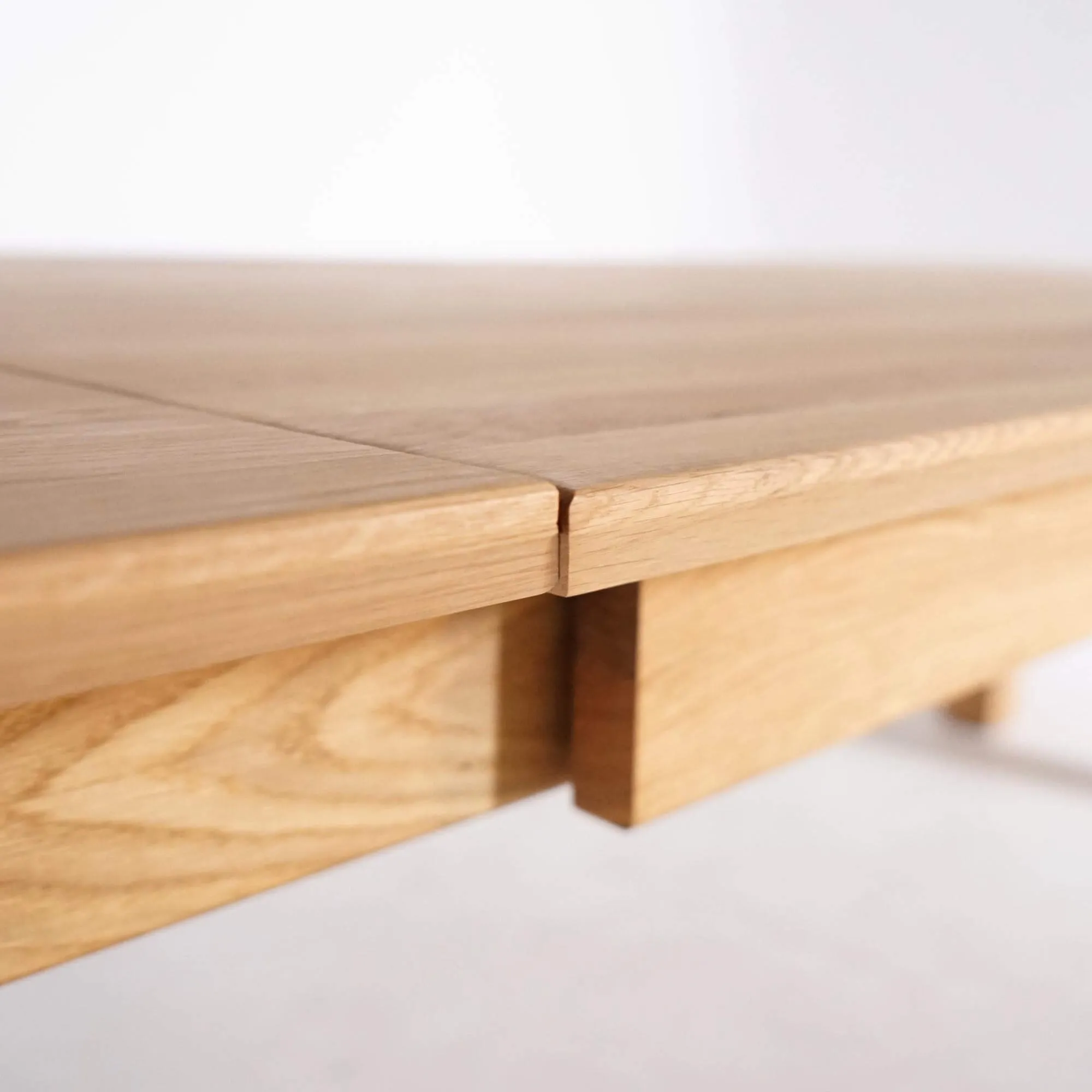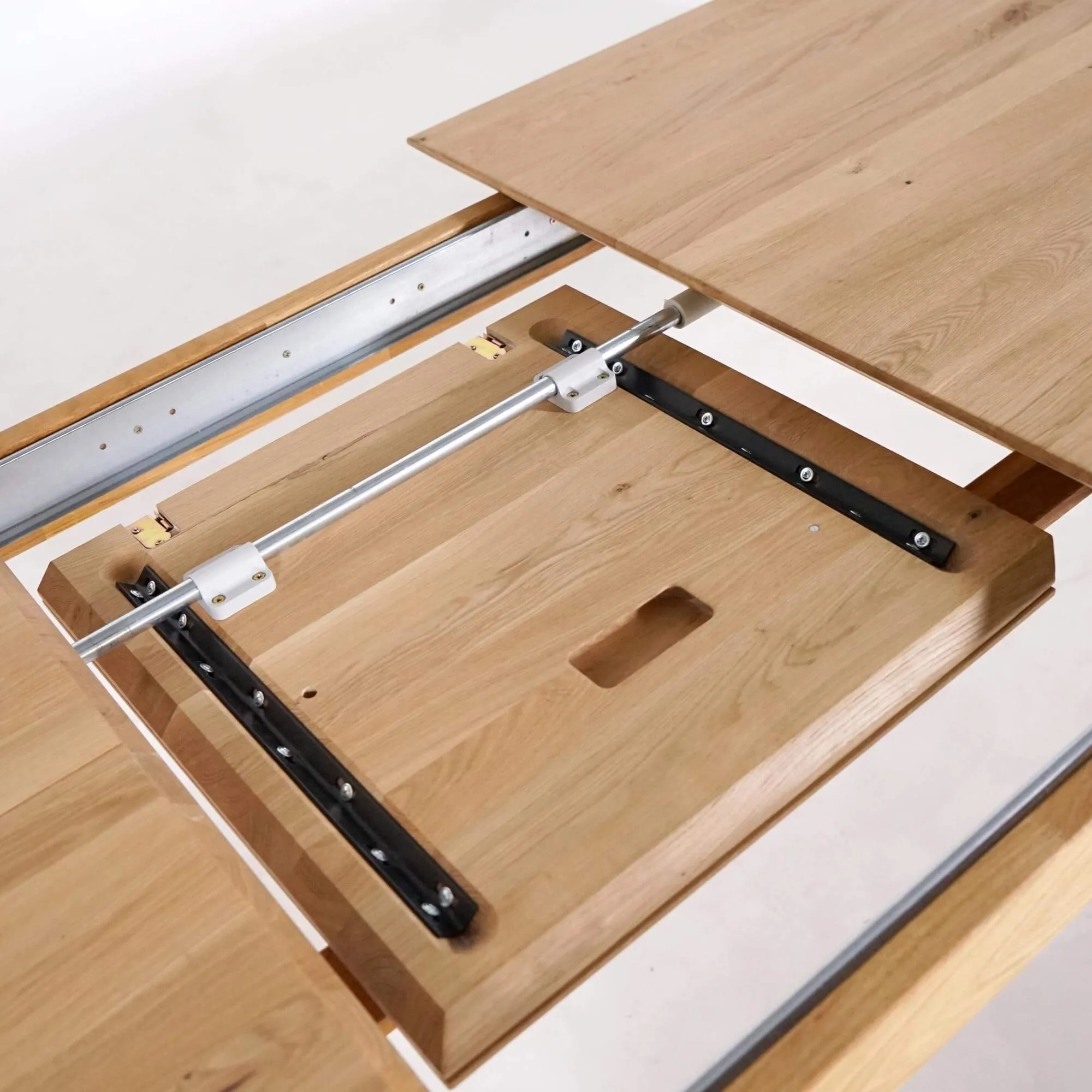 Bij het ontwerp van deze eikenhouten eettafel met verlengstukken hebben we bijzondere aandacht besteed aan het evenwicht tussen stevigheid en lichtheid. De rechte poten in massief eikenhout met een doorsnede van 10 cm zorgen voor perfecte stabiliteit en onderstrepen de geometrische precisie van het design. Het tafelblad van 100 cm breed biedt een ruime en gezellige eethoek, ideaal voor maximaal acht personen in zijn standaardlengte van 200 cm. Dankzij het ingenieuze en discrete verlengsysteem kan deze eikenhouten eettafel worden uitgeschoven tot 300 cm, zodat ze zich gemakkelijk aanpast aan grote gezelschappen of feestelijke diners.
