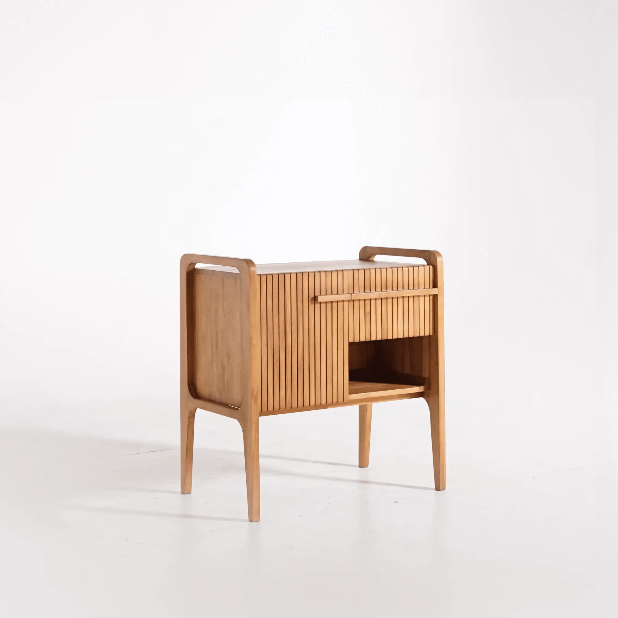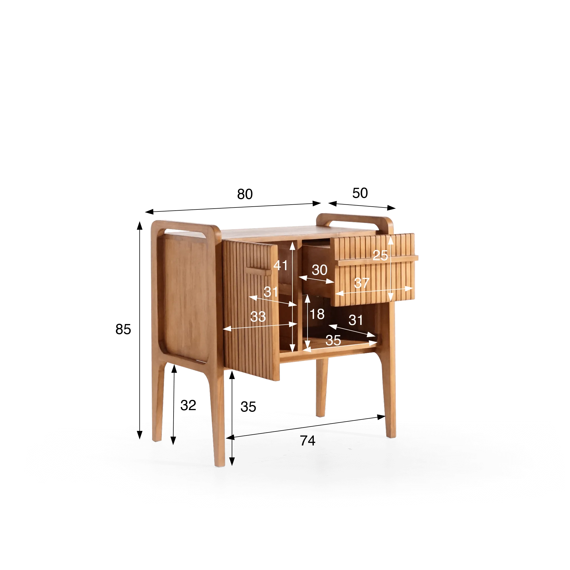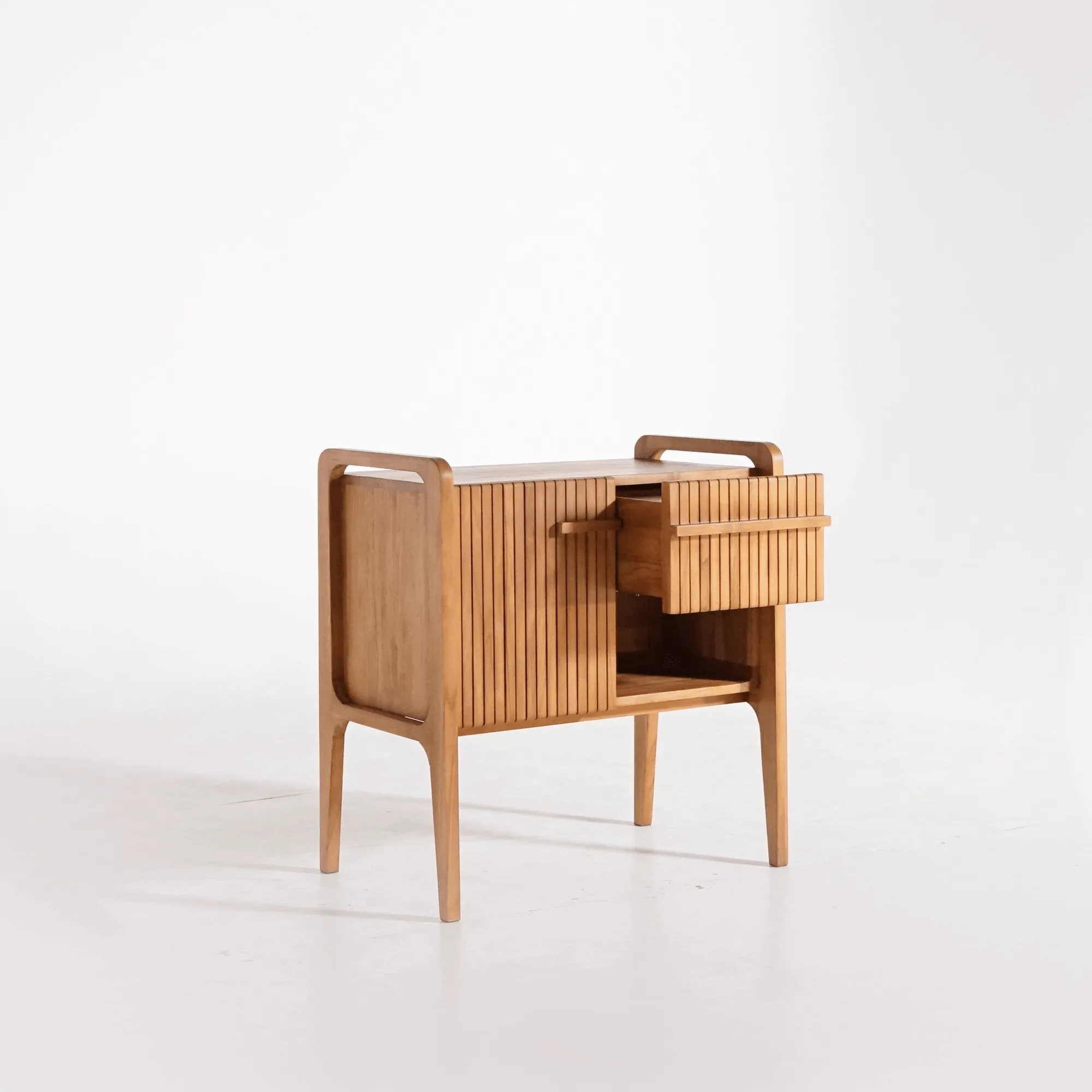 Elk detail van dit massief teakhouten badkamermeubel met enkele waskom werd met uiterste precisie afgewerkt: de randen zijn verzacht, de lijnen afgerond en het front met verticale lamellen doet denken aan gefilterd licht door een houten scherm. Achter deze gestructureerde gevel bevindt zich een deur met softclose-systeem en een lade met soepele geleiders, die een praktische opbergruimte bieden voor alledaagse accessoires. Binnenin biedt een ruimte van 41 cm hoog en 31 cm diep voldoende plaats voor handdoeken of verzorgingsproducten, terwijl de lade van 37 cm breed en 25 cm hoog ideaal is voor kleinere voorwerpen.