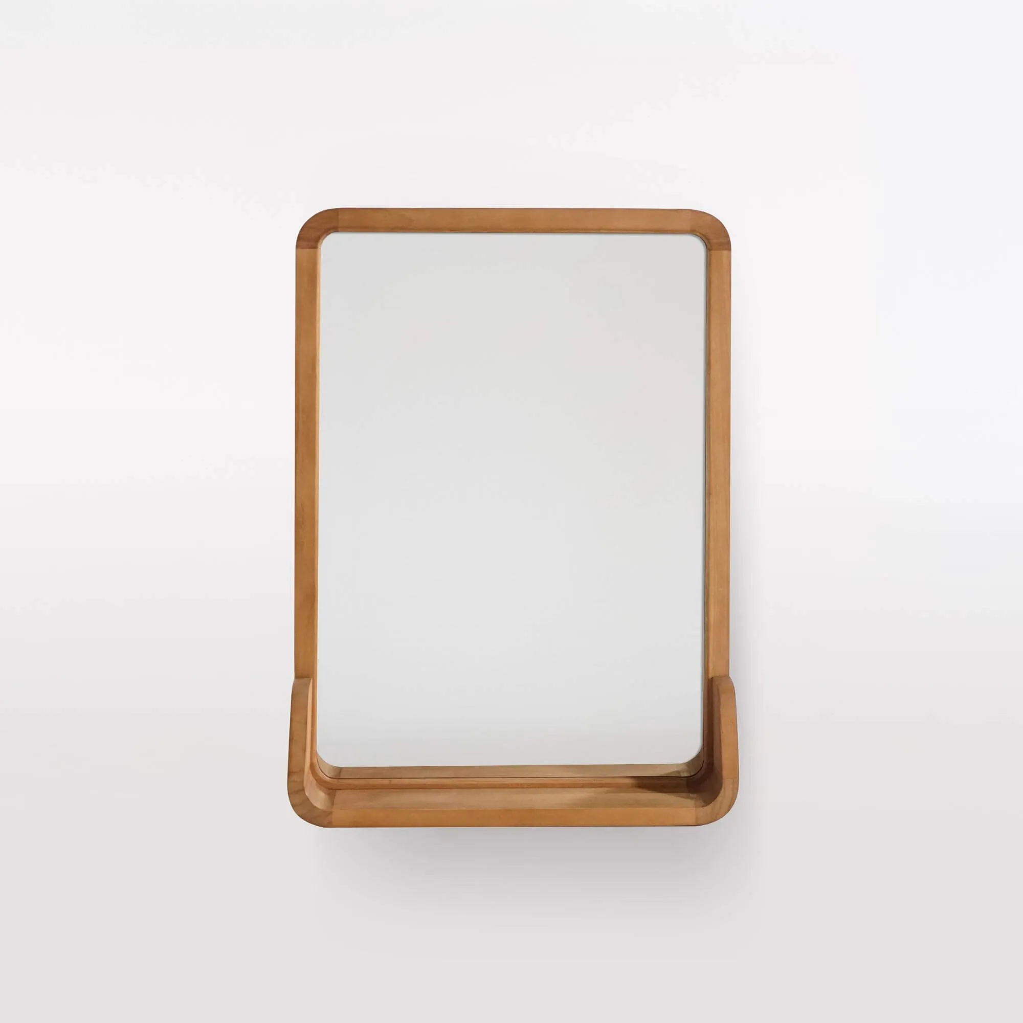 We wilden dat deze rechthoekige spiegel in teakhout met legplank niet enkel een functioneel object zou zijn, maar een stuk met karakter, dat de badkamer verlicht en tegelijk een vleugje zachtheid toevoegt. Opgehangen tegenover natuurlijk licht vergroot hij visueel de ruimte en versterkt hij het gevoel van helderheid en rust.